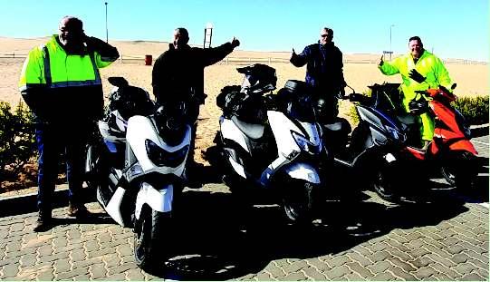 After a gruelling cross-border journey of more than 2 000 km on scooters affectionately known as poegies, a brave group of five South African adventurers rolled into Langstrand on Thursday this week, just one stop short of their firsthalfoftheirjourney,HentiesBay
