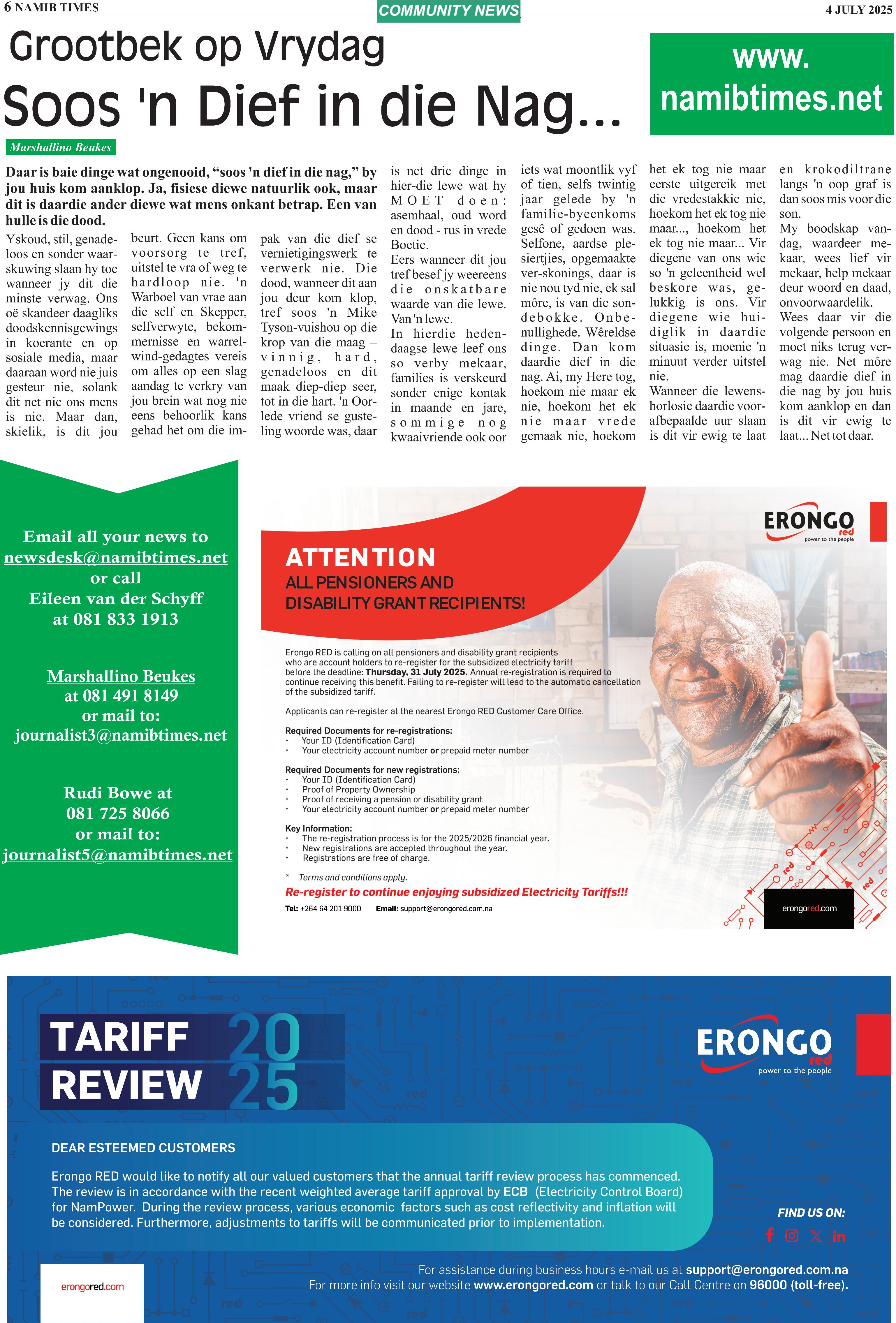 Rehoboth, Windhoek, Okahandja, Karibib, Usakos, Arandis, Swakopmund and Walvis Bay before the final leg to Henties Bay before embarkingontheirsecondhalfofthejourneyback to South Africa. The route back will take them from Henties Bay, Windhoek, Keetmanshoop, Springbok and finally Gansbaai. The team remains in high spirits, fuelled by community support and generous contributions from donors. Supporters can get involved by sponsoring a rider per kilometre - whether it's R1/km (R4 000 total), 50c/km (R2 000), or any other amount. One-time donations are also welcomed. Funds will go directly toward Ikamva Youth's programmes and needs, with all costs and spending discussed transparently with donors. Official confirmation letters will be provided by Ikamva and Elim Home Namib Times proudly salutes these determinedmen.