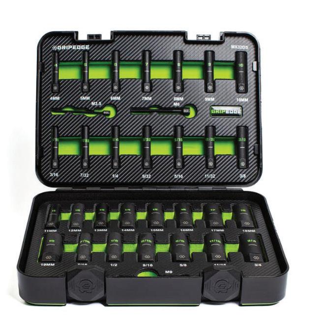 The GripEdge Tools 32-pc G-FORS ¼” & 3 8” Deep Socket Extractor Set, No. MX32DS, feature the company’s patented non-tapered, bidirectional geometry that delivers fulllength grip for maximum extraction power on seized and damaged fasteners. Constructed from high-strength chromemolybdenum steel with a premium corrosion-resistant coating, each socket is impact-rated and engineered for both removal and reinstallation.