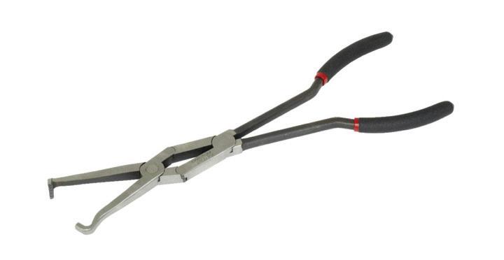 The Lisle Corporation Long-Reach Electrical Disconnect Pliers, No. 37970, feature a compound joint handle design and its 13-½” tool length provides additional reach for connectors in hard-to-reach spots. These pliers are designed to easily remove locking push tab style electrical connectors found on mass air flow sensors, fuel injectors, ingition coils, and other applications. Use the hook at the end of the pliers to pull up on the tab to unlock and then use the point to engage the tab. Squeeze the tabs together and lift to separate from connectors without damage. Dual material grips for comfort.