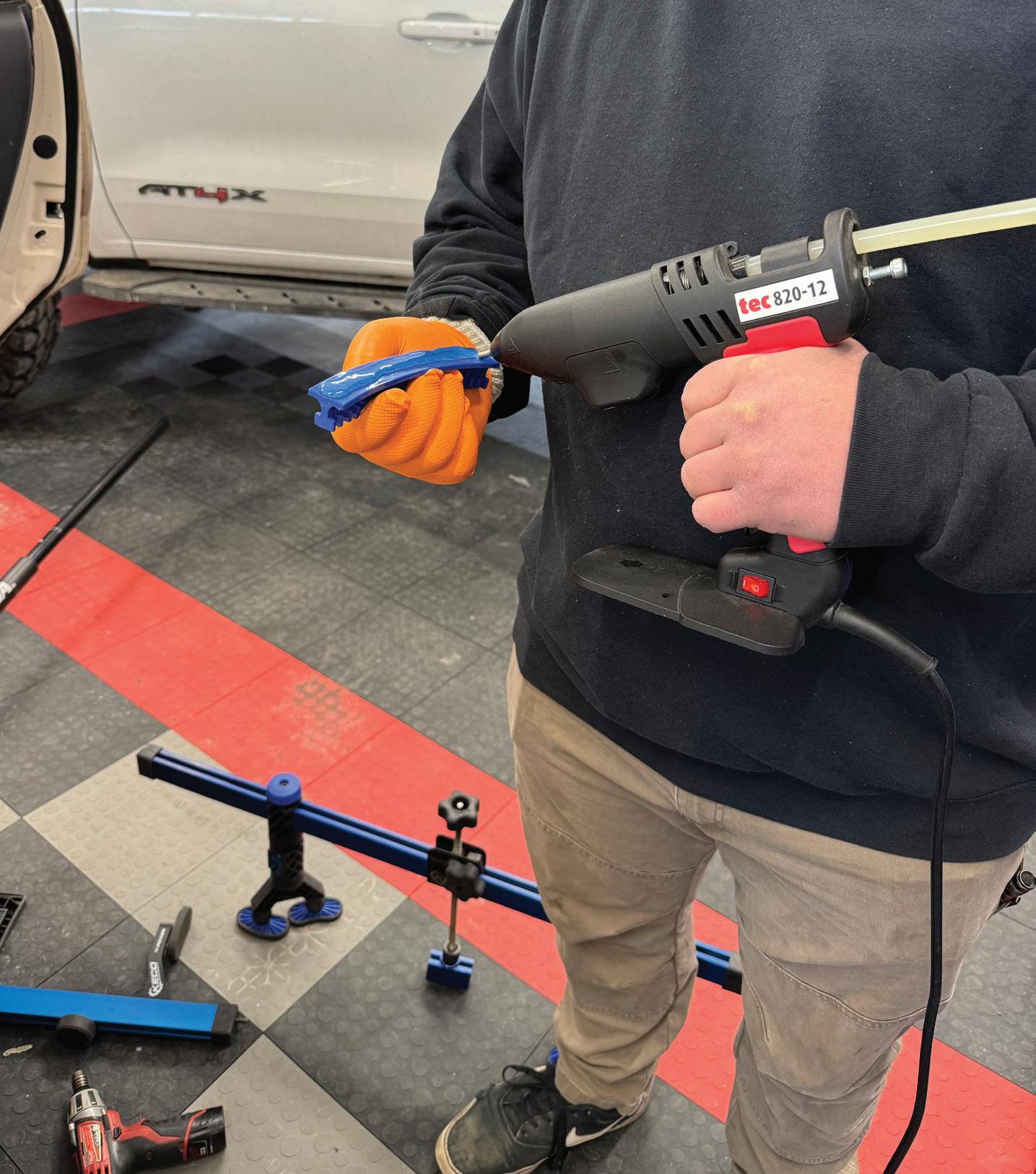 hot-melt glues designed to withstand extreme pulling force while remaining flexible enough to conform to the panel as the dent moves. They also absorb vibration under tension, while allowing you to strike the panel to knock down crowns and high spots.