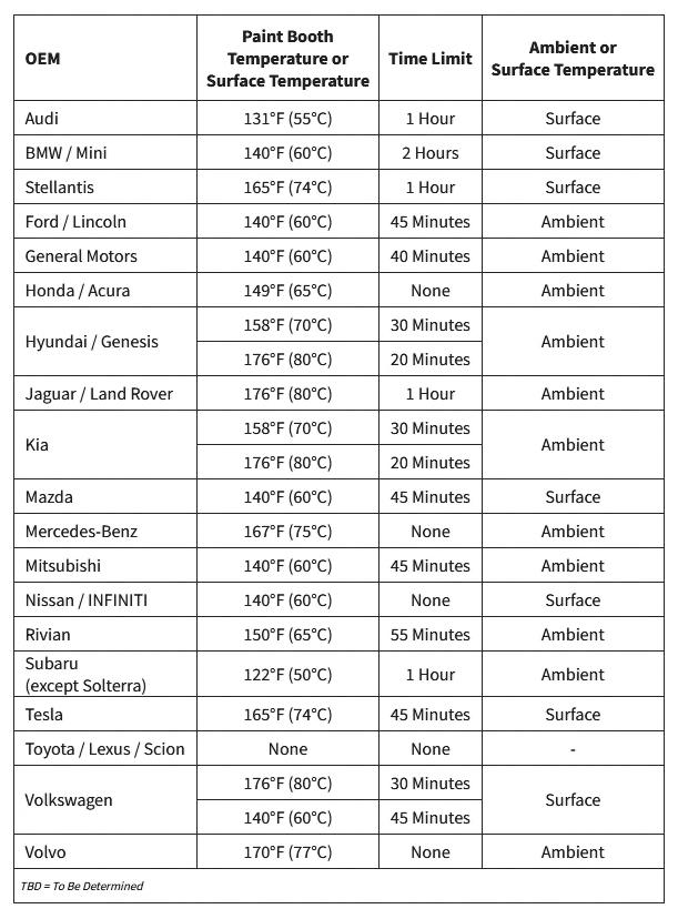 As professionals committed to safety for themselves, their teams, and their customers, it should be well understood that most manufacturers specify booth baking temperatures and time limits. Most vehicle makers clearly identify specific requirements. Some will say “no baking at all.” A typical temperature is around 140 degrees, but OEMs do vary. Always check OEM require ments to confirm whether baking is allowed, the required temperature, and the time limit. These details can change from month to month and may even vary by model. For ex ample, a procedure may call for 140 degrees for 40 minutes or less, and the next time you repair that same model, the re quirement may have changed. Check every time. Some paint