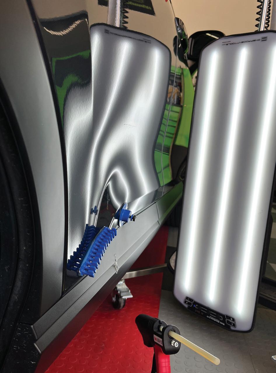 Begin pulling the lows. As long as the low is moving, continue applying pressure. When you feel or see resistance, begin knocking down crowns or high spots. Alternate between pulling and knocking down until you’ve maximized the movement. Release tabs using 99% isopropyl alcohol. Clean the panel and reassess the damage.