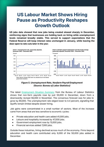 Figure 5. Unemployment Rate, Nonfarm Payroll Employment Source: Bureau of Labor Statistics) The latest Employment Situation Summary from the Bureau of Labour Statistics shows that non-farm payrolls rose by just 50,000 in December, down from a downwardly revised 56,000 in November. The consensus forecast was for jobs to grow by 60,000. The unemployment rate edged lower to 4.4 percent, signalling that layoffs remain limited despite slower hiring. Job gains were concentrated in a small number of sectors. Most of the increase came from areas that are less sensitive to economic cycles: ● ● ● ●