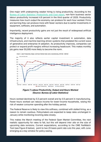 Figure 7. Labour Productivity, Output and Hours Worked Source: Bureau of Labor Statistics) Hours worked declined by 0.3 percent overall and by 0.5 percent in manufacturing. Fewer hours worked can reduce income for lower-income households, raising the risk of weaker consumer spending after the holiday period. The Federal Reserve is likely to view this softness, combined with stalled hiring, as a reason to remain cautious. Policymakers are expected to keep rates unchanged in January while monitoring incoming data closely. This makes the March meeting of the Federal Open Market Committee, the next realistic opportunity for rates to fall, but this will depend inter alia on the size of upcoming data revisions. Current expectations, according to the CME FedWatch Tool (see Figure 8 below), point to two 25 basis-point rate cuts this year, with June emerging as a key window for policy easing.