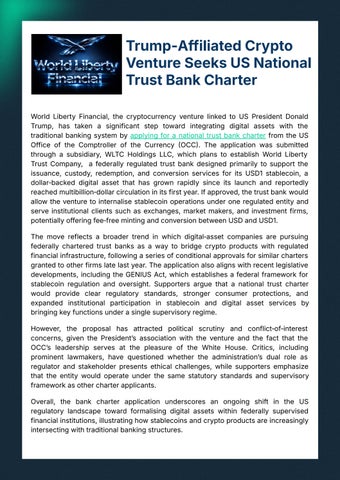 Trump‑Affiliated Crypto Venture Seeks US National Trust Bank Charter World Liberty Financial, the cryptocurrency venture linked to US President Donald Trump, has taken a significant step toward integrating digital assets with the traditional banking system by applying for a national trust bank charter from the US Office of the Comptroller of the Currency OCC. The application was submitted through a subsidiary, WLTC Holdings LLC, which plans to establish World Liberty Trust Company, a federally regulated trust bank designed primarily to support the issuance, custody, redemption, and conversion services for its USD1 stablecoin, a dollar‑backed digital asset that has grown rapidly since its launch and reportedly reached multibillion‑dollar circulation in its first year. If approved, the trust bank would allow the venture to internalise stablecoin operations under one regulated entity and serve institutional clients such as exchanges, market makers, and investment firms, potentially offering fee‑free minting and conversion between USD and USD1. The move reflects a broader trend in which digital‑asset companies are pursuing federally chartered trust banks as a way to bridge crypto products with regulated financial infrastructure, following a series of conditional approvals for similar charters granted to other firms late last year. The application also aligns with recent legislative developments, including the GENIUS Act, which establishes a federal framework for stablecoin regulation and oversight. Supporters argue that a national trust charter would provide clear regulatory standards, stronger consumer protections, and expanded institutional participation in stablecoin and digital asset services by bringing key functions under a single supervisory regime. However, the proposal has attracted political scrutiny and conflict‑of‑interest concerns, given the Presidentʼs association with the venture and the fact that the OCCʼs leadership serves at the pleasure of the White House. Critics, including prominent lawmakers, have questioned whether the administrationʼs dual role as regulator and stakeholder presents ethical challenges, while supporters emphasize that the entity would operate under the same statutory standards and supervisory framework as other charter applicants. Overall, the bank charter application underscores an ongoing shift in the US regulatory landscape toward formalising digital assets within federally supervised financial institutions, illustrating how stablecoins and crypto products are increasingly intersecting with traditional banking structures.