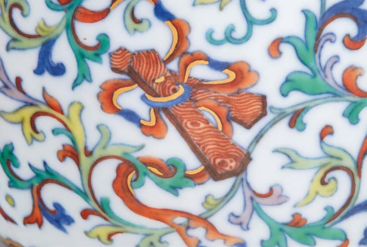 The minor bands on the current vase are also of interest. In place of the more common plantain leaves, the current vase has a band of overlapping ruyi heads around the lower part of the body. Above the major ‘four seasons’ scroll, is a contrasting, elaborate, knobbed scroll, above which is a band of squared spirals. The decorative band under the mouth rim is also relatively unusual, but visually effective. It comprises a standing cloud collar, which is embellished with tiny floral motifs. All these minor bands provide a complementary contrast to the main ‘four seasons’ scroll, and to each other.