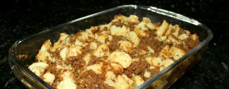 Finalizar: coloque o nhoque em um refratário ou prato. Despeje o molho de carne por cima. Se quiser, finalize com queijo ralado. Sirva quente.