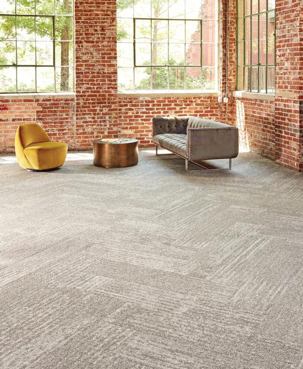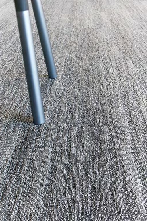 Removing old ceramic tile and broadloom, designers installed a vivid combination of carpet tile and luxury vinyl tile in clean, modern neutral tones of gray, black, and white.