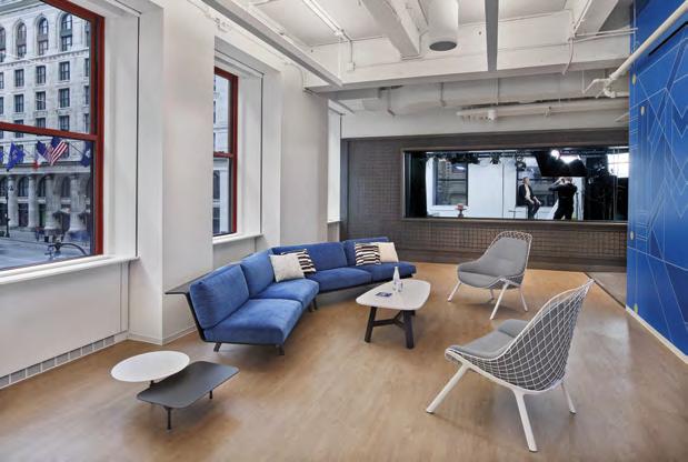 WHEN M MOSER ASSOCIATES TOOK ON THE EXTENSIVE RENOVATION OF THE THIRD STORY OF THE EMPIRE STATE BUILDING FOR LINKEDIN’S NEW OFFICE SPACE, THEY FACED SIGNIFICANT FLOORING CHALLENGES. DIRECTLY BELOW THE SPACE IS THE FAMED DOUBLE HEIGHT LOBBY ENTRANCE WITH A LANDMARKED GOLD LEAF CEILING. WITH THE AREA ABOVE DESIGNATED AS A NO-FLY ZONE, THE ORIGINAL FLOOR NEEDED TO REMAIN INTACT. THE DESIGNERS ELEVATED THE FLOOR AND CHOSE MIXED MATERIALS’ PLANX LVT TO SOLVE THIS CHALLENGE AND PLAY UP THE HISTORIC GLAMOUR OF THE BUILDING.