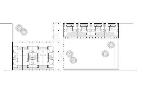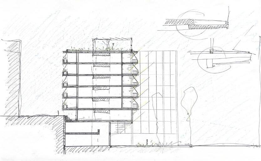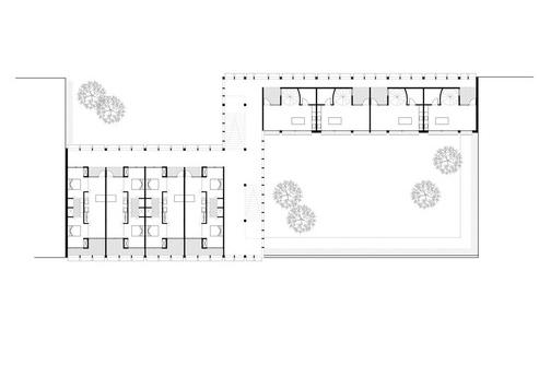 El edificio se estructura en dos bloques longitudinales que se desarrollan a ambos lados del solar, conectados por un núcleo central común. Este núcleo actúa no solo como elemento de circulación vertical, sino también como espacio relacional y articulador del conjunto.