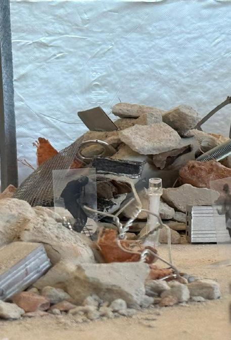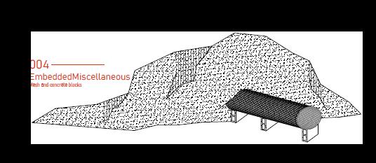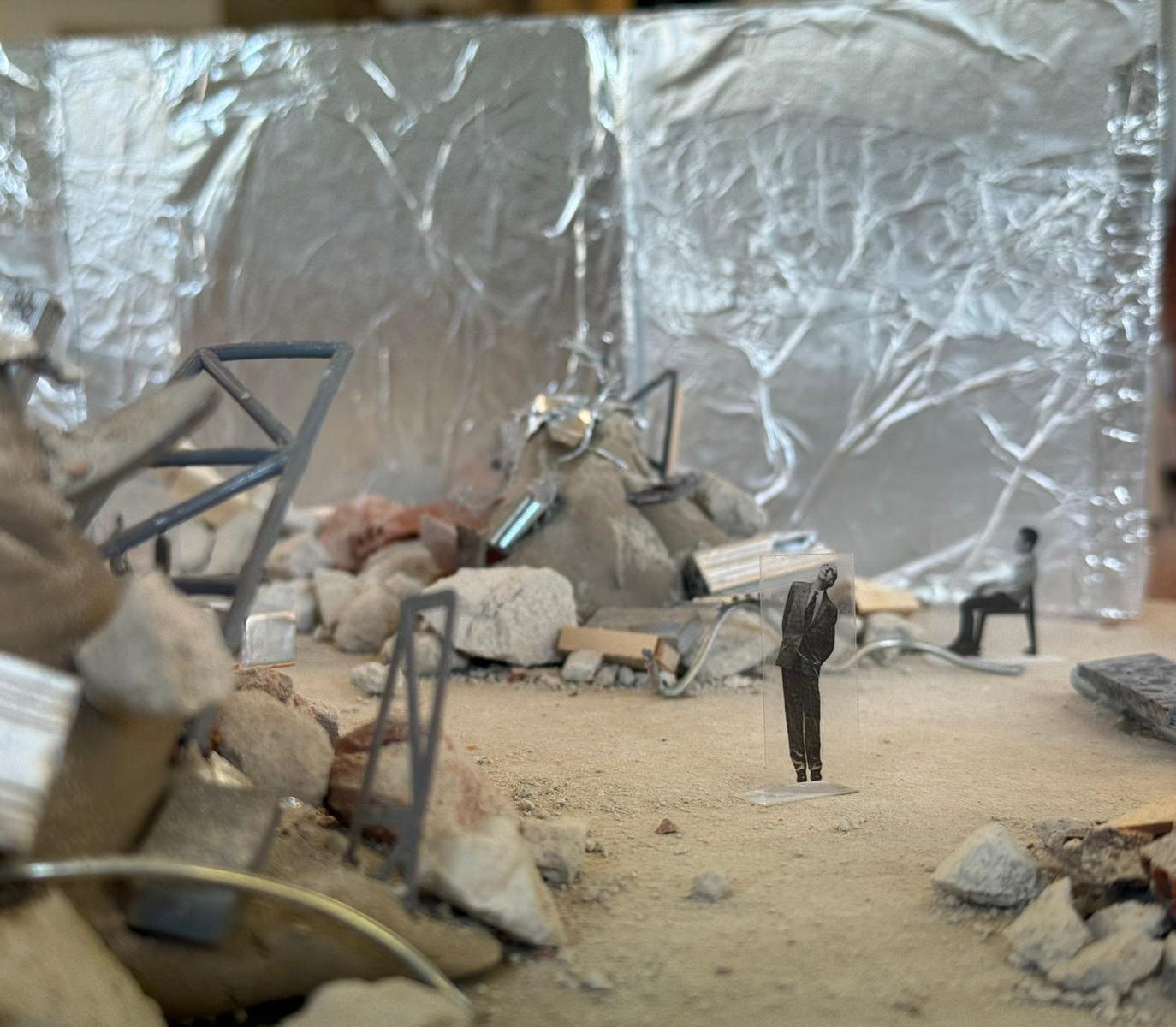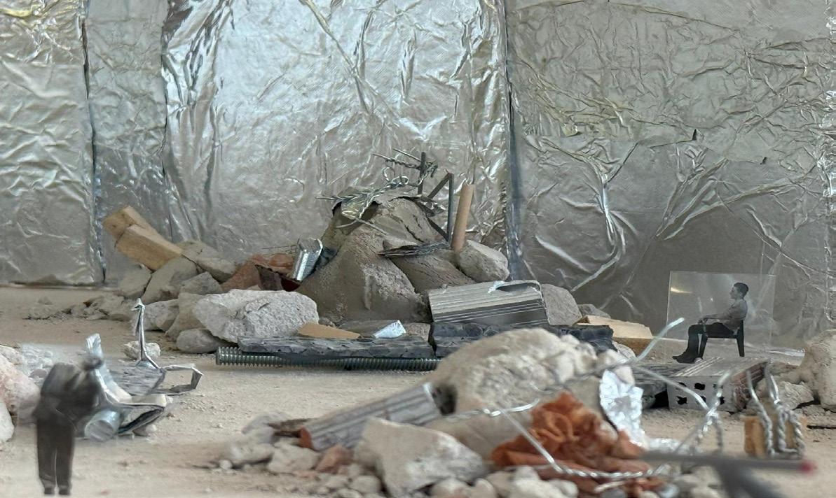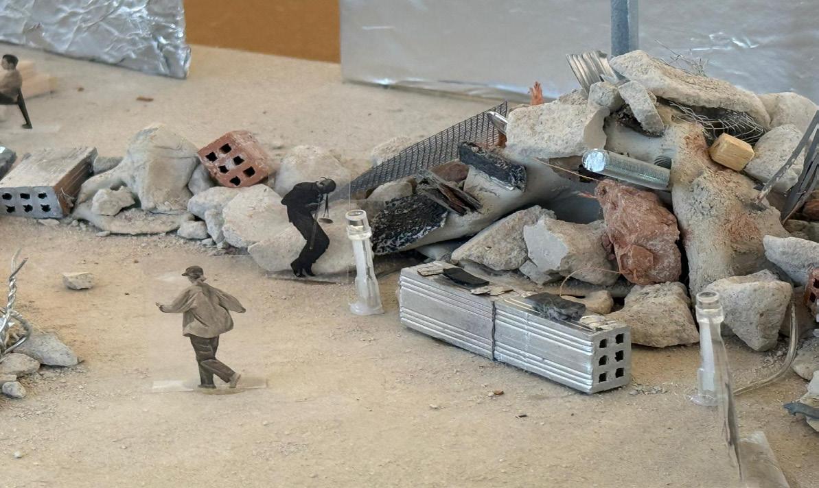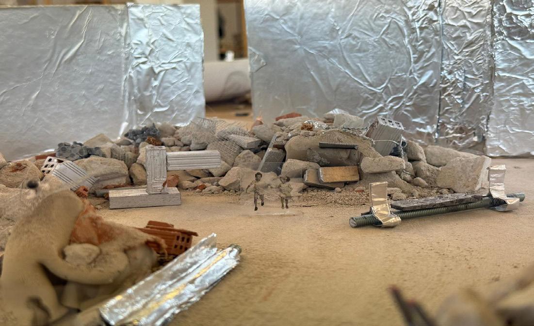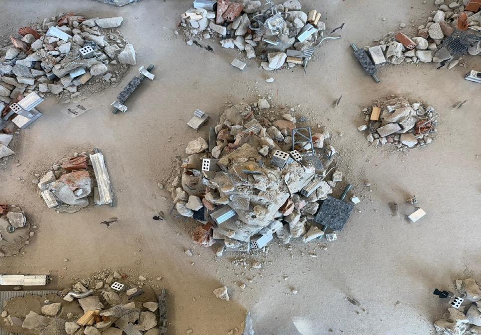 Modern Ruins es una instalación construida con materiales sobrantes de obra como bloques de hormigón, varillas, malla metálica, tuberías y chapas de acero inoxidable fracturadas, reorganizados en un paisaje artificial de “montañas”.