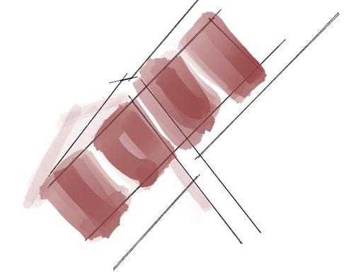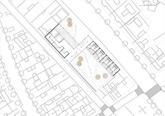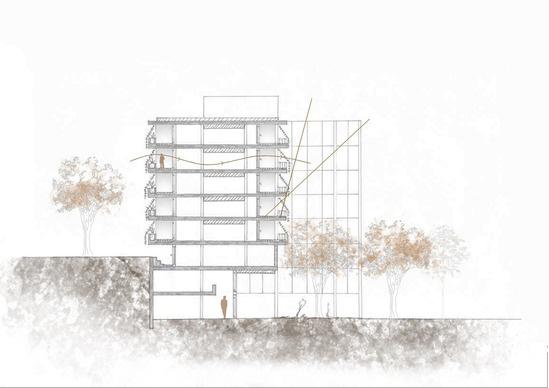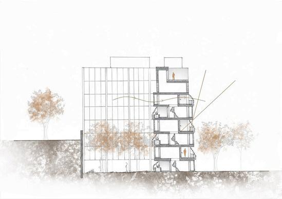 El edificio se estructura en dos bloques longitudinales que se desarrollan a ambos lados del solar, conectados por un núcleo central común. Este núcleo actúa no solo como elemento de circulación vertical, sino también como espacio relacional y articulador del conjunto. La diagonalidad del proyecto surge al conectar dos calles de características opuestas: una más ancha y transitada, y otra más estrecha y tranquila. Esta diferencia de escala genera una diagonal en planta baja que guía el paso entre los dos espacios exteriores del edificio, ampliando visualmente el recorrido y adaptándose al entorno urbano.