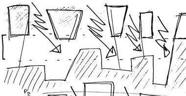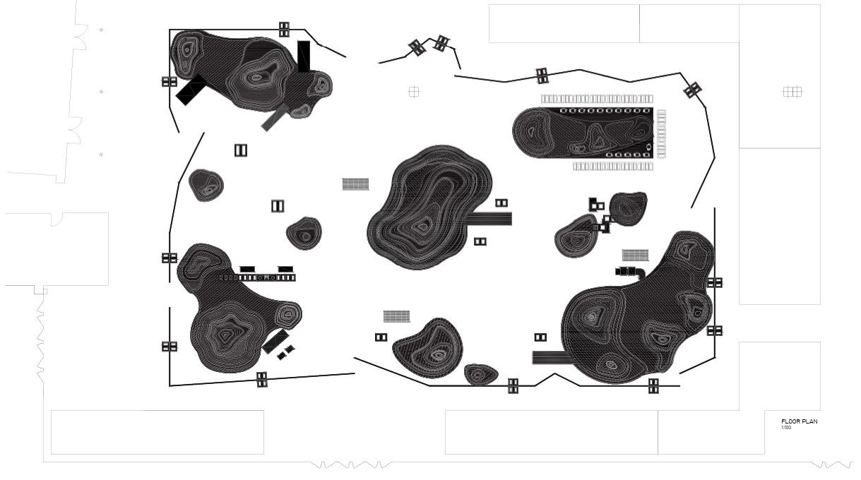 La propuesta se organiza en cuatro volúmenes geométricos elevados que siguen las alineaciones y tensiones urbanas del entorno del Mercat de les Flors, estableciendo una relación directa con la ciudad; su disposición fragmentada genera una composición dinámica basada en el diálogo entre llenos y vacíos, donde cada bloque mantiene su identidad dentro de un sistema unitario; la elevación libera la planta baja, creando un espacio público continuo, permeable y transitable que concentra accesos y recorridos, mientras una pasarela conecta los volúmenes, refuerza la unidad del conjunto y lo vincula con la Plaça de les Flors; en conjunto, el proyecto plantea una arquitectura elevada, geométrica e integrada en el espacio urbano.