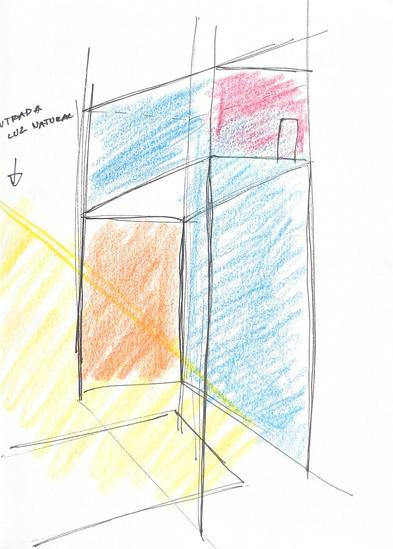Los vacíos generados en la pasarela permiten la entrada de luz natural hacia la planta baja, reforzando su carácter abierto y transitable. Al mismo tiempo, estas perforaciones introducen luz en el interior de los bloques, mejorando las condiciones espaciales y estableciendo relaciones visuales entre niveles.