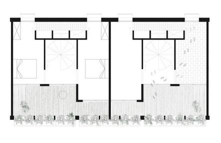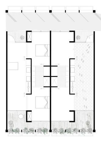 Se desarrollan dos tipologías principales de vivienda: por un lado, unidades de aproximadamente 50 m², pensadas para una ocupación más estándar, y por otro, viviendas de 70 m² en formato dúplex, que aportan una mayor complejidad espacial y diversidad al conjunto. Esta dualidad permite generar distintas formas de habitar y enriquecer el sistema de agregación del edificio.