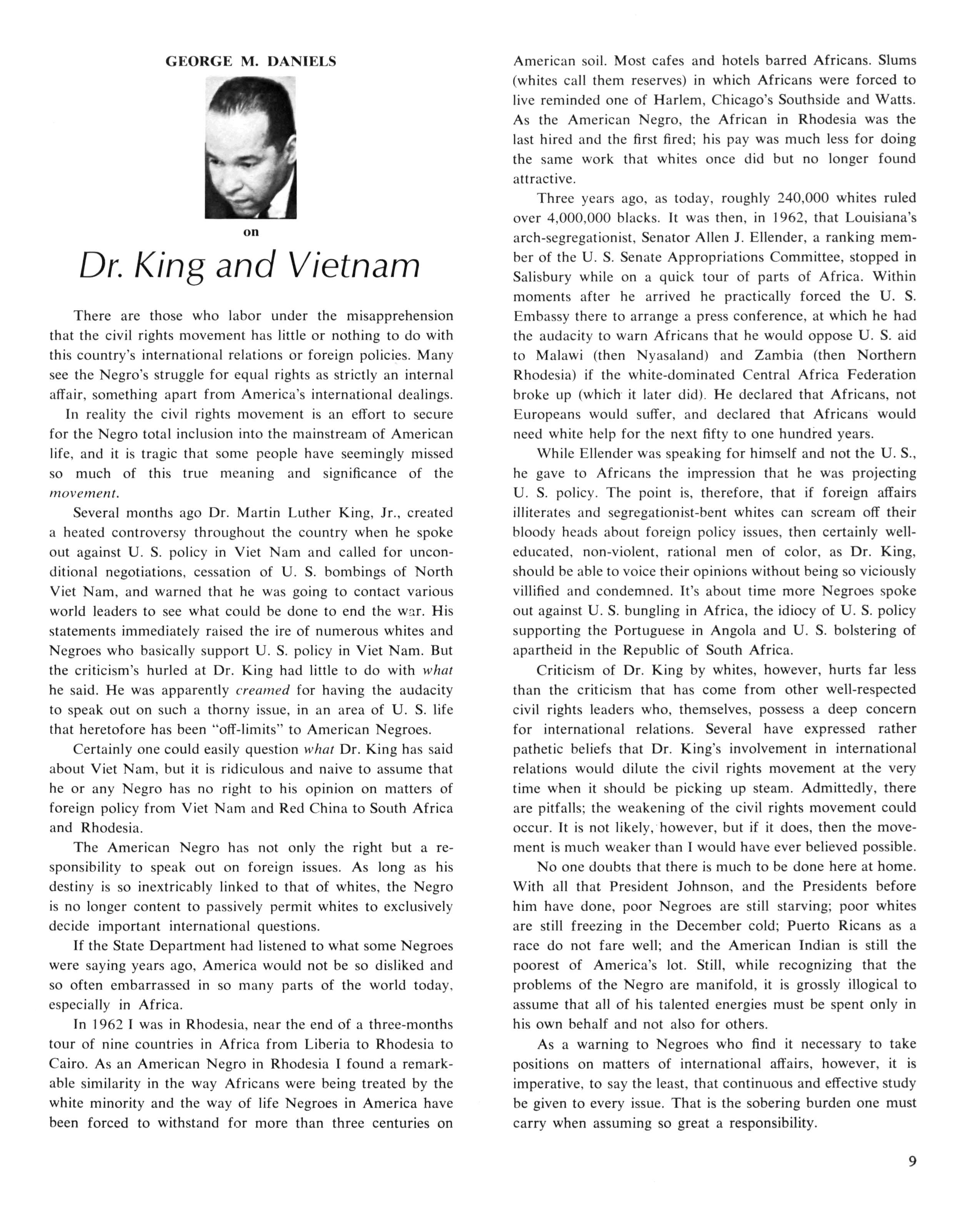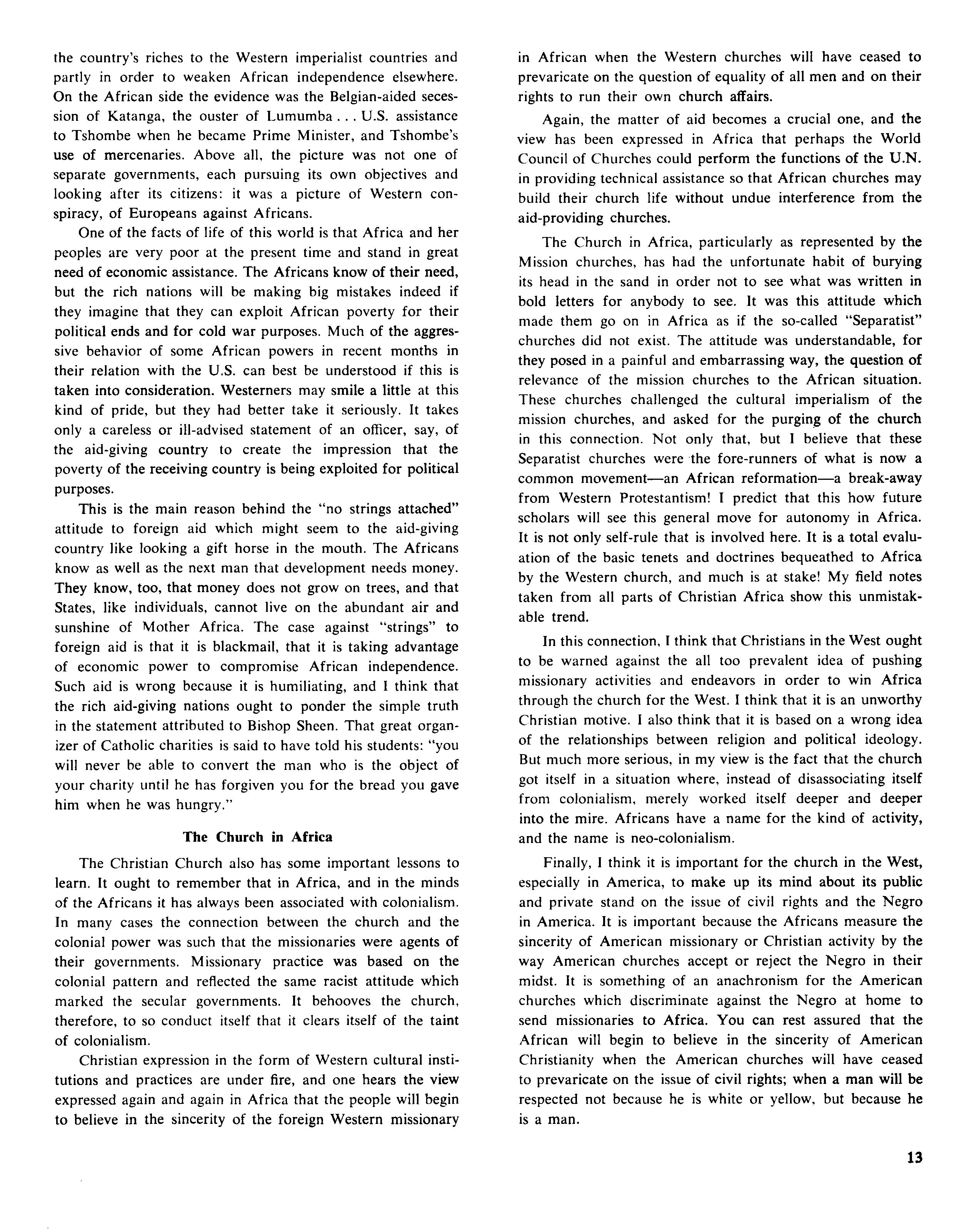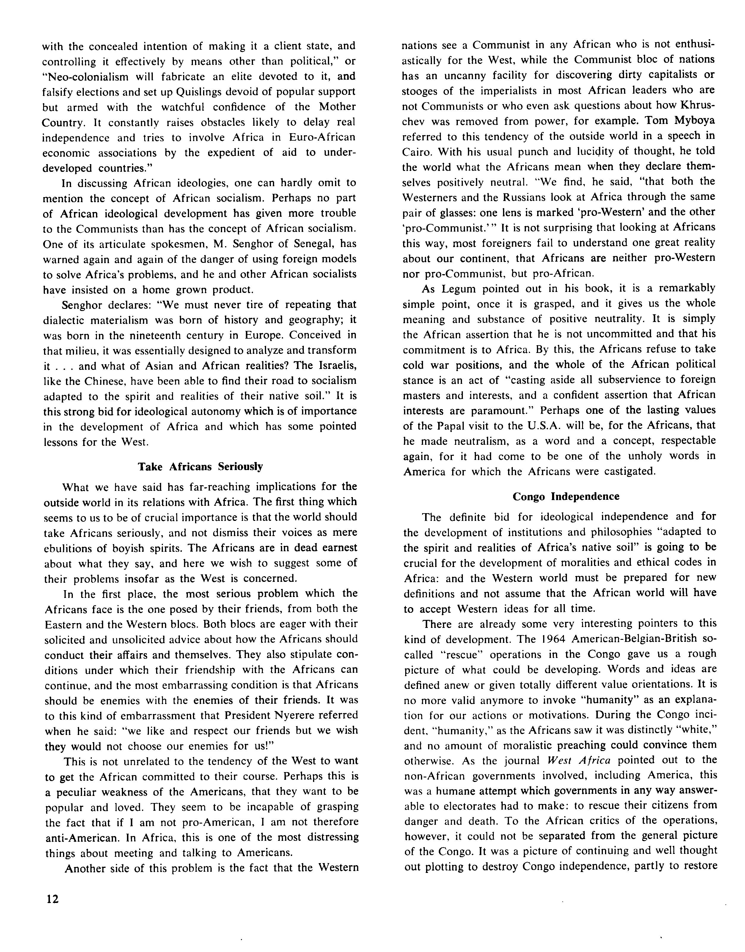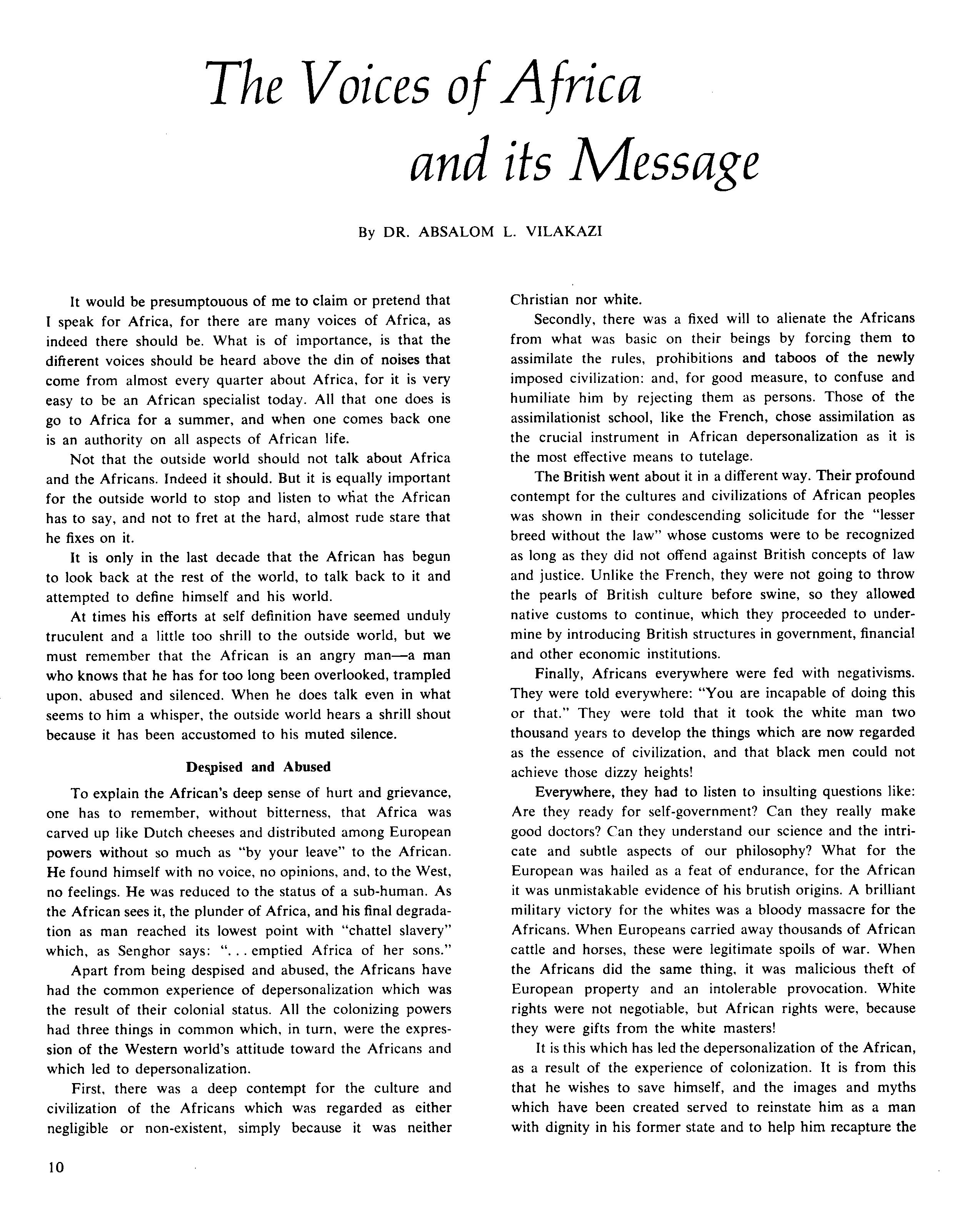 Following Mr Rogers article is a highly articulate editorial on the Negro After Watts — what next? It is reprinted from the September issue of the Voice of Missions, a publication of the AME Church, to which we offer our thanks Africa is very much in the news today Perhaps there is an understanding of the situation in the Republic of South Africa or Rhodesia; but how many actually understand the thinking of the African when he speaks of neo-colonialism or imperialism or Negritude? Dr. Absalom L. Vilakazi, author of The Voices of Africa and Its Message, is professor of African Studies at American University School of International Service, Washington, D.C His article is condensed from a speech he delivered in October at the Sixth World Order Study Conference of the National Council of Churches, at St. Louis, Mo.