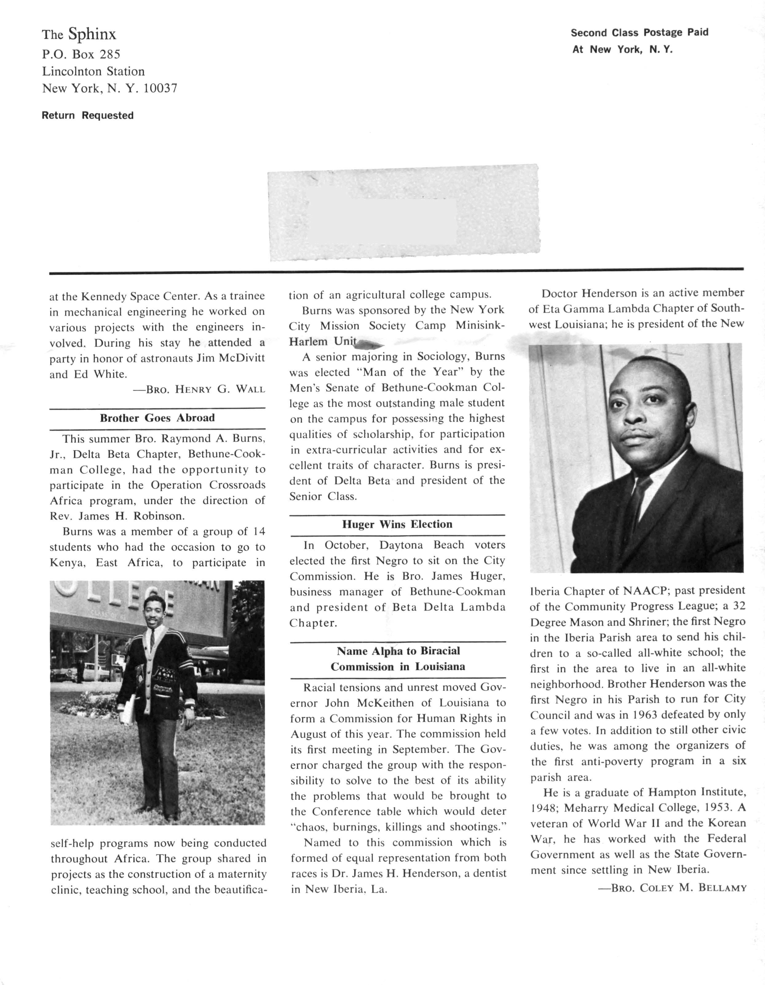 The Sphinx is the official magazine of the Alpha Phi Alpha Fraternity, Inc., 4432 South Parkway, Chicago, III., with editorial offices at 282 Convent Ave., New York, N Y Published four times a year: February, May, October and December Address all editorial mail to P.O Box 285, Lincolnton Station, New York, N Y 10037 Change of Address: Send both addresses to Alpha Phi Alpha Fraternity, 4432 South Parkway, Chicago, III Manuscripts or art submitted to The Sphinx should be accompanied by addressed envelopes and return postage Editor assumes no responsibi'ity for return of unsolicited manuscripts of art