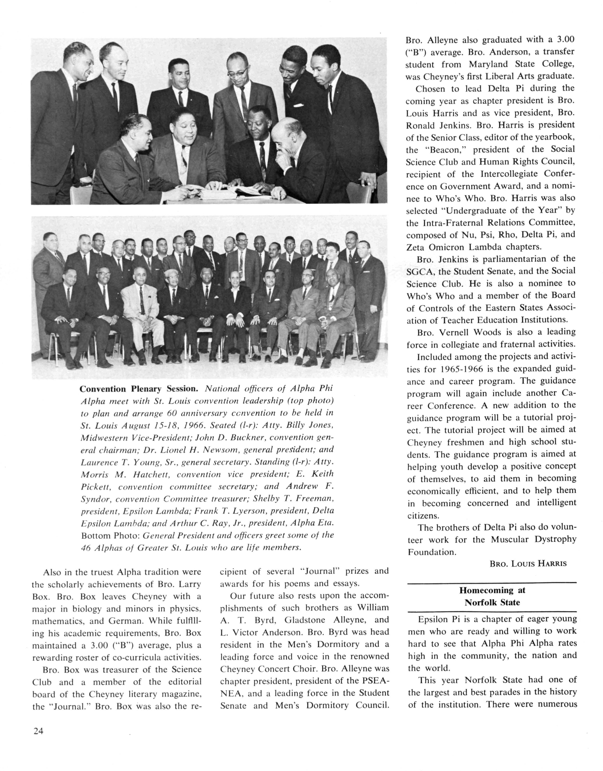 Convention Plenary Session. National officers of Alpha Phi Alpha meet with St. Louis convention leadership (top photo) to plan and arrange 60 anniversary convention to be held in St. Louis August 15-18, 1966. Seated (l-r): Atty. Billy Jones, Midwestern Vice-President; John D. Buckner, convention general chairman; Dr. Lionel H. Newsom, general president; and Laurence T. Young, Sr., general secretary. Standing (l-r): Atty. Morris M. Hatchett, convention vice president; E. Keith Pickett, convention committee secretary; and Andrew F. Syndor, convention Committee treasurer; Shelby T. Freeman, president, Epsilon Lambda; Frank T. Lyerson, president, Delta Epsilon Lambda; and Arthur C. Ray, Jr., president. Alpha Eta. Bottom Photo: General President and officers greet some of the 46 Alphas of Greater St. Louis who are life members.