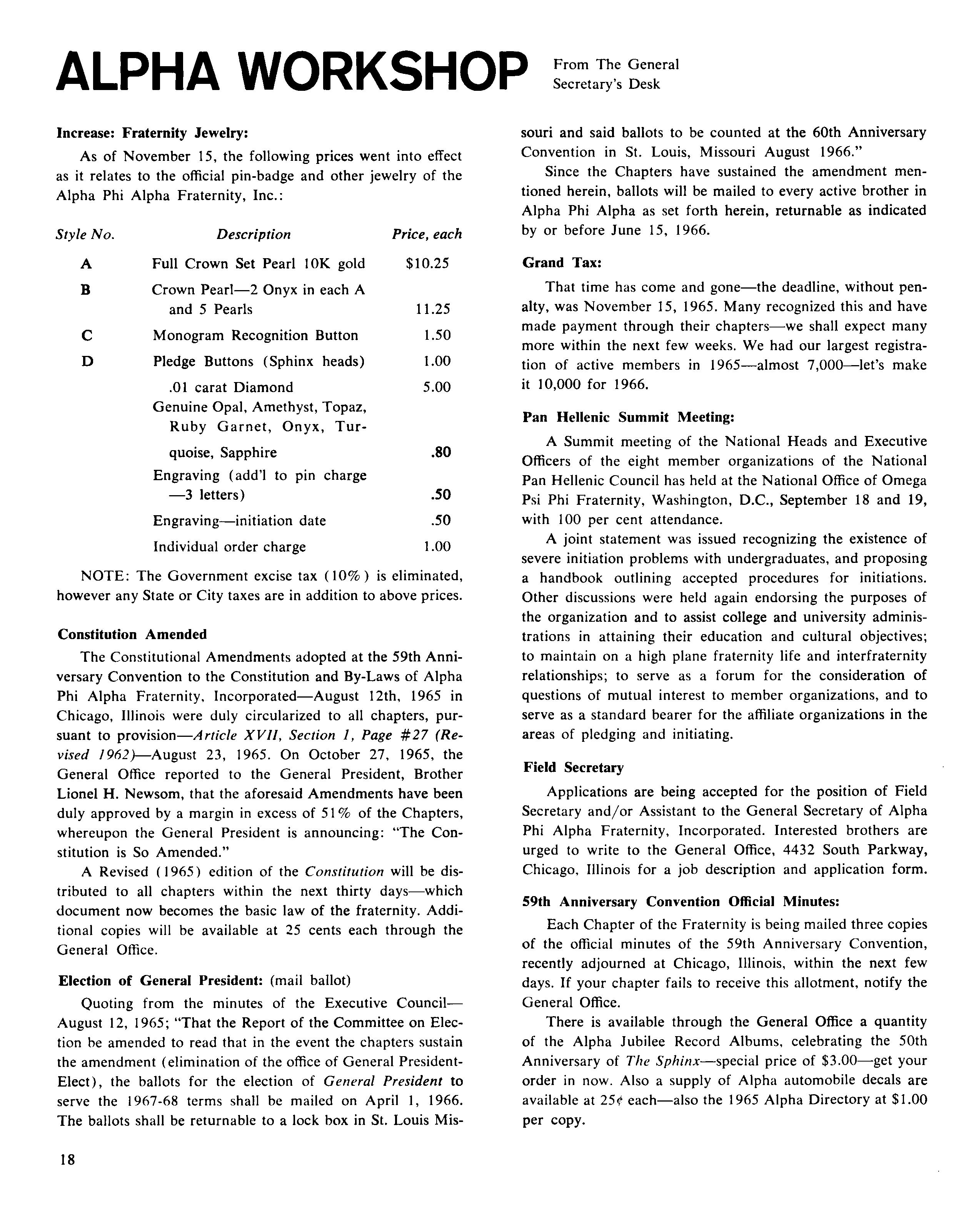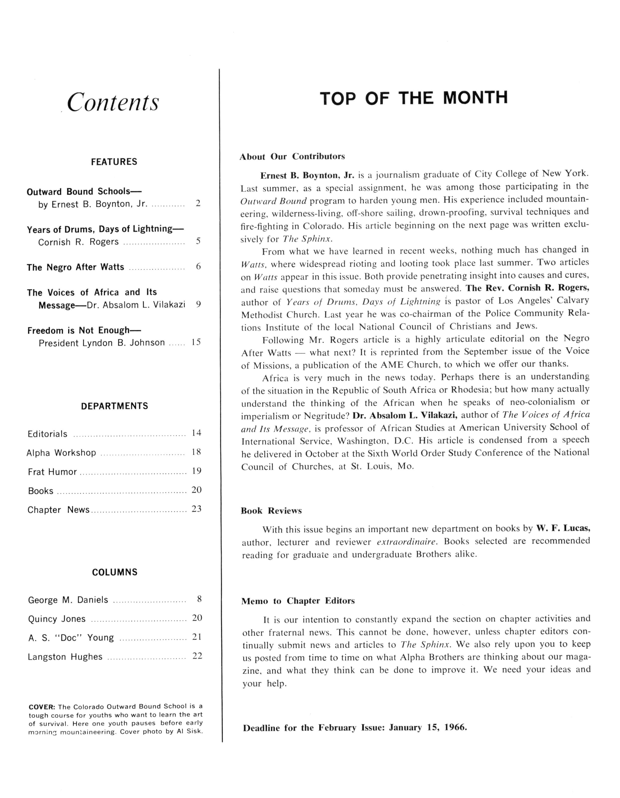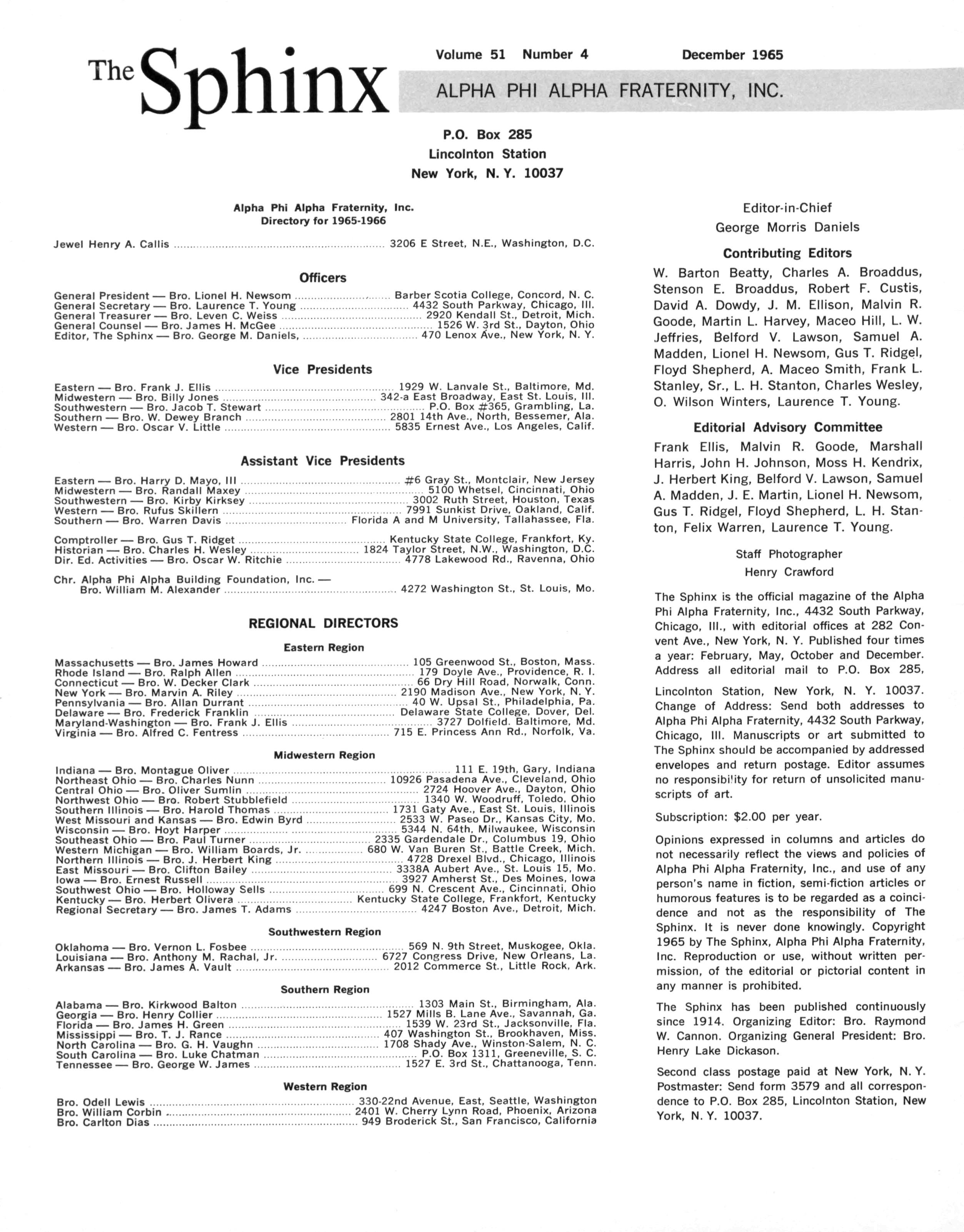 Opinions expressed in columns and articles do not necessarily reflect the views and policies of Alpha Phi Alpha Fraternity, Inc., and use of any person's name in fiction, semi-fiction articles or humorous features is to be regarded as a coincidence and not as the responsibility of The Sphinx It is never done knowingly Copyright 1965 by The Sphinx, Alpha Phi Alpha Fraternity, Inc Reproduction or use, without written permission, of the editorial or pictorial content in any manner is prohibited