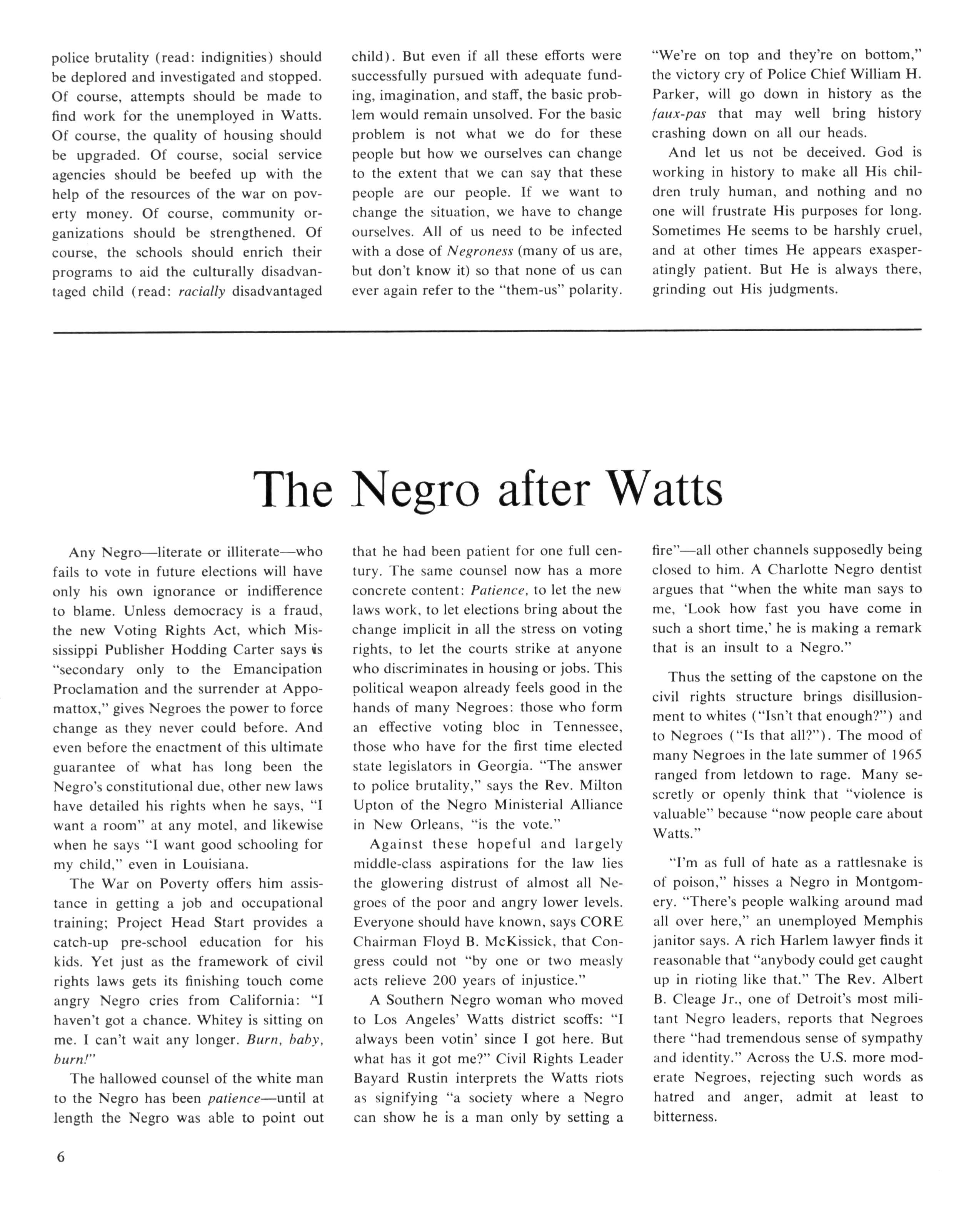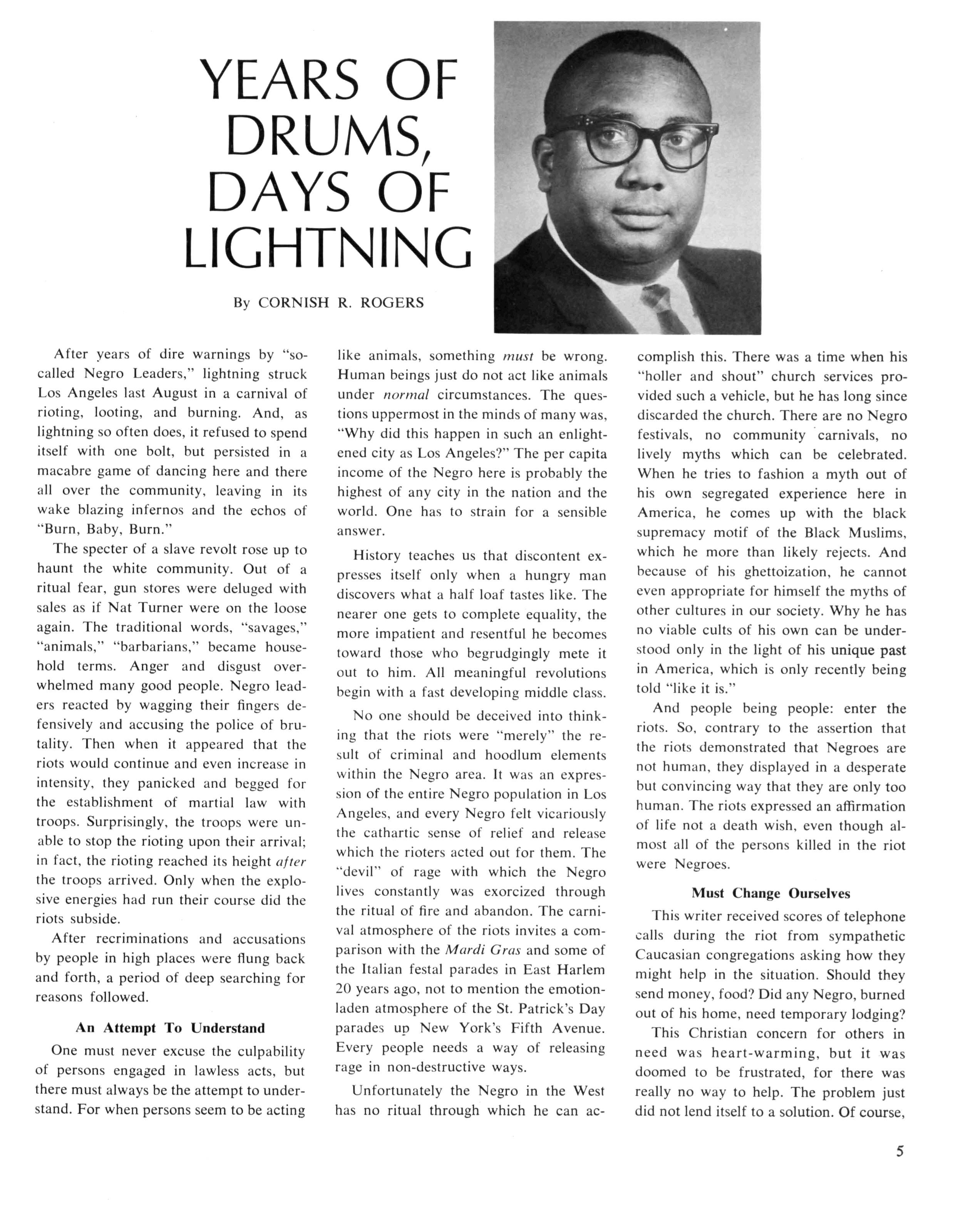 From what we have learned in recent weeks, nothing much has changed in Watts, where widespread rioting and looting took place last summer Two articles on Watts appear in this issue Both provide penetrating insight into causes and cures, and raise questions that someday must be answered. The Rev. Cornish R. Rogers, author of Years of Drums. Days of Lightning is pastor of Los Angeles' Calvary Methodist Church. Last year he was co-chairman of the Police Community Relations Institute of the local National Council of Christians and Jews.