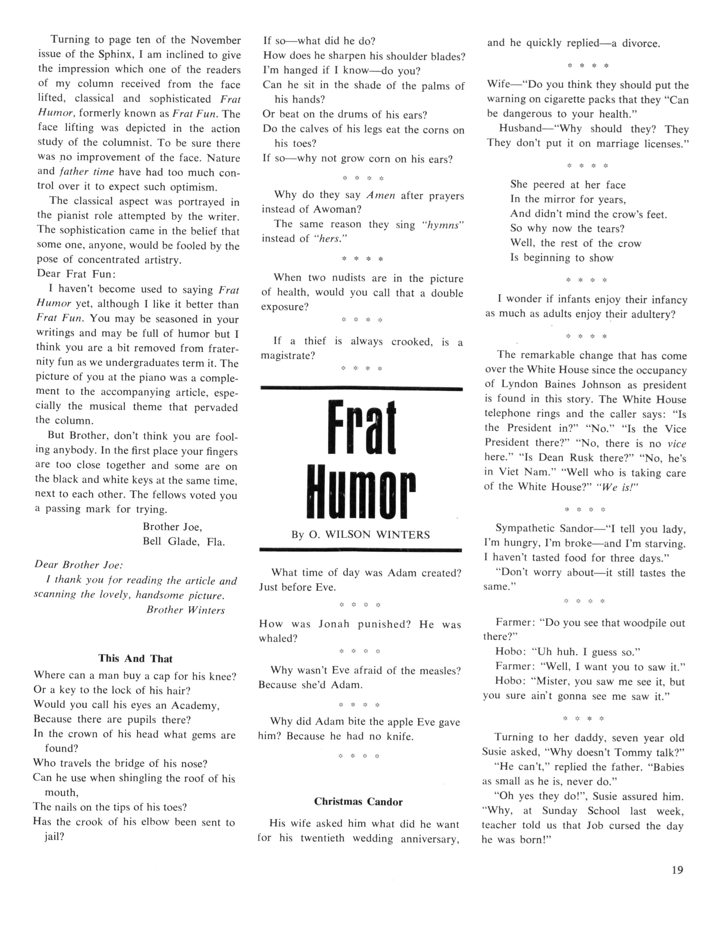 To further its striving toward more and better scholarship, the following brothers were placed on the honor roll for the winter quarter with the following averages: Brother William Martin, a junior from McRae, Georgia majoring in English, 4.0; Brother Grady Riggs, a senior from Savannah, Georgia majoring in mathematics, 3.6; Brother Bartha Moore, a junior from Waynesboro, Georgia majoring in Biology, 3.3; Brother Phillip Dryer, a junior from Savannah, Georgia majoring in mathematics, 3.3; Brother Charls Day, a junior of Savannah, Georgia majoring in mathematics, 3.3; Brother Bradford Torain, a junior from Cedartown, Georgia majoring in electronics, 3.3; Brother Richard Anderson, a senior of Winter Park Florida, majoring in Health and Physical Education, 3.6; and the editor to the Sphinx, Bennie Brown, a junior of Cedartown, Georgia majoring in mathematics, 3.0.