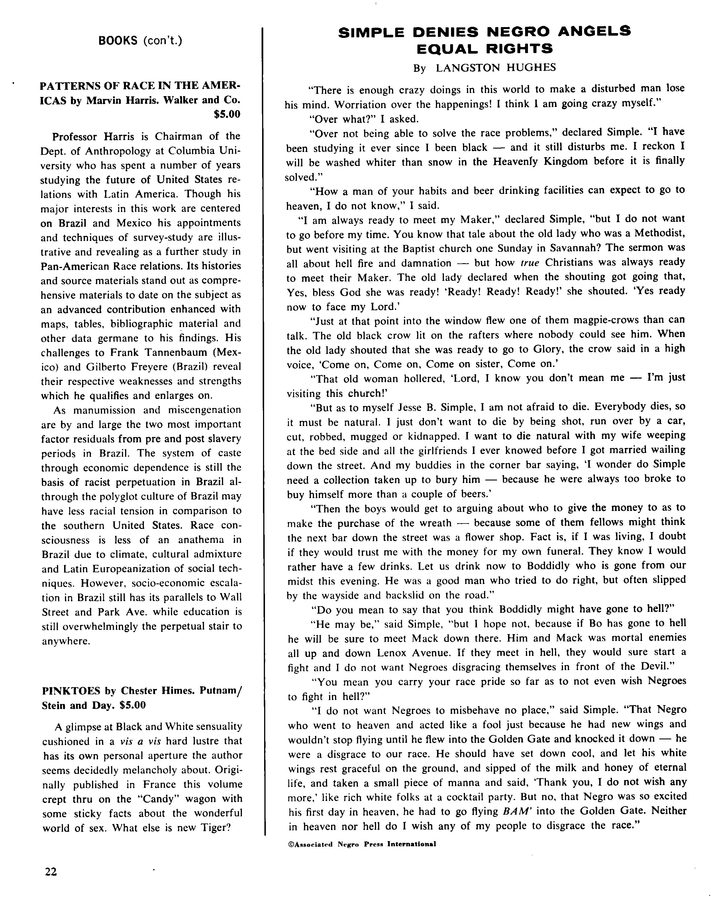 "Over not being able to solve the race problems," declared Simple "I have been studying it ever since I been black — and it still disturbs me. I reckon I will be washed whiter than snow in the Heavenly Kingdom before it is finally solved."