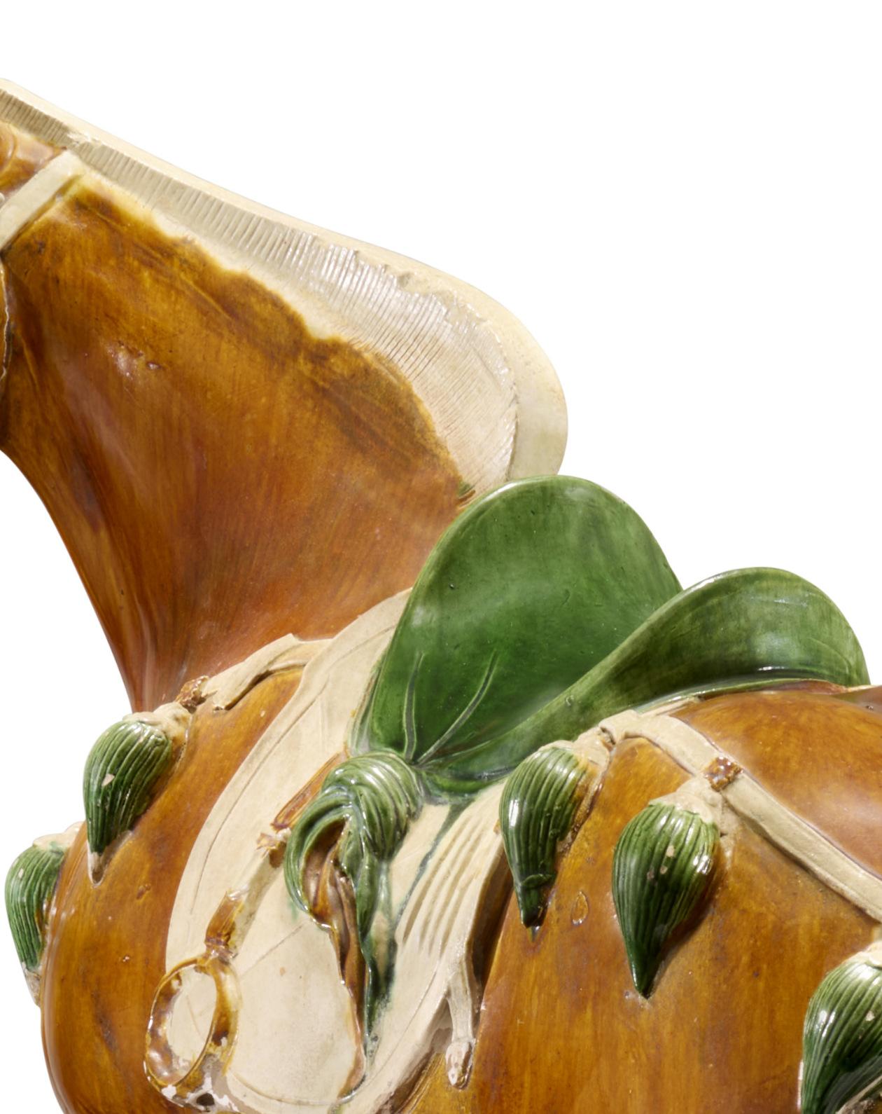 Tang sancai horses were either adorned with the brilliant tri-colored glazes characteristic of the period, as in the present example, or left unglazed and cold-painted. Both approaches achieved remarkable realism and vitality. The sancai technique, in particular, produced enduringly vibrant colors that accentuate the animal’s powerful physique and intricate molded trappings. The present figure stands as a superb example of this celebrated artistic tradition.