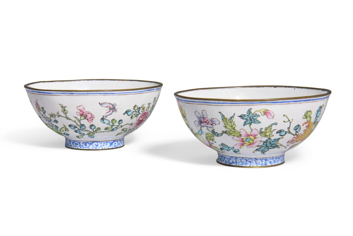清乾隆 銅胎畫琺琅蝶戀花紋碗 一對