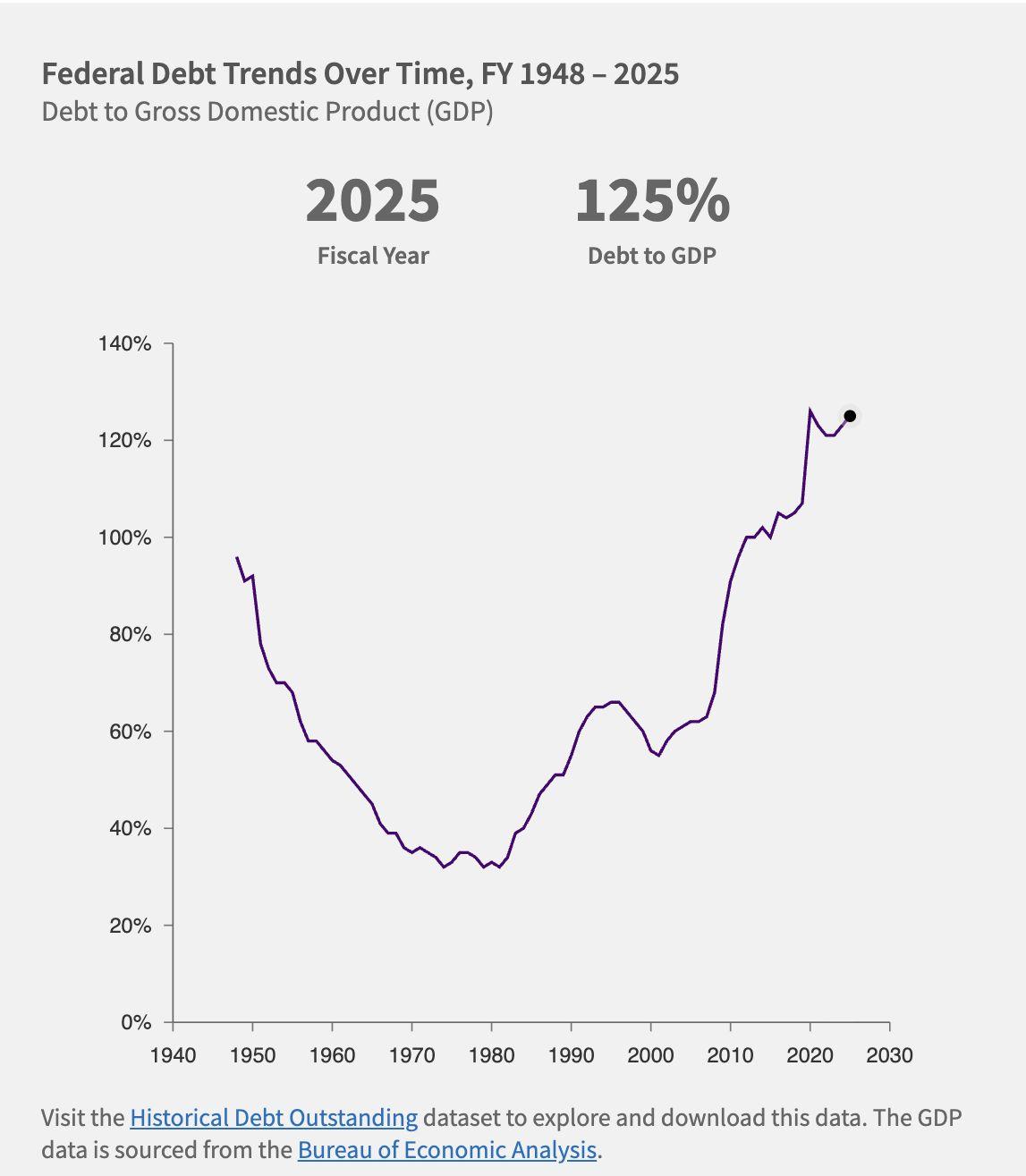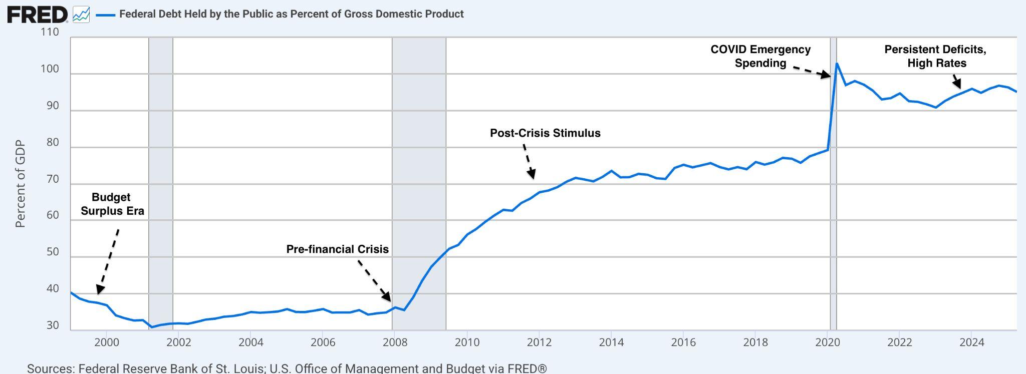 要理解美國當前的財政局勢,回顧過去二十年的發展至關重要。2000 年,美國公眾持有 的聯邦債務僅占 GDP 的 35%;隨後二十年間,軍事支出、減稅政策與低成長共同推升債 務比重。2008 年金融危機 使債務大幅飆升,至 2012 年已達 GDP 的 69%。
