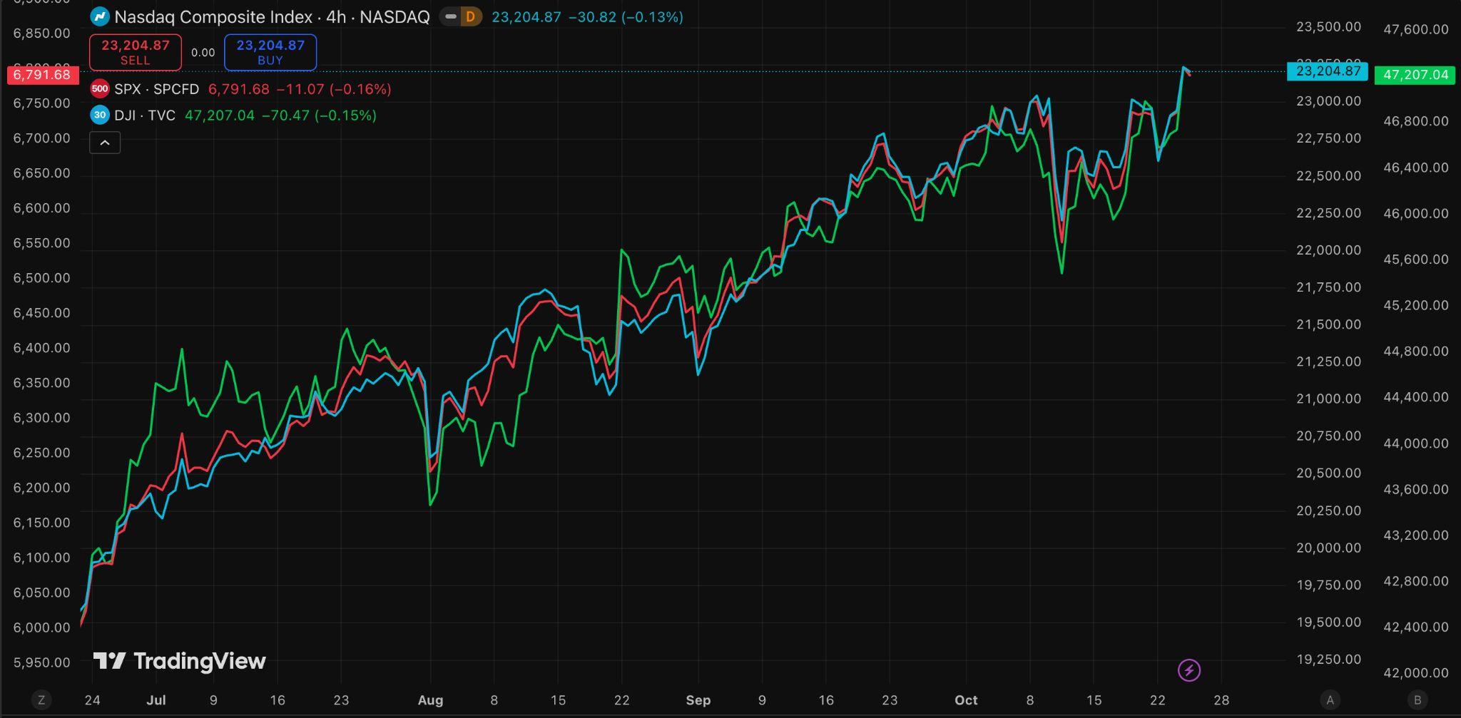 圖十二:標普 500、那斯達克與道瓊工業指數走勢(資料來源: TradingView)
