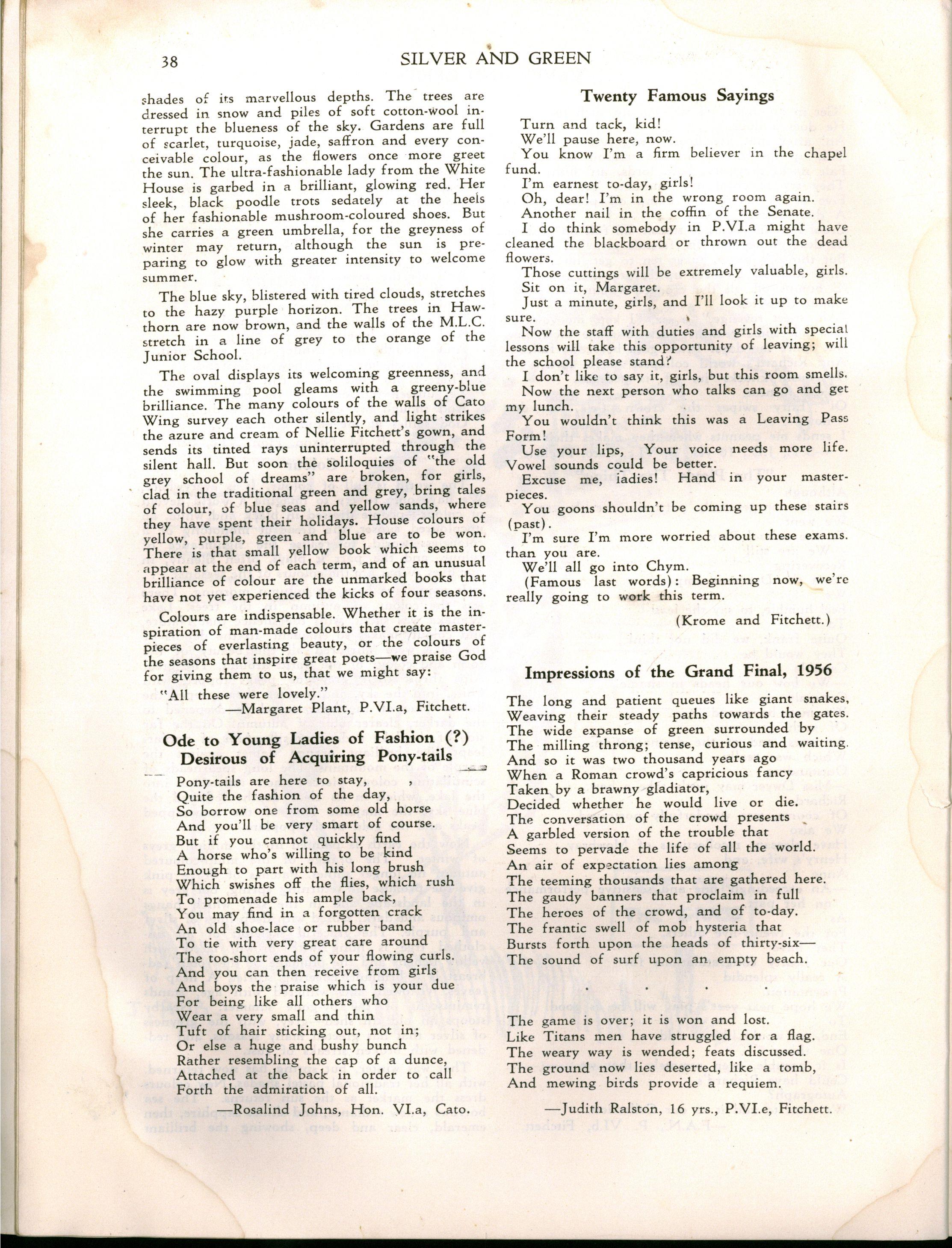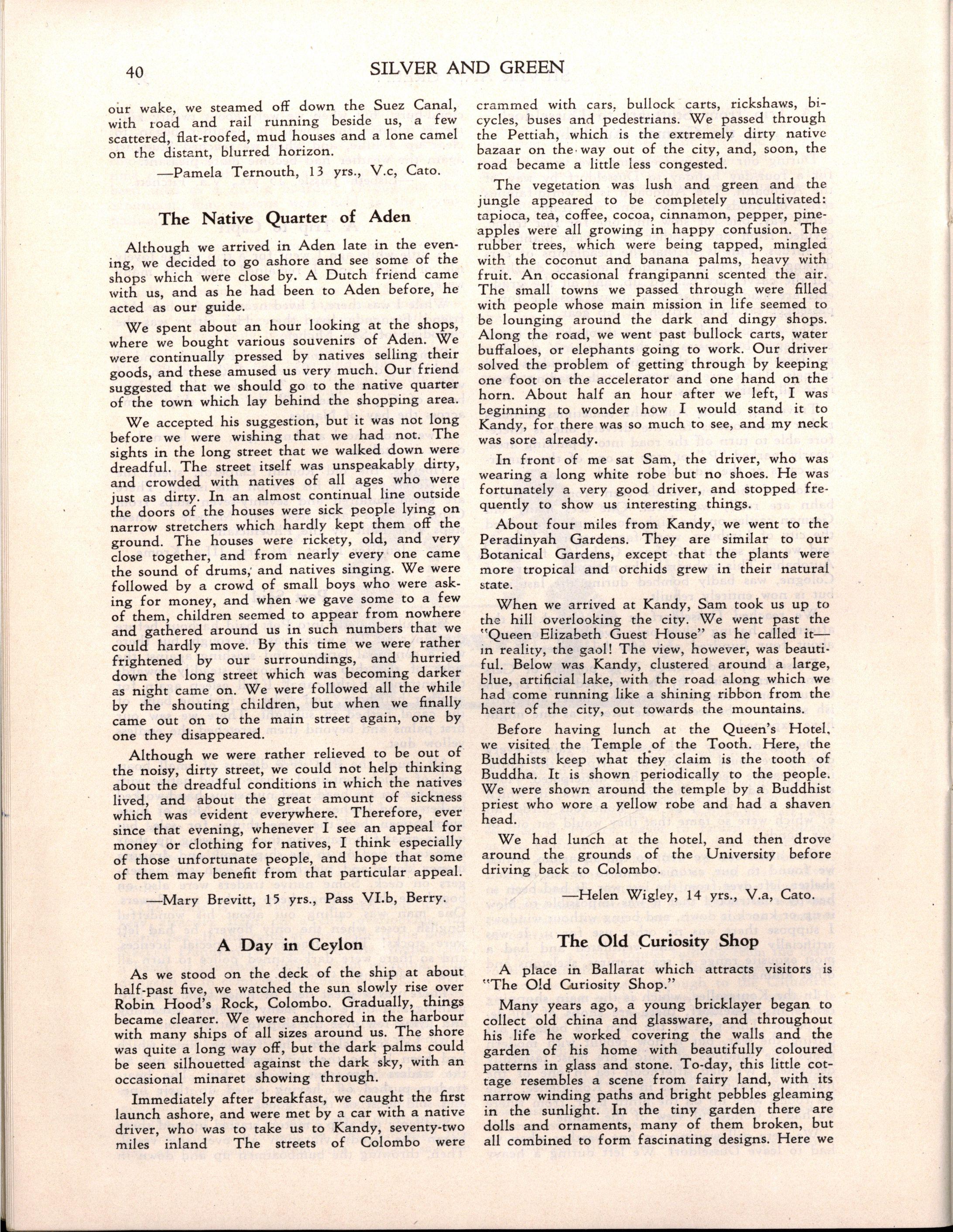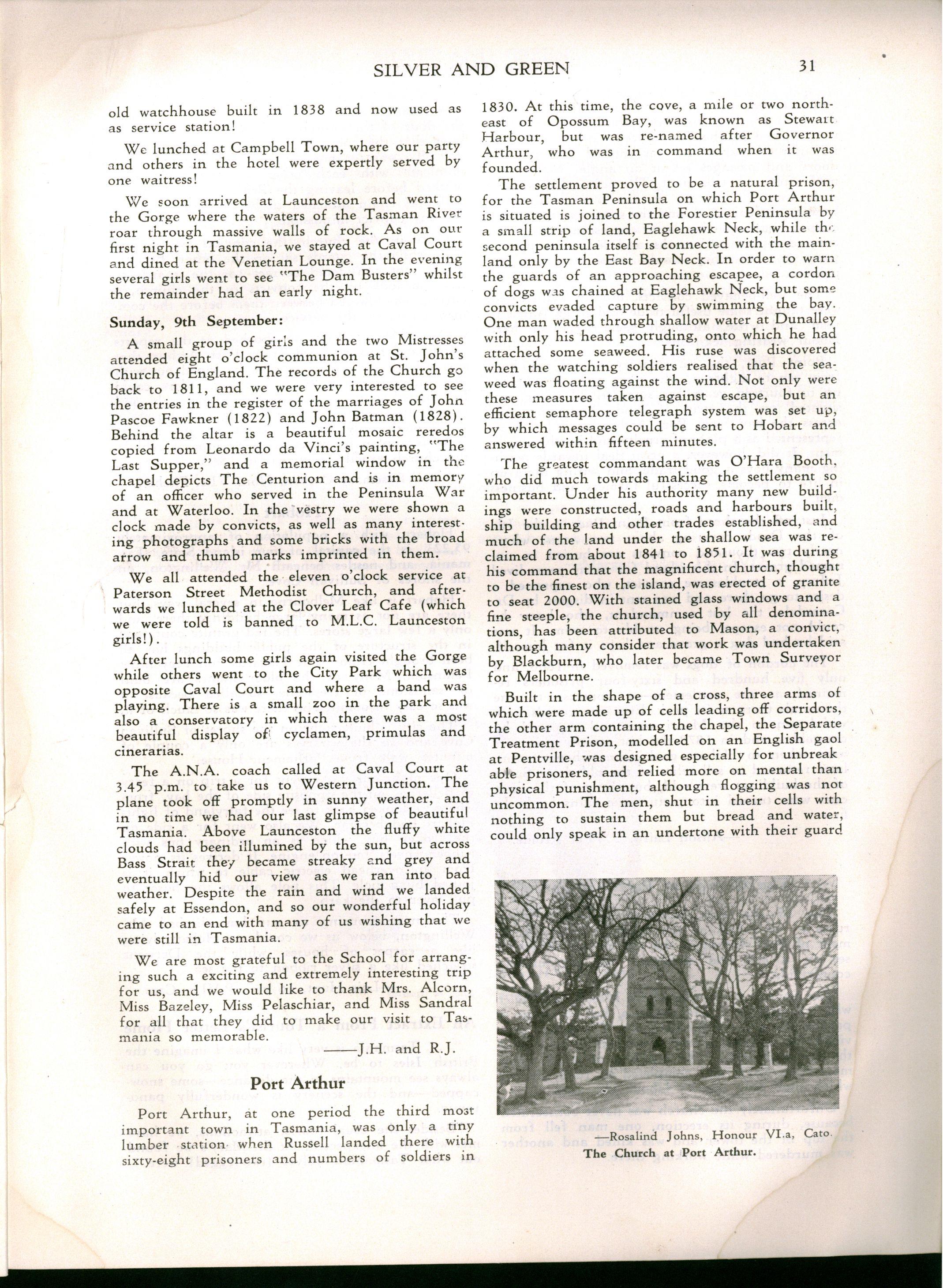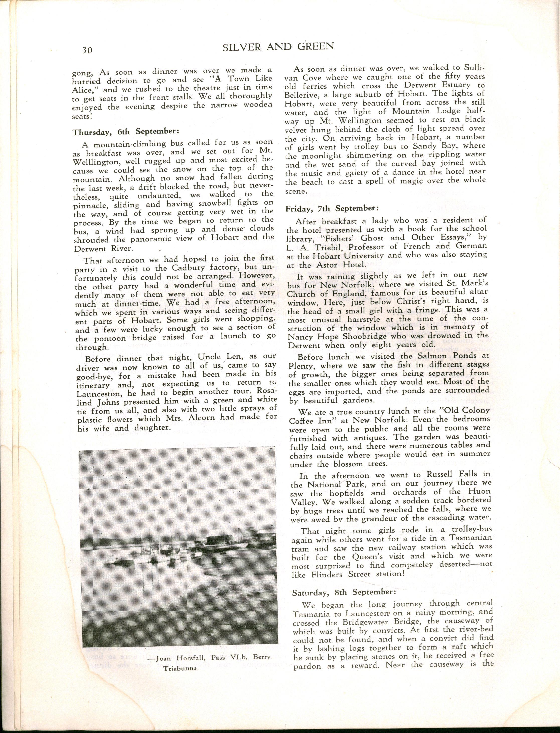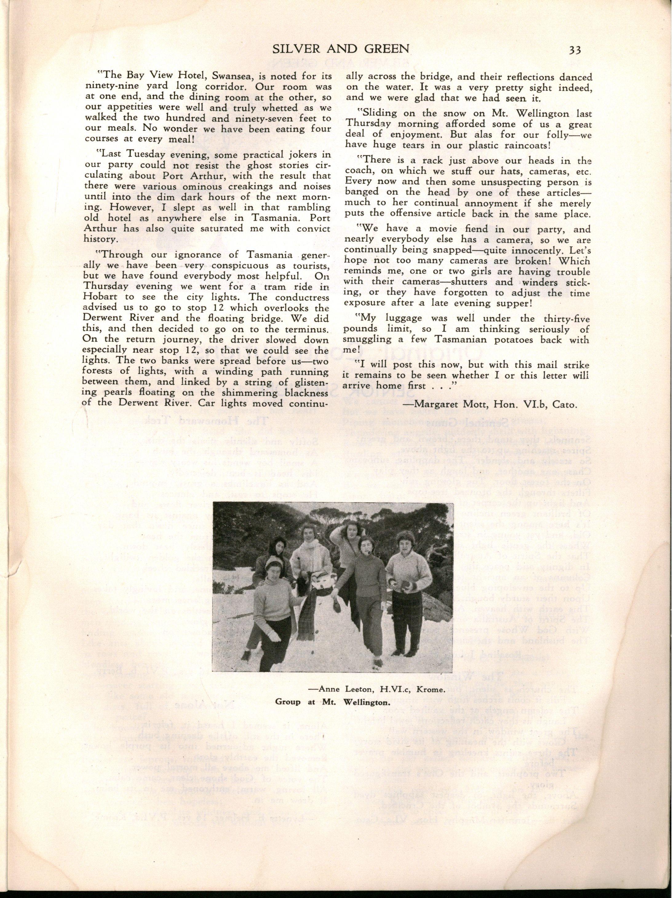 "Girlst evidently stay longer at school in Britain The leaving age, of course, is fifteen; but when I was visiting schools comparable with M.L.C., it seemed to me that there were more girls of seventeen and eighteen years of age I believe that parents in Britain are prepared to make great sacrifices for their daughters' education Australia has a nineteenth century outlook in the limited value attached to girls' education and in the materialistic attitude of some parents and girls."