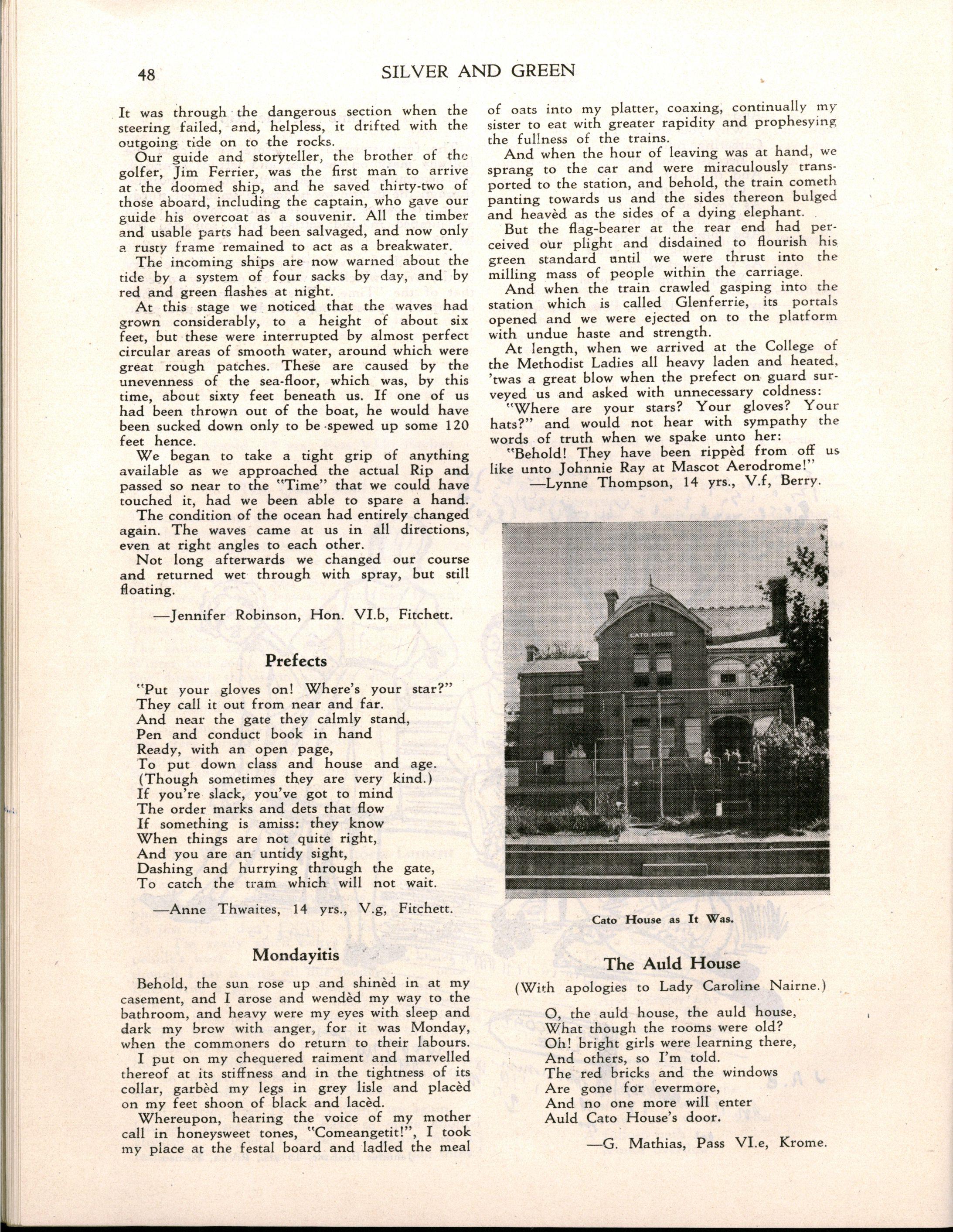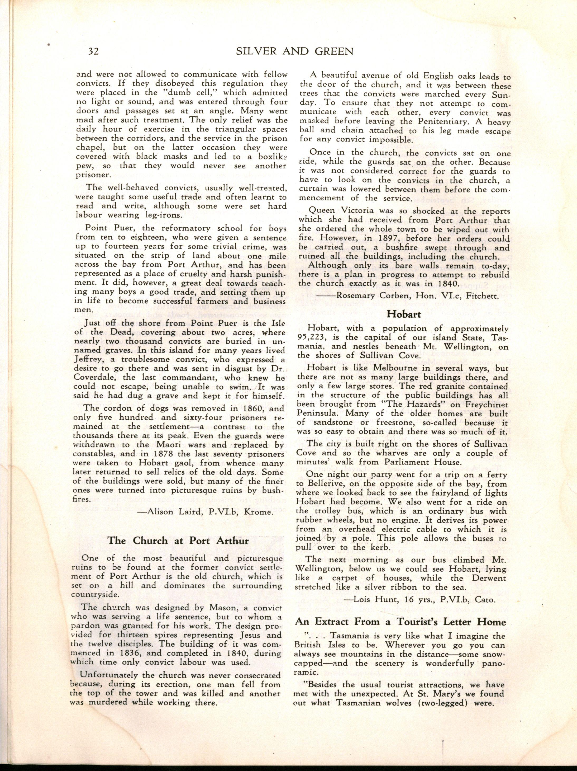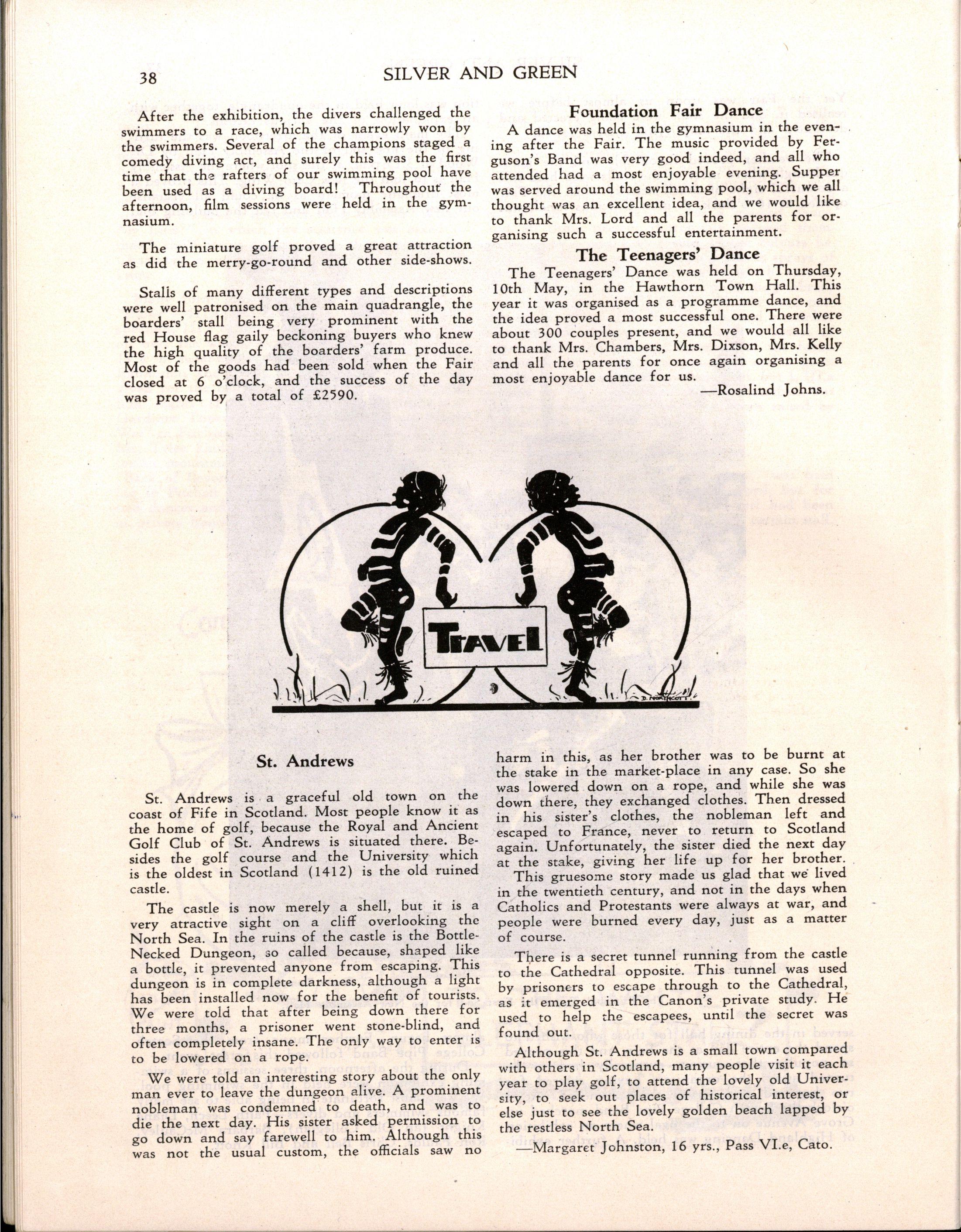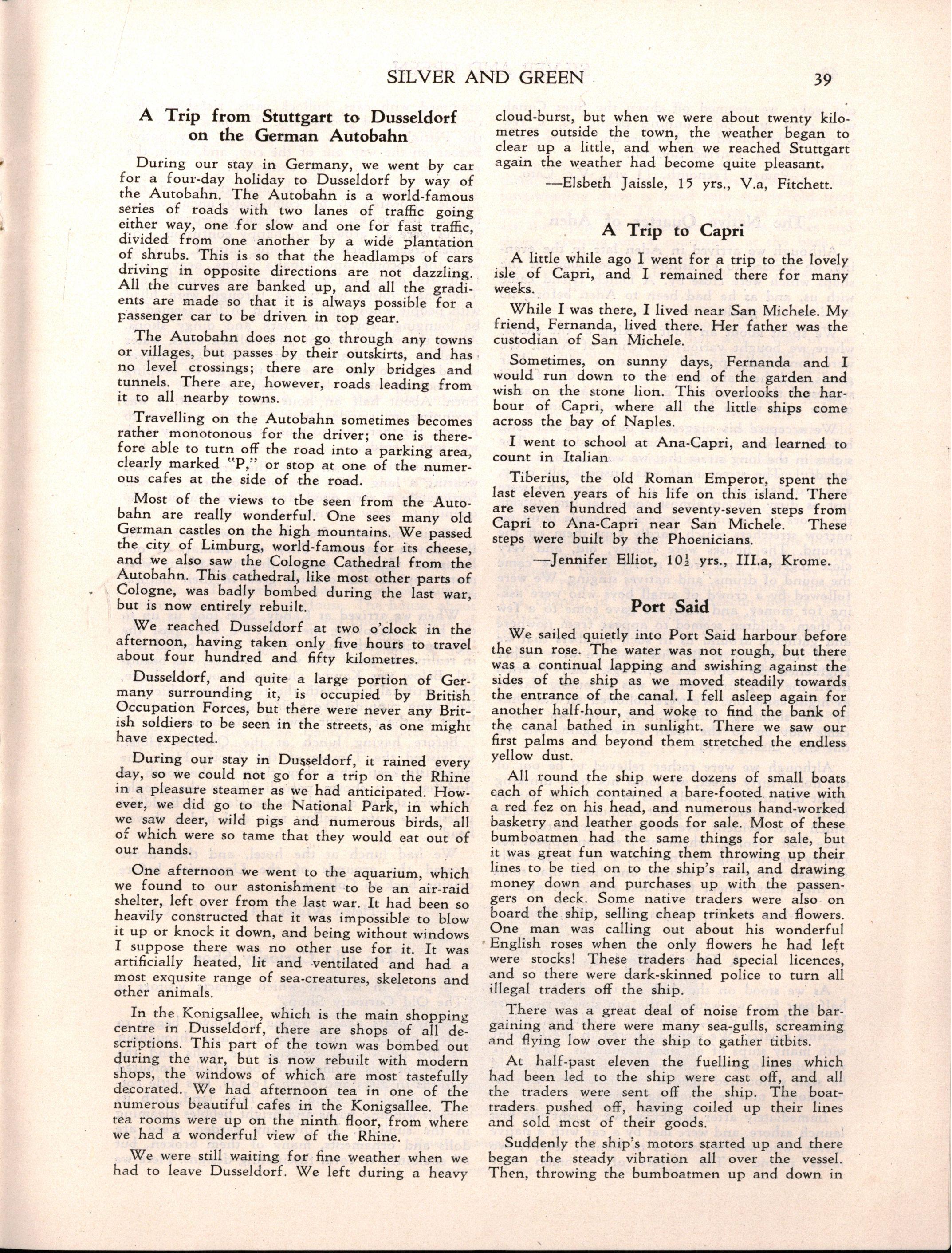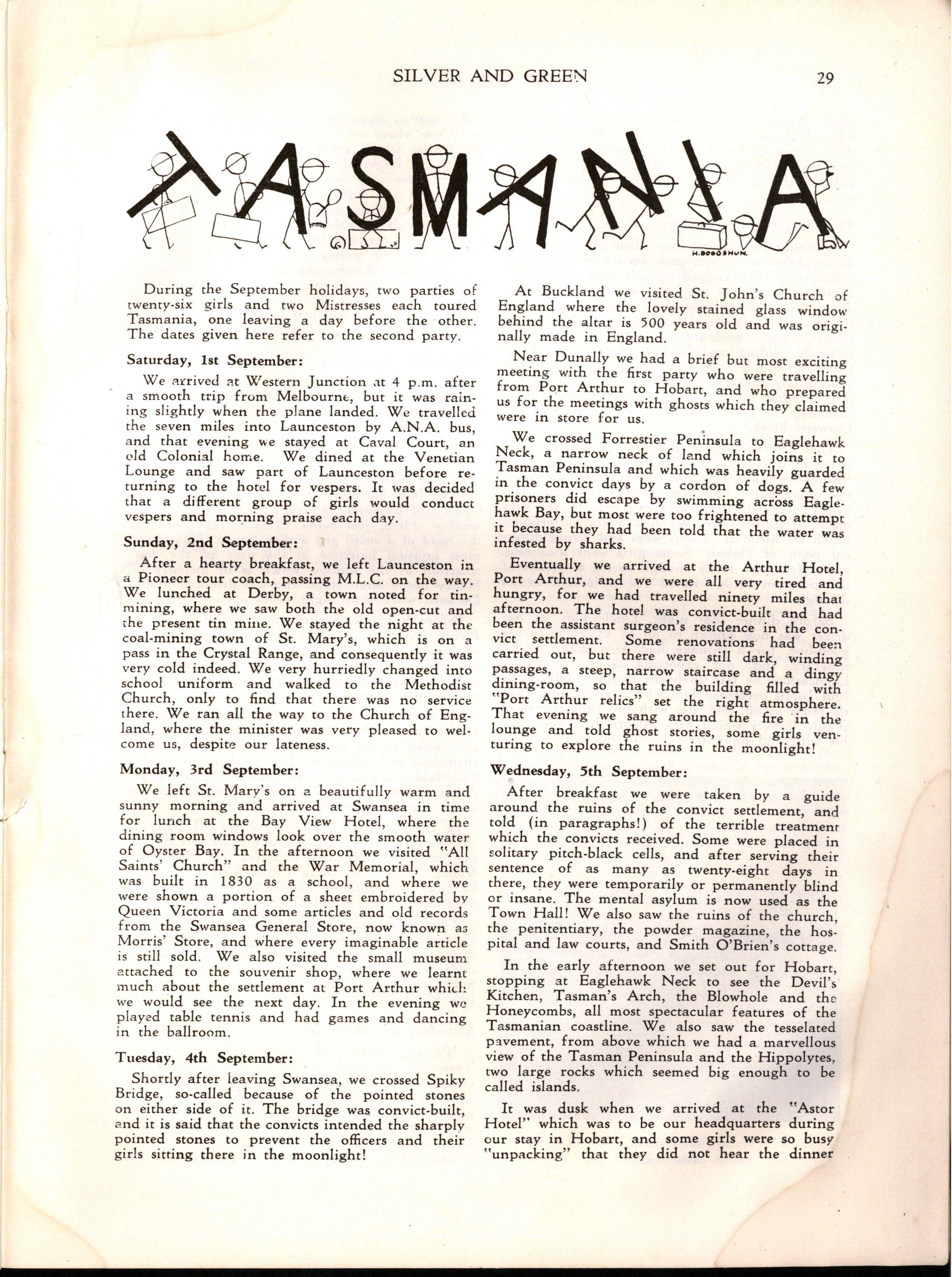 "Girlst evidently stay longer at school in Britain The leaving age, of course, is fifteen; but when I was visiting schools comparable with M.L.C., it seemed to me that there were more girls of seventeen and eighteen years of age I believe that parents in Britain are prepared to make great sacrifices for their daughters' education Australia has a nineteenth century outlook in the limited value attached to girls' education and in the materialistic attitude of some parents and girls."