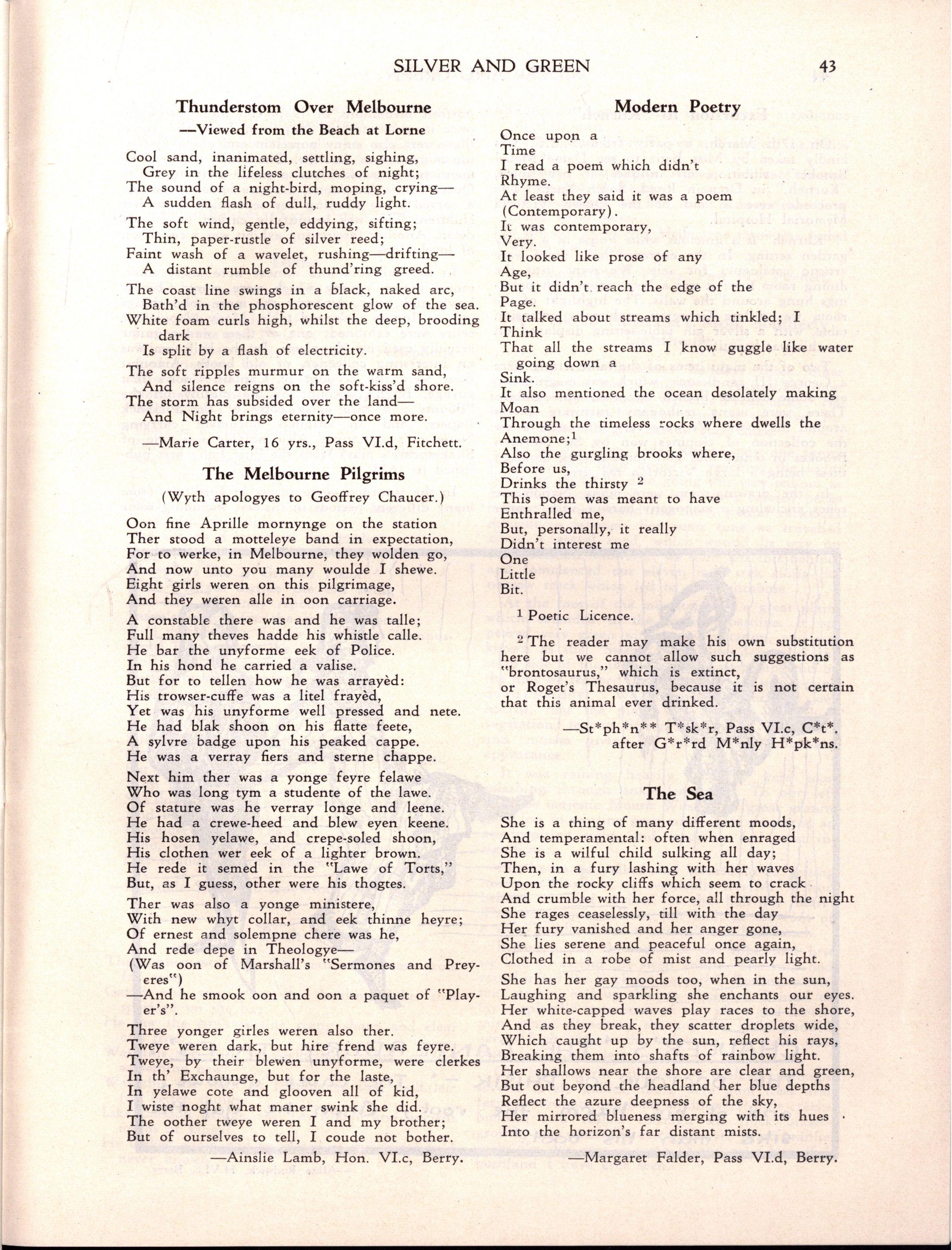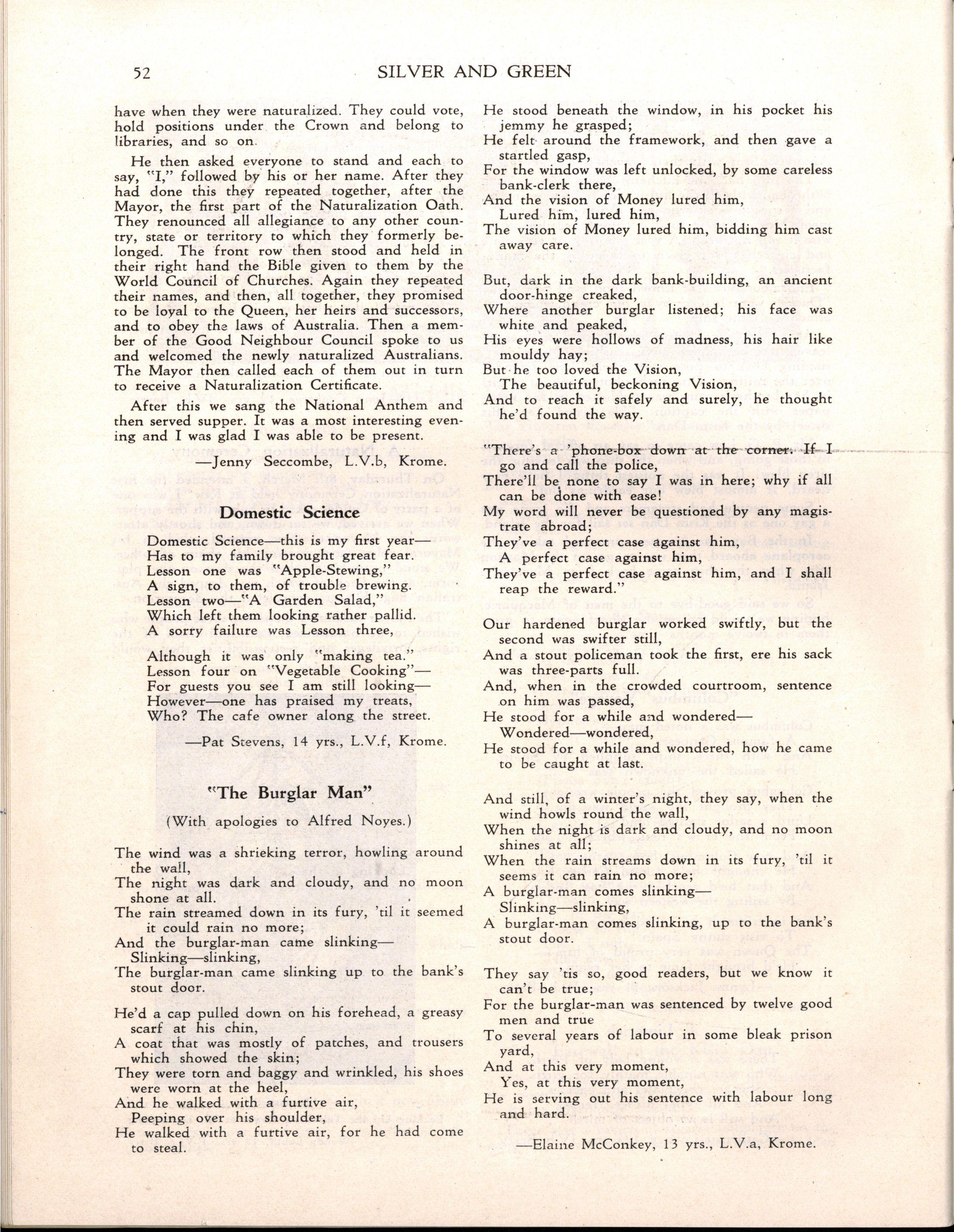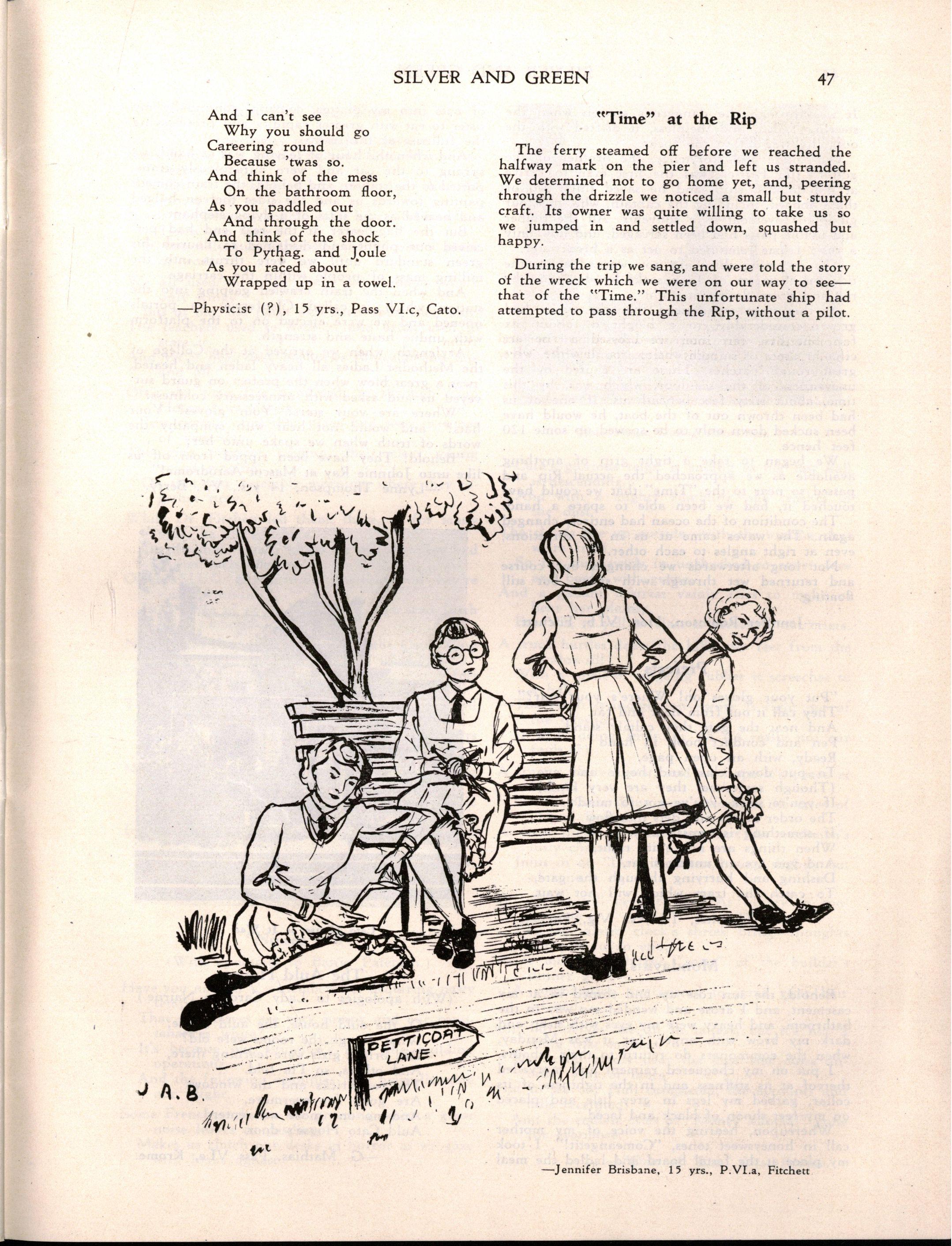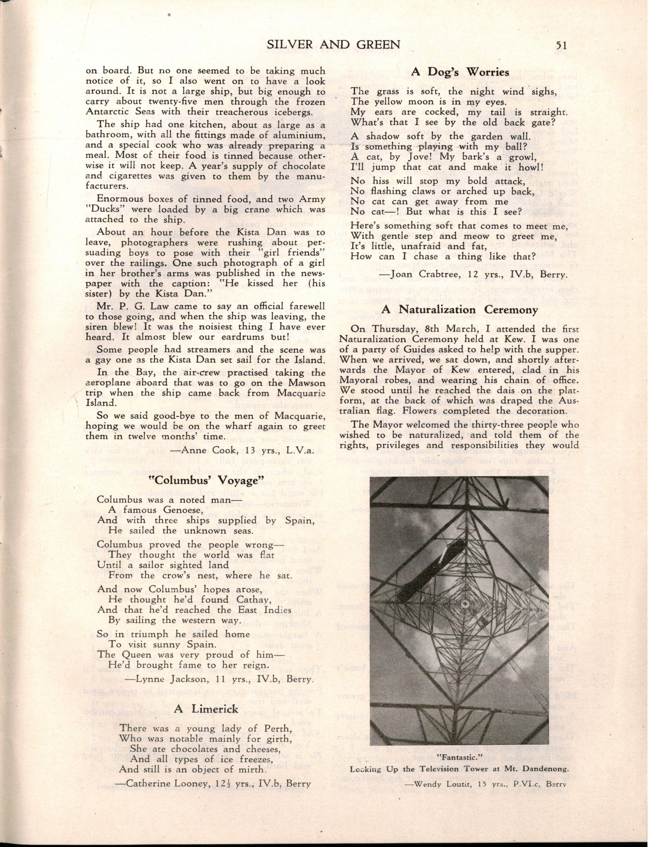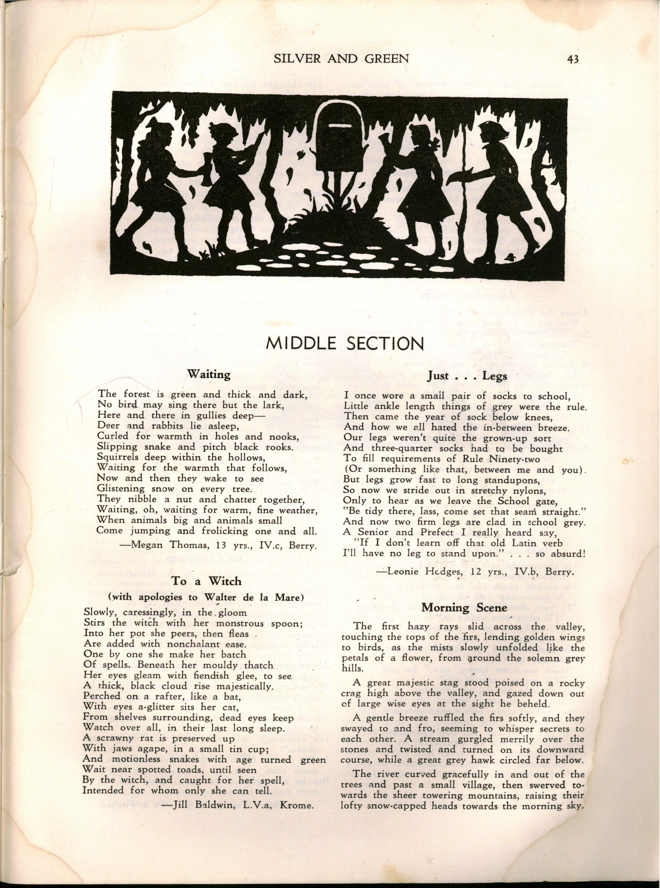 "Girlst evidently stay longer at school in Britain The leaving age, of course, is fifteen; but when I was visiting schools comparable with M.L.C., it seemed to me that there were more girls of seventeen and eighteen years of age I believe that parents in Britain are prepared to make great sacrifices for their daughters' education Australia has a nineteenth century outlook in the limited value attached to girls' education and in the materialistic attitude of some parents and girls."