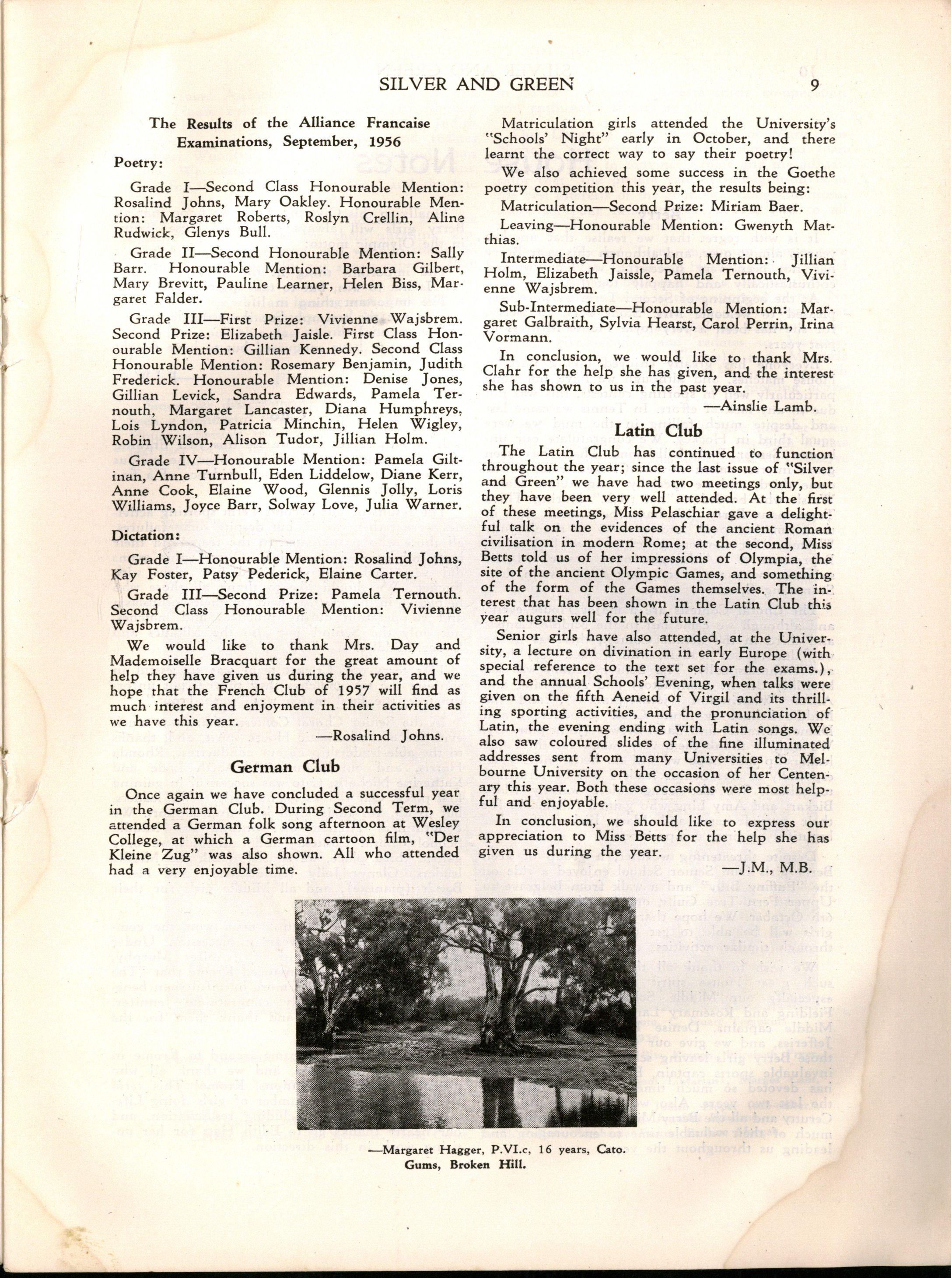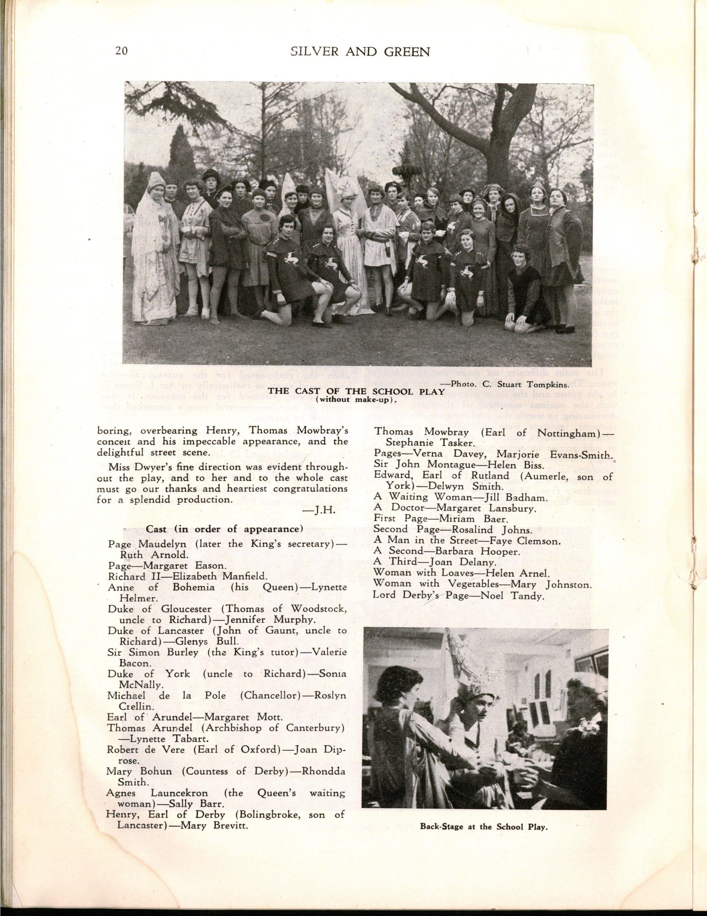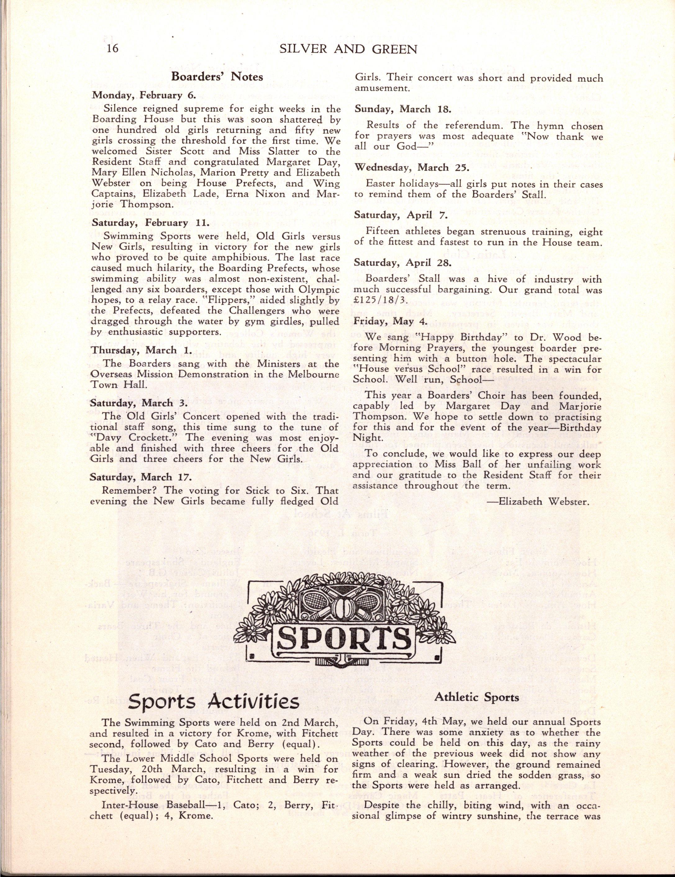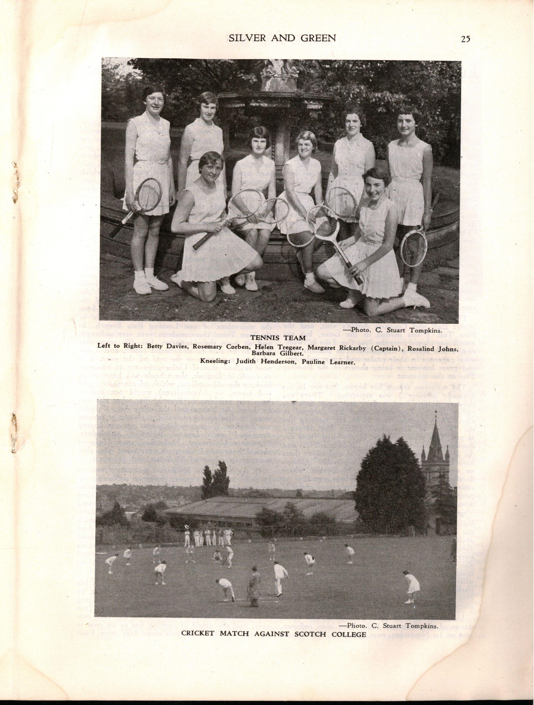 However, despite the necessity for curtailing the programme Speech Day was a great success Mrs H E Bolte, the wife of the Premier of Victoria, and an Old Collegian, presented the prizes and later entertained us with some delightful reminiscences of her schooldays at M.L.C