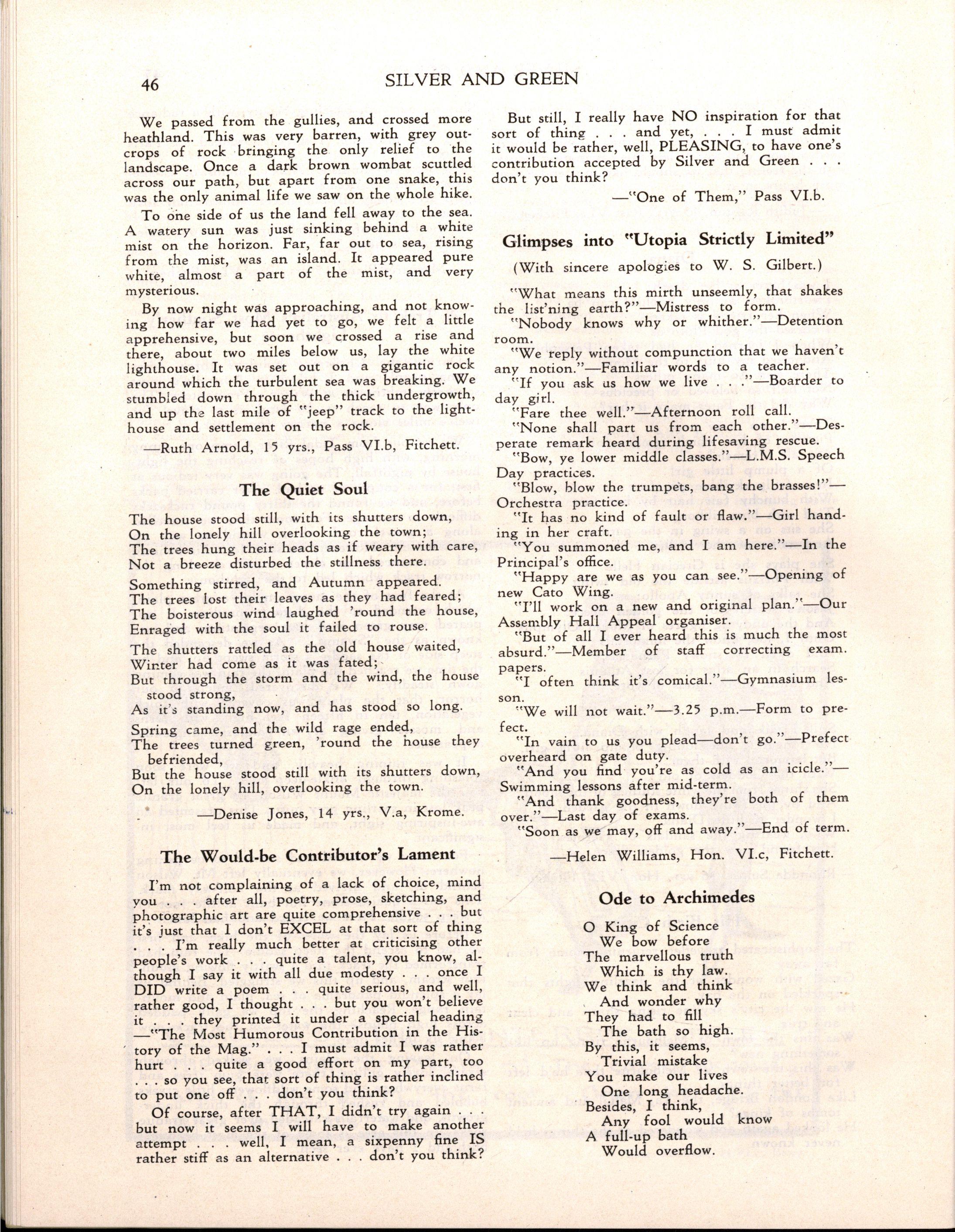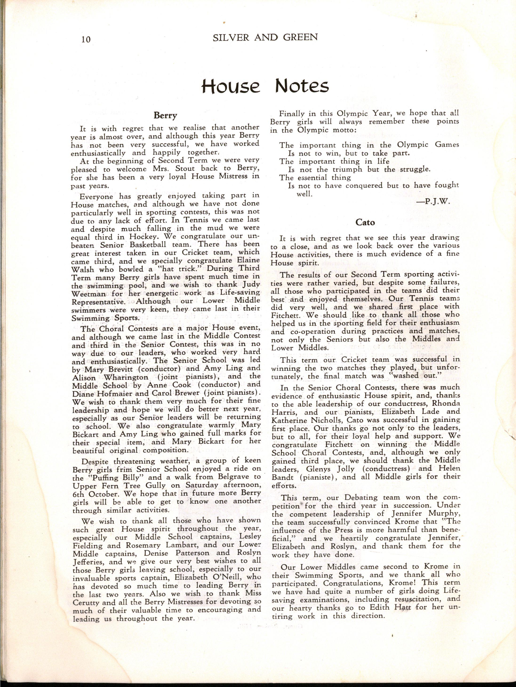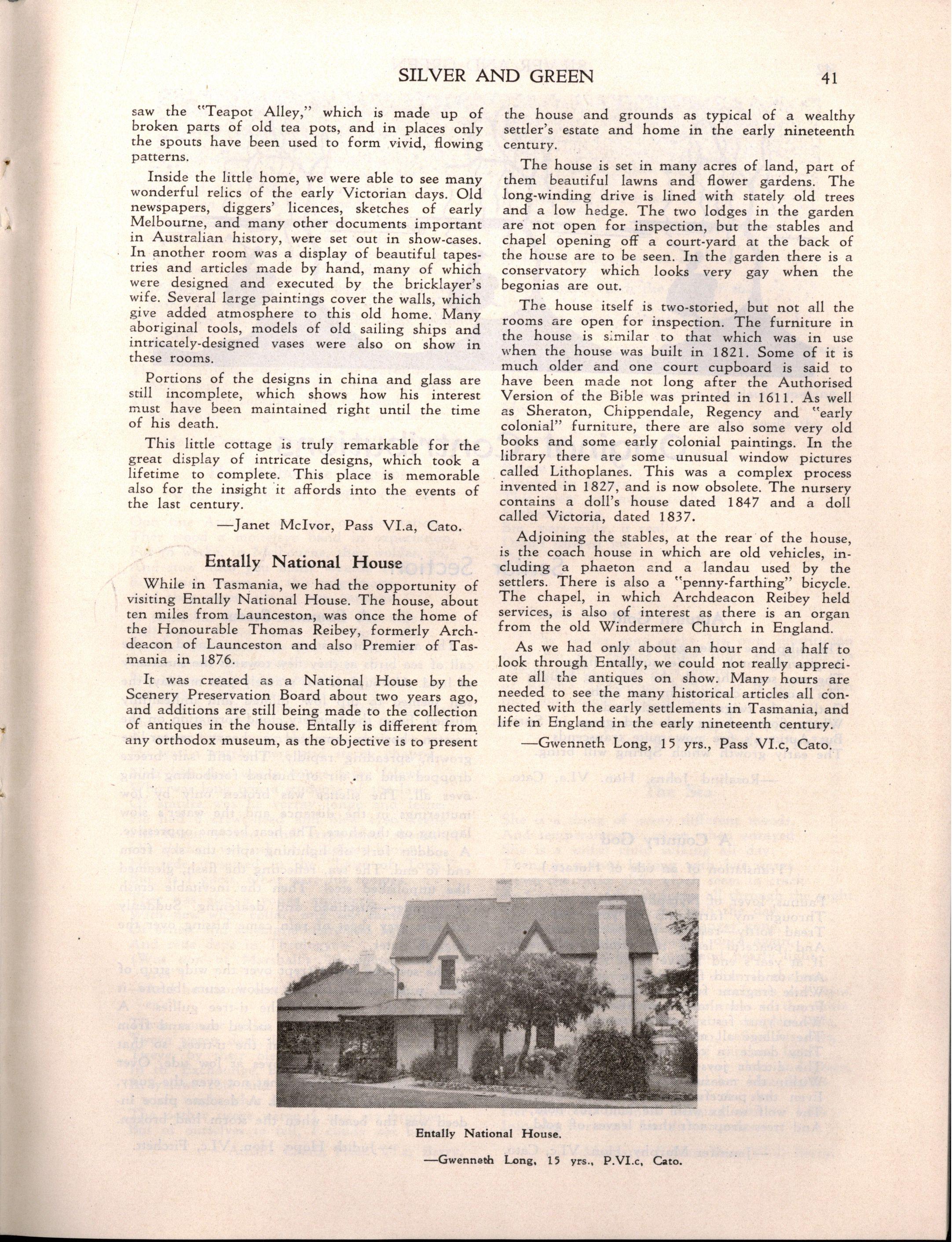 However, despite the necessity for curtailing the programme Speech Day was a great success Mrs H E Bolte, the wife of the Premier of Victoria, and an Old Collegian, presented the prizes and later entertained us with some delightful reminiscences of her schooldays at M.L.C