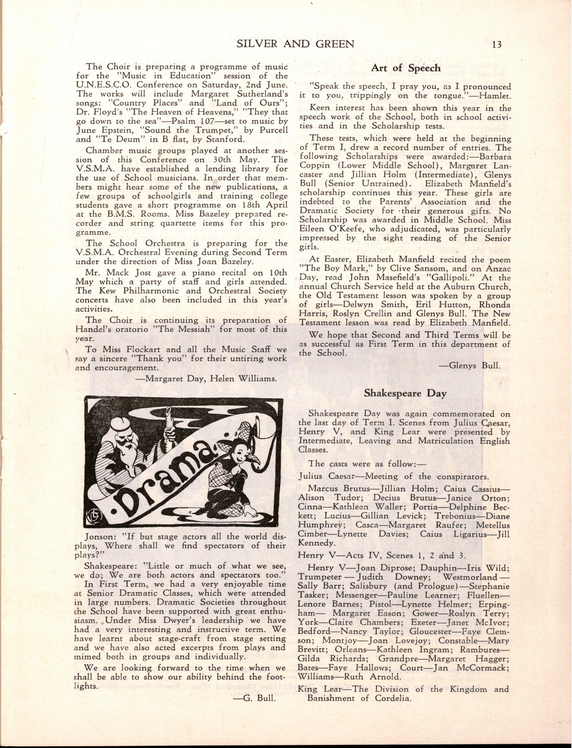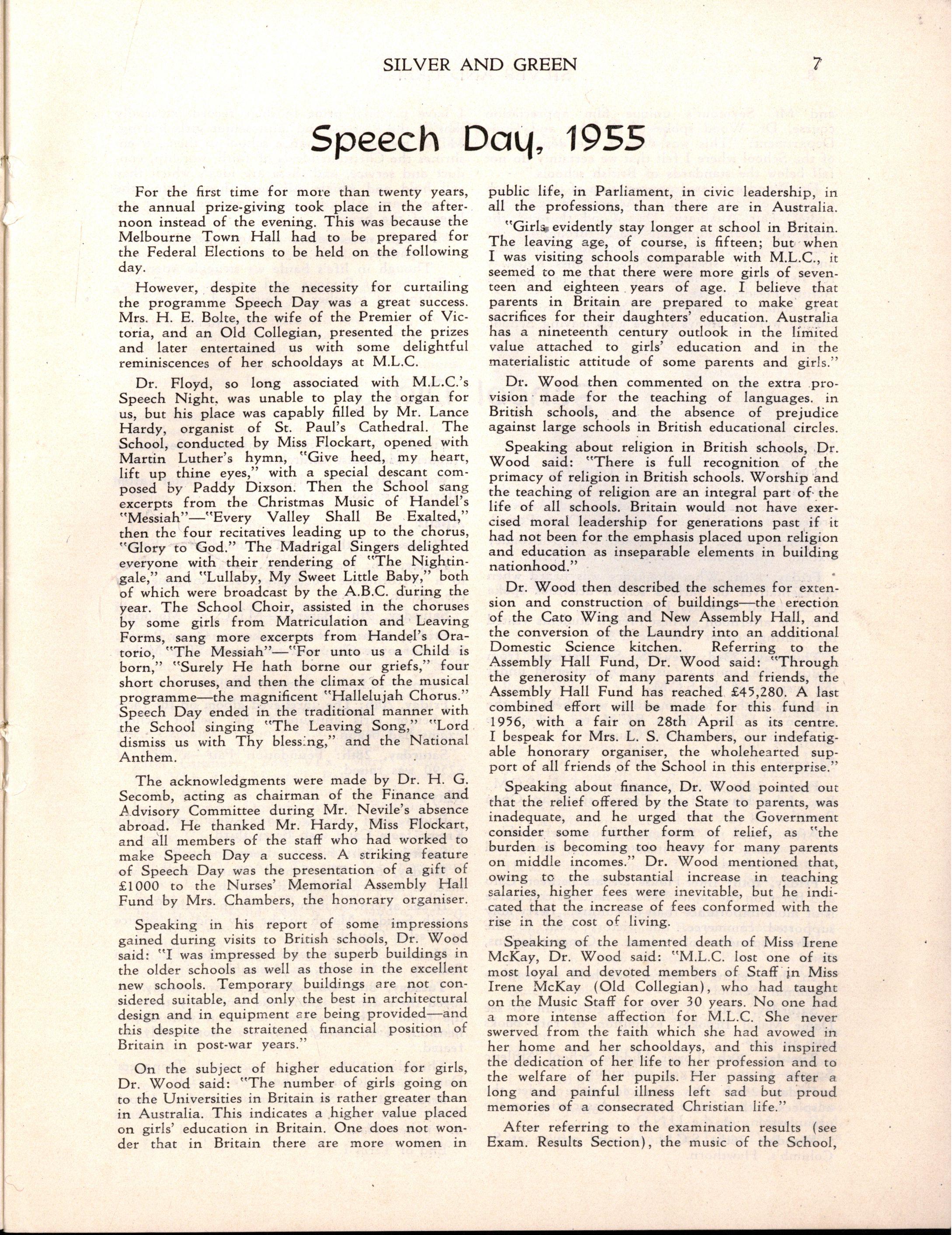 Dr. Floyd, so long associated with M.L.C.'s Speech Night, was unable to play the organ for us, but his place was capably filled by Mr. Lance Hardy, organist of St. Paul's Cathedral. The School, conducted by Miss Flockart, opened with Martin Luther's hymn, "Give heed, my heart, lift up thine eyes," with a special descant composed by Paddy Dixson Then the School sang excerpts from the Christmas Music of Handel's "Messiah"—"Every Valley Shall Be Exalted," then the four recitatives leading up to the chorus, "Glory to God." The Madrigal Singers delighted everyone with their rendering of "The Nightingale," and "Lullaby, My Sweet Little Baby," both of which were broadcast by the A.B.C during the year The School Choir, assisted in the choruses by some girls from Matriculation and Leaving Forms, sang more excerpts from Handel's Oratorio, "Th e Messiah"—"For unto us a Child is born," "Surely He hath borne our griefs," four short choruses, and then the climax of the musical programme—the magnificent "Hallelujah Chorus.' Speech Day ended in the traditional manner with the School singing "The Leaving Song," "Lord dismiss us with Thy blessing," and the National Anthem.