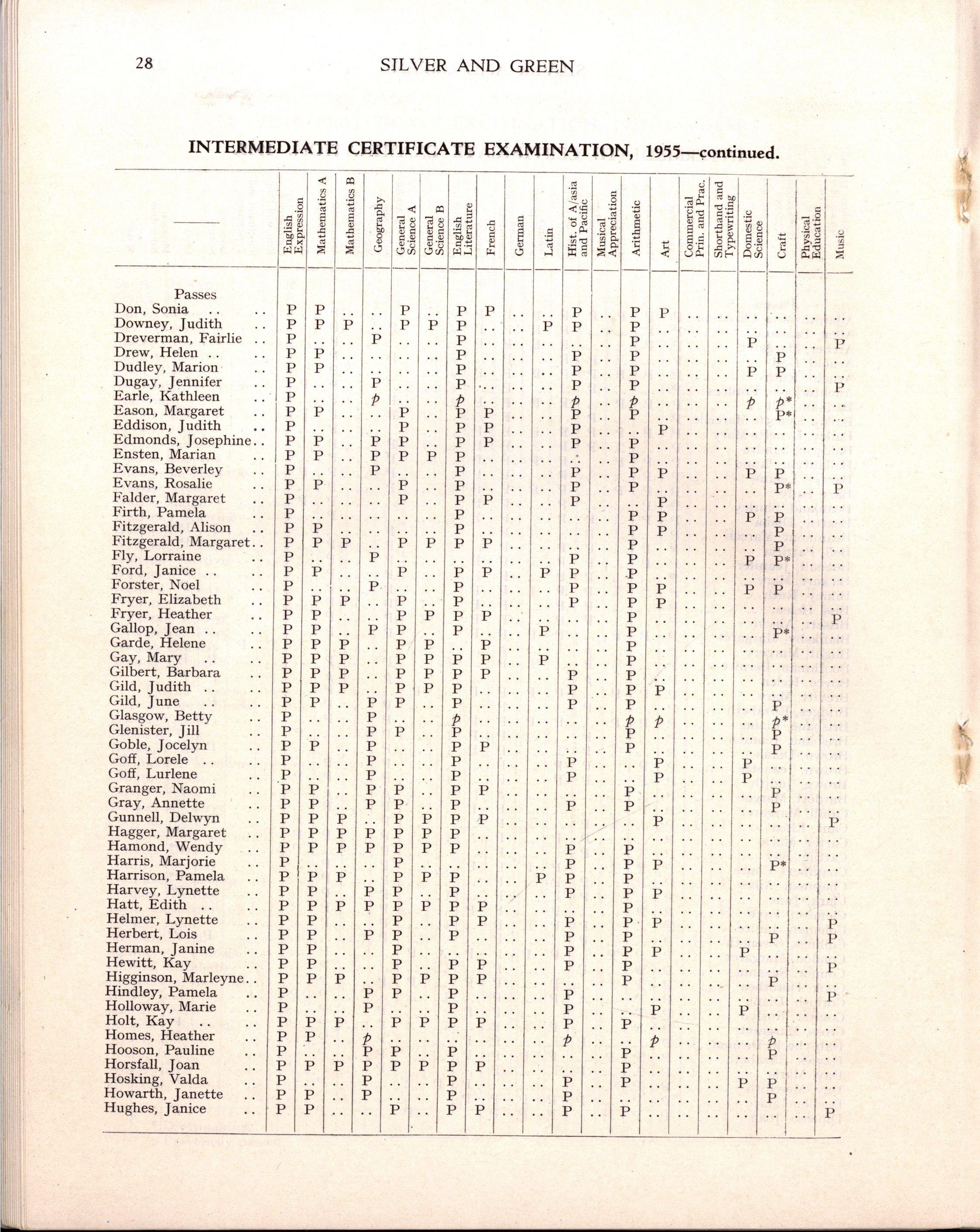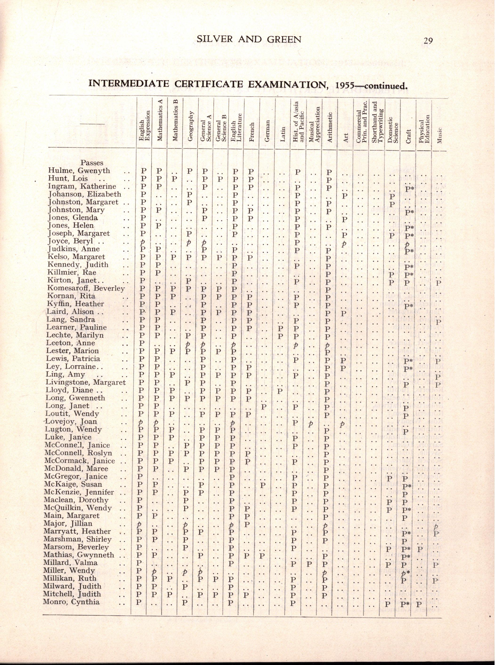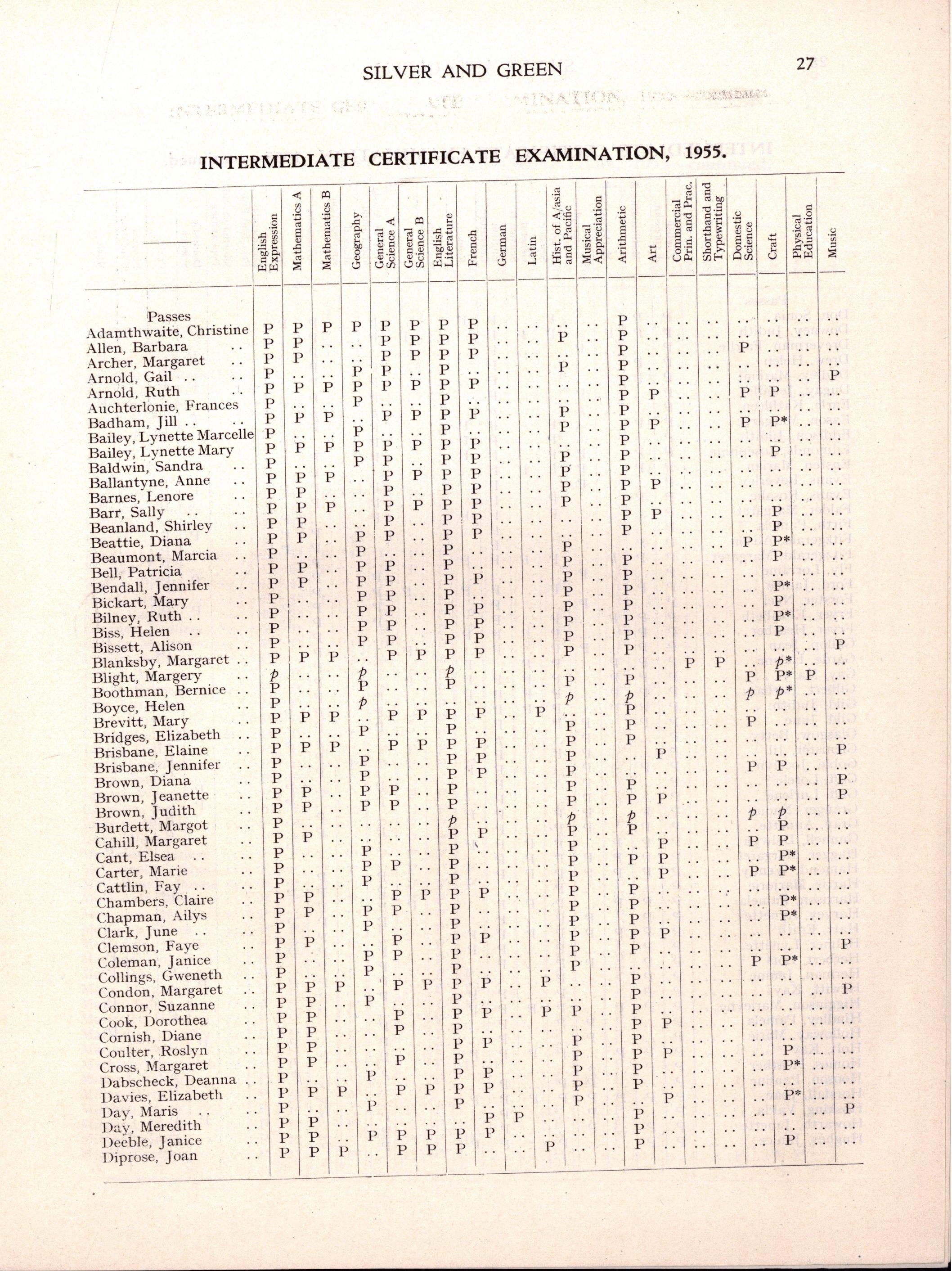 Diploma B: Margery Blight, Faye Bolton, Helen Boyce, Gail Buchanan, Margot Burdett, Noelle Calderwood, Judith Charles, Judith Devine, Gillian Gaylard, Betty Glasgow, Beverley Grieve, Julienne Griffiths, Margaret Grover, Jenette Hammon, Julienne Harry, Noelene Heard, Lorraine Hodge, Beryl Joyce, Gwenda Lee, Deirdre Matheson, Ann Miller, Judith Miller, Margaret Newbound, June Oatley, Lesley Parsons, Joan Pepper, Kathleen Roberts, Helen Ross, Ann Rumpf, Barbara Sleep, Julie Smyth, Joy Stephenson, Valerie Suter, Ann Tanner, Celia Tasker, Faye Trebilcock, Rae Trinnick, Marcia Walker, Faye Watt, Helen Wilson
