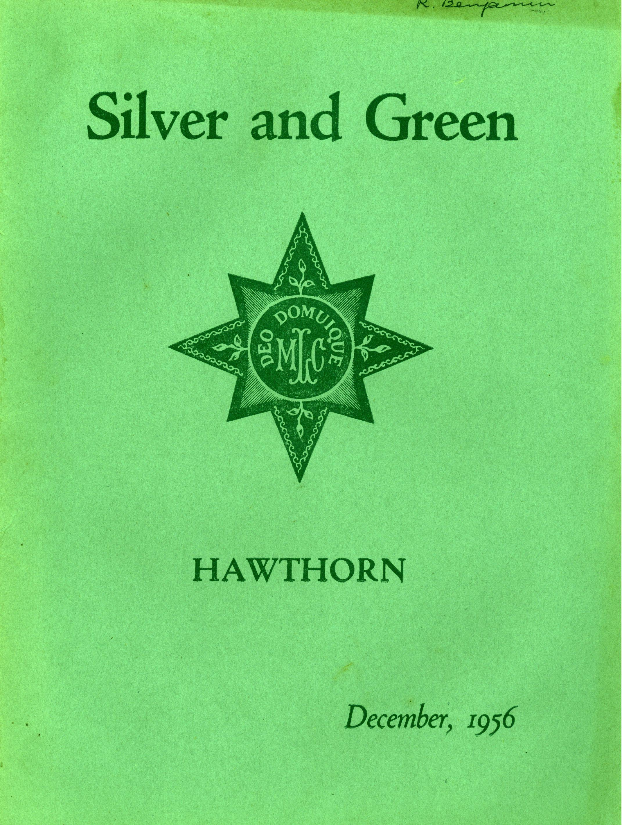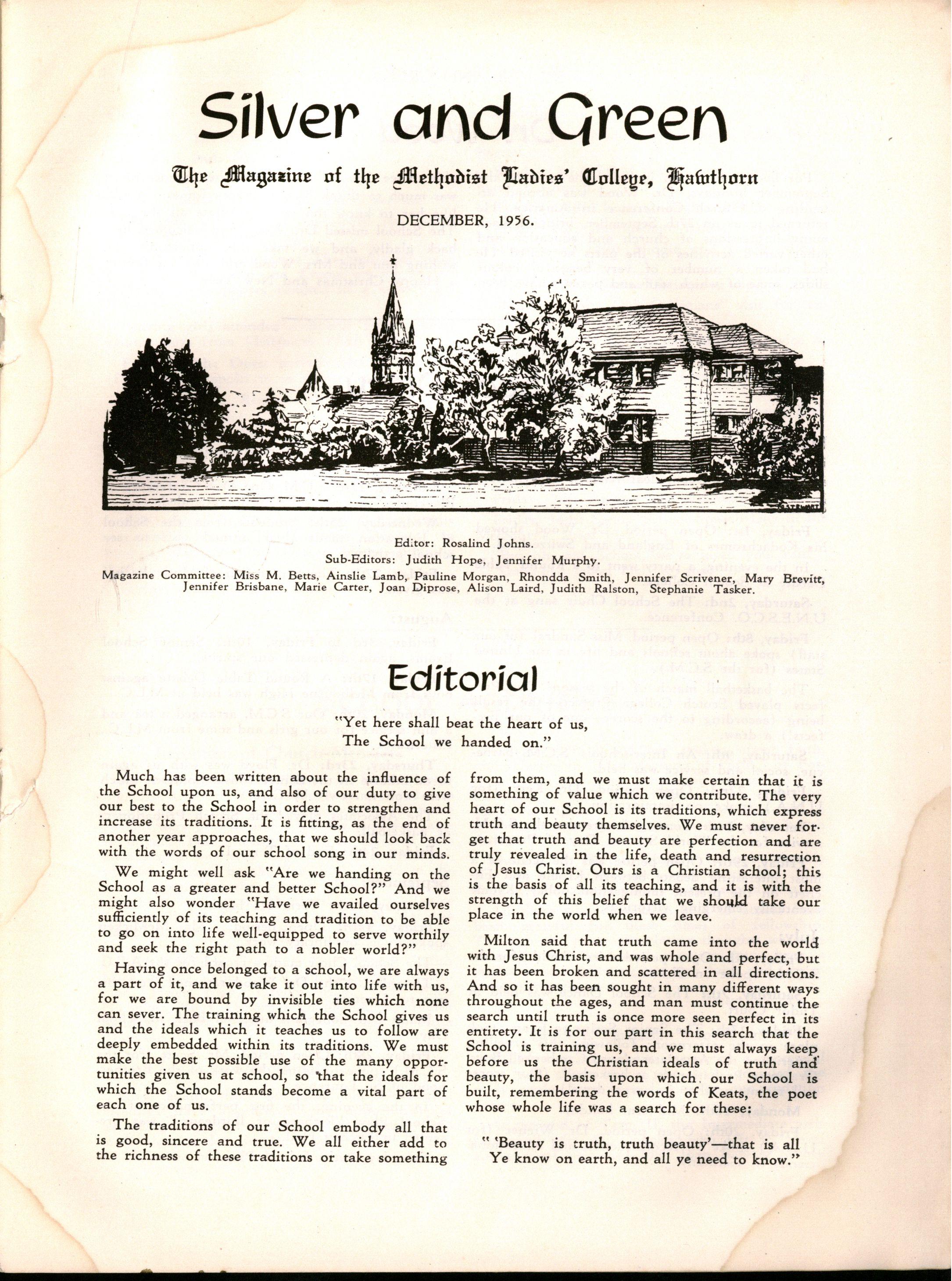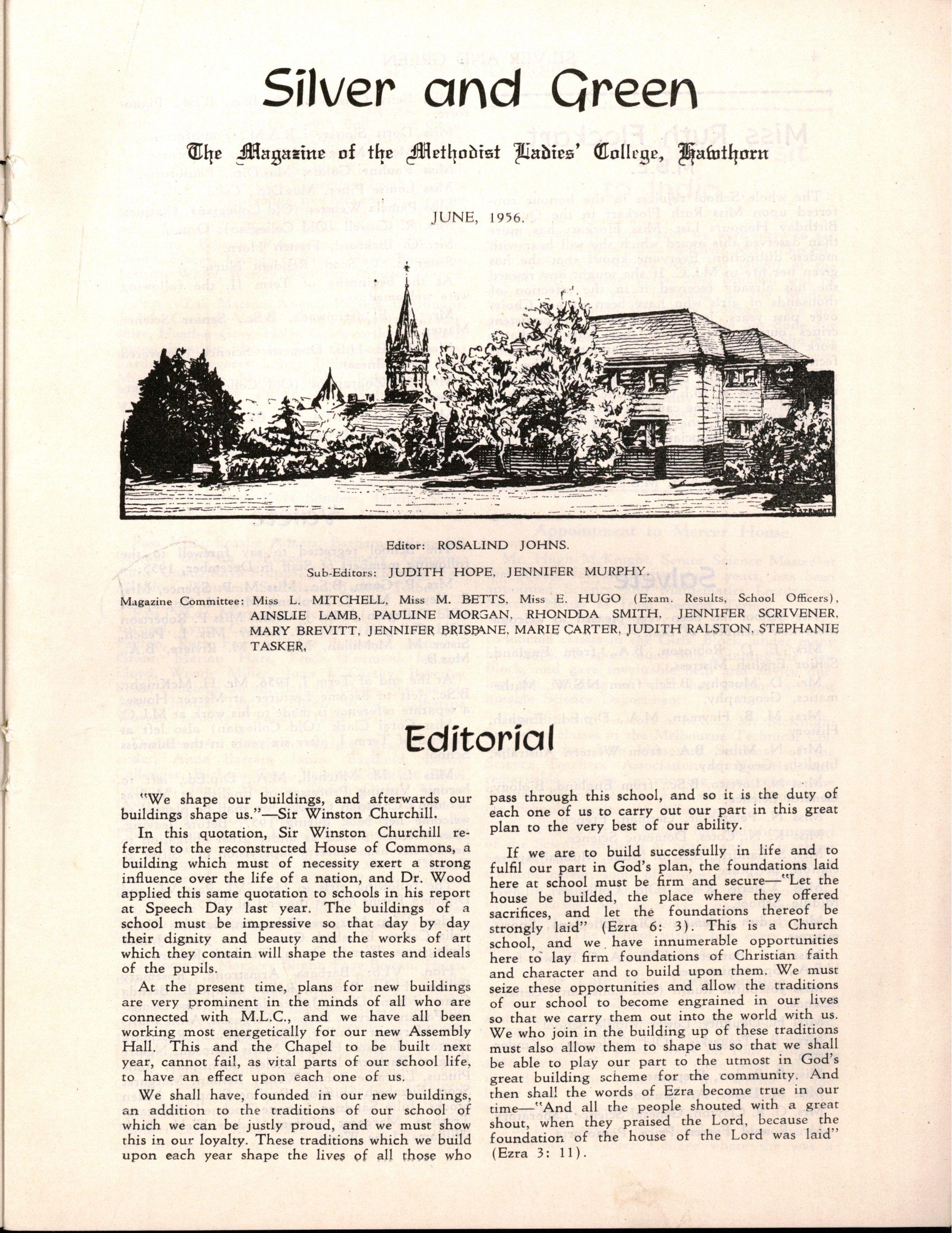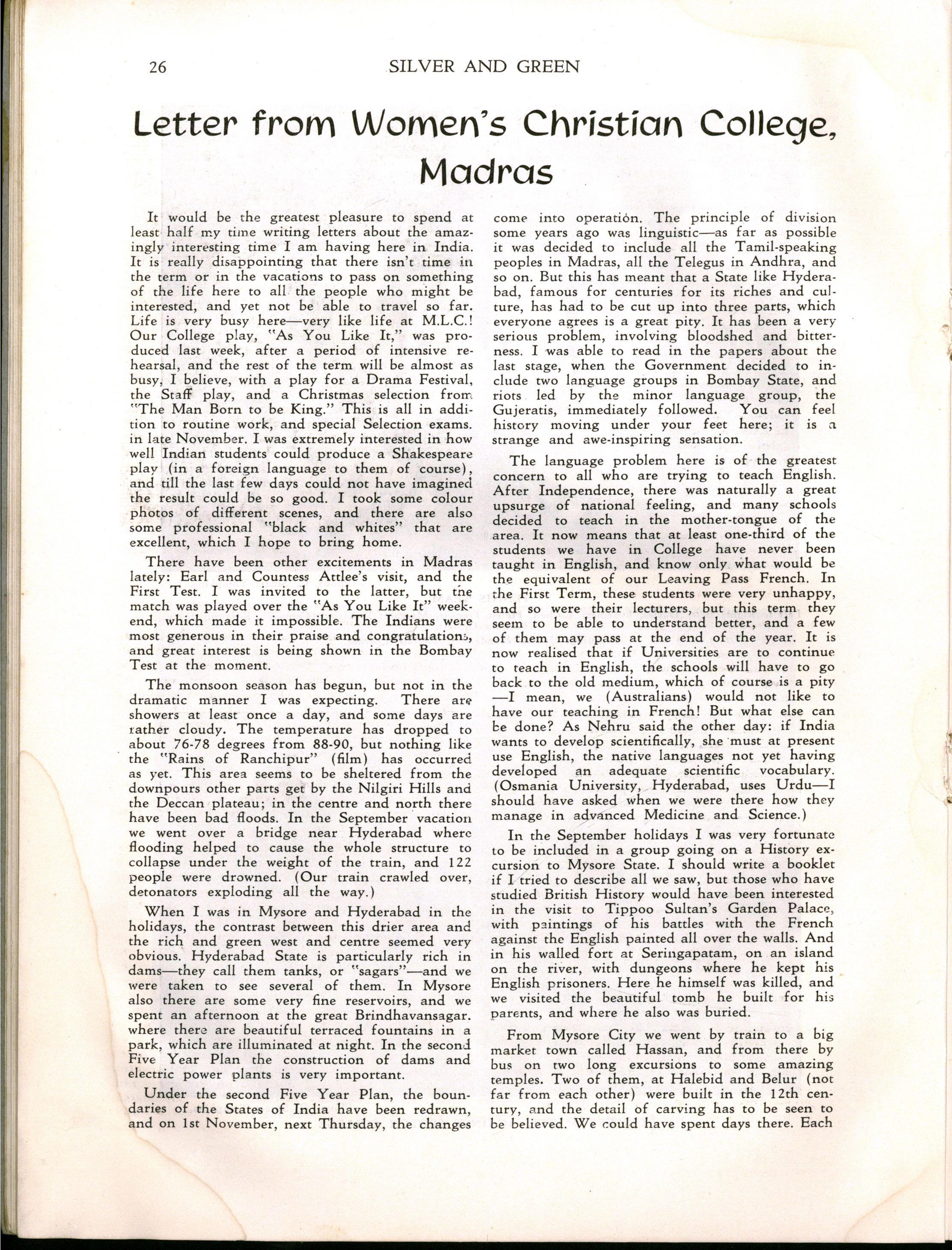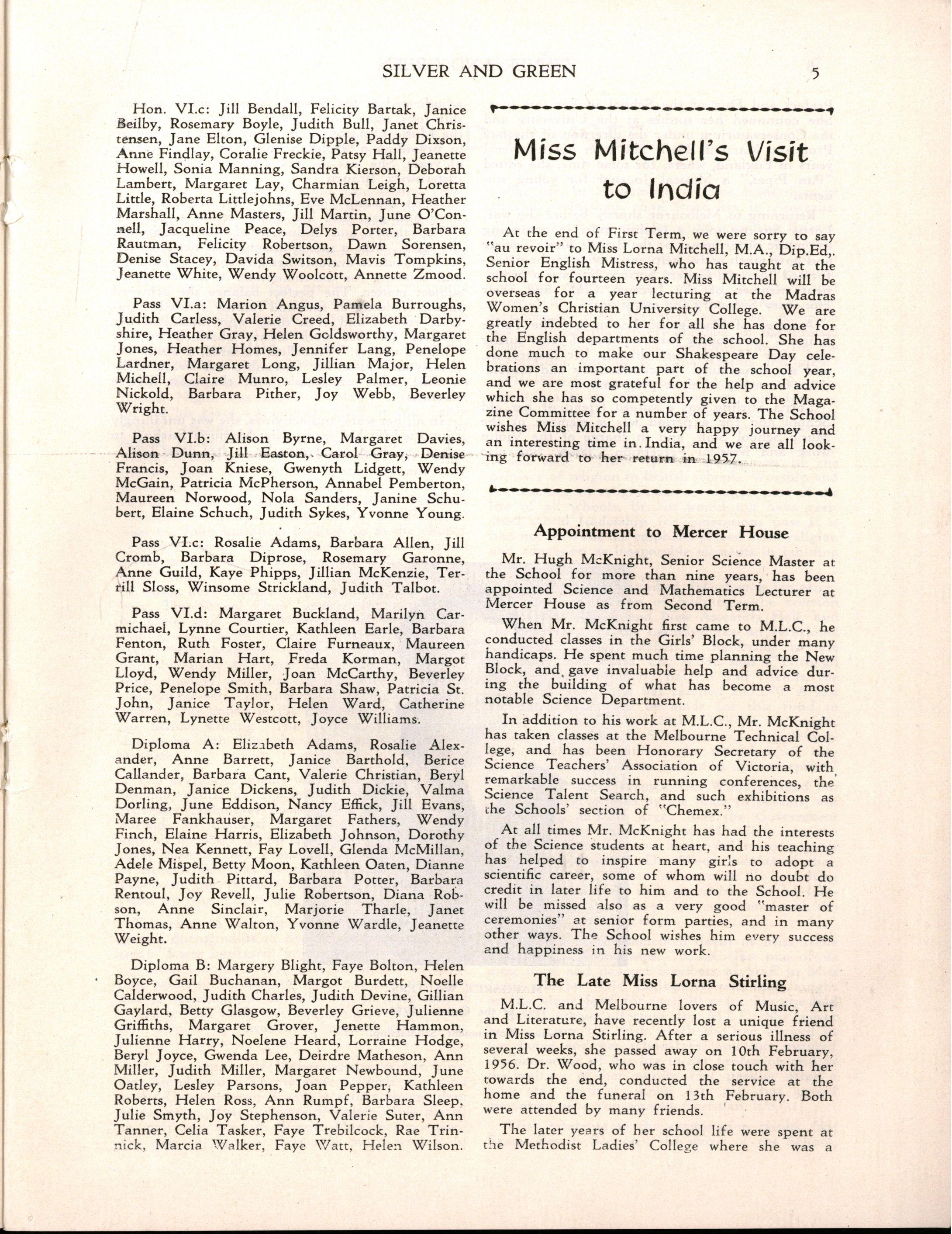 Miss L. M. Mitchell, M.A., Dip.Ed., left to become Visiting Professor of English at Madras Women's Christian College; we shall be pleased to welcome her back during 1957. Before leaving, Miss Mitchell placed us under great obligation to her by her usual careful supervision of "Silver & Green."