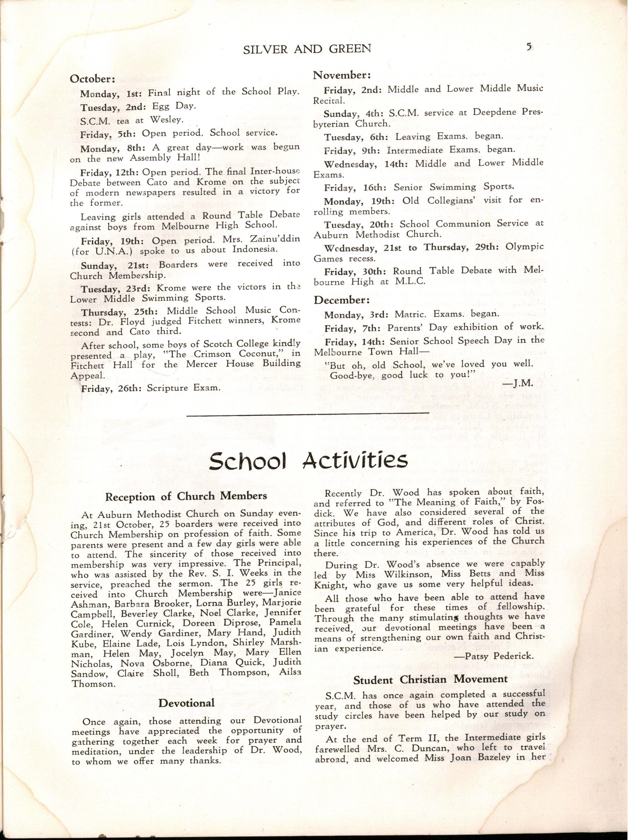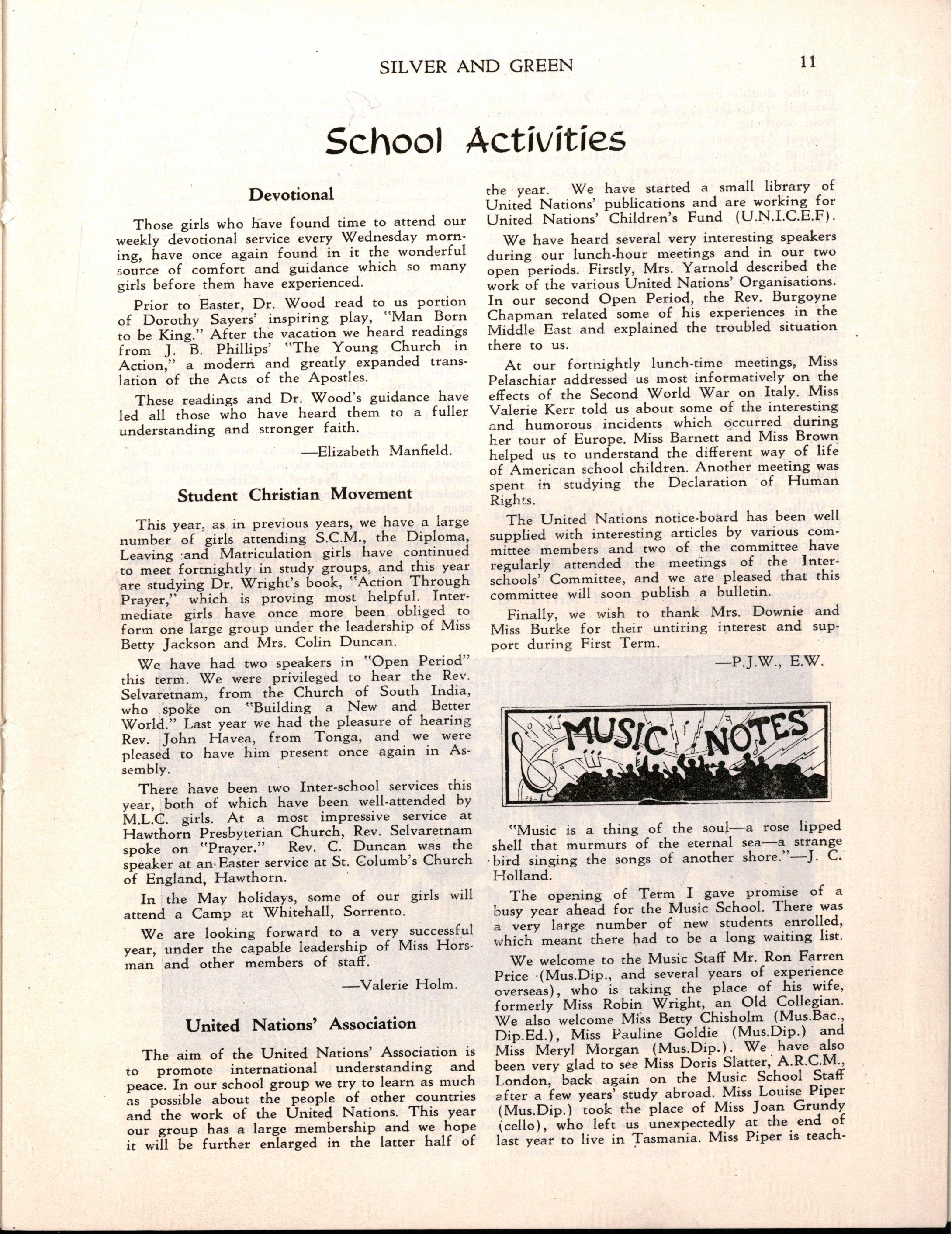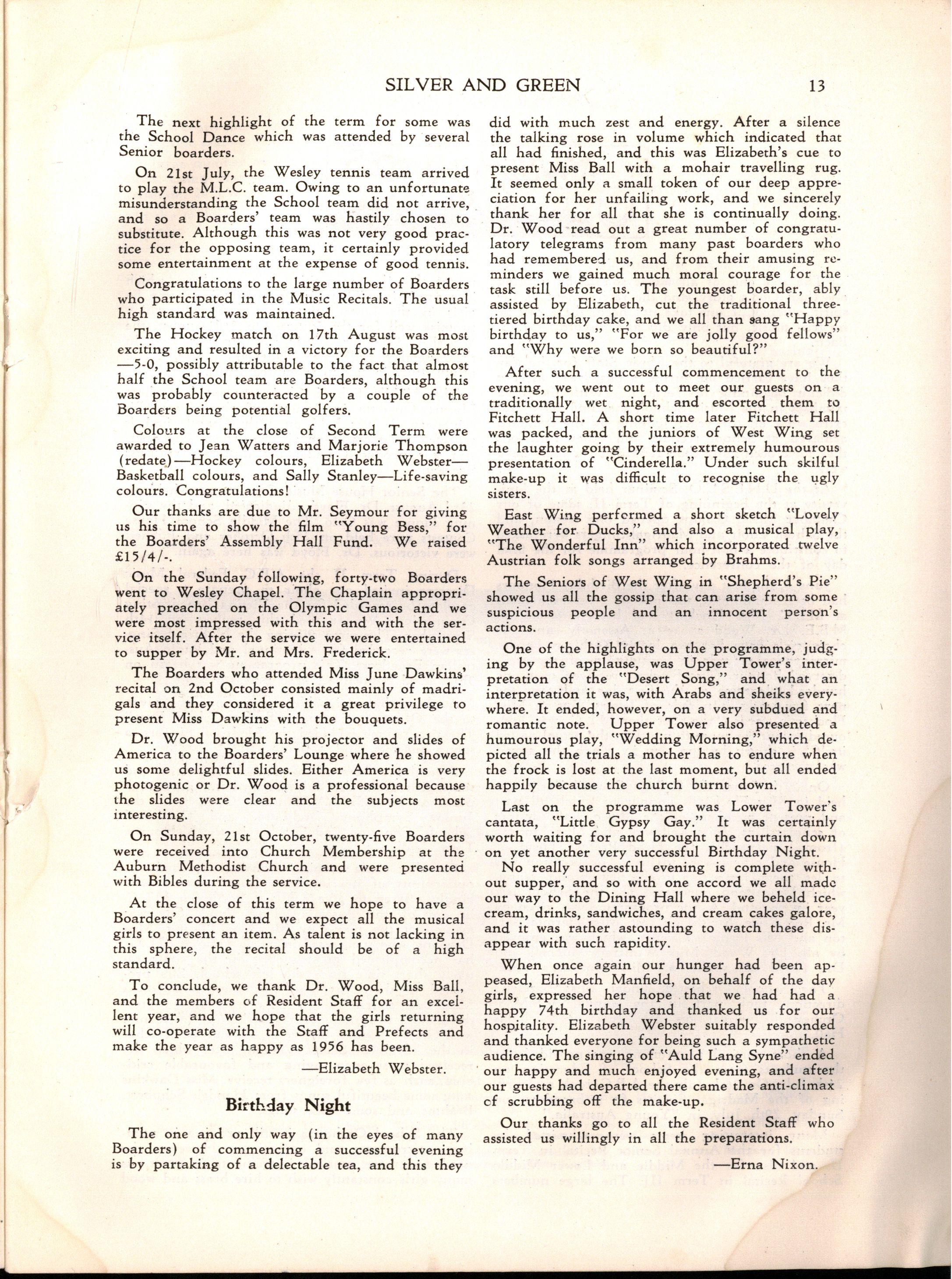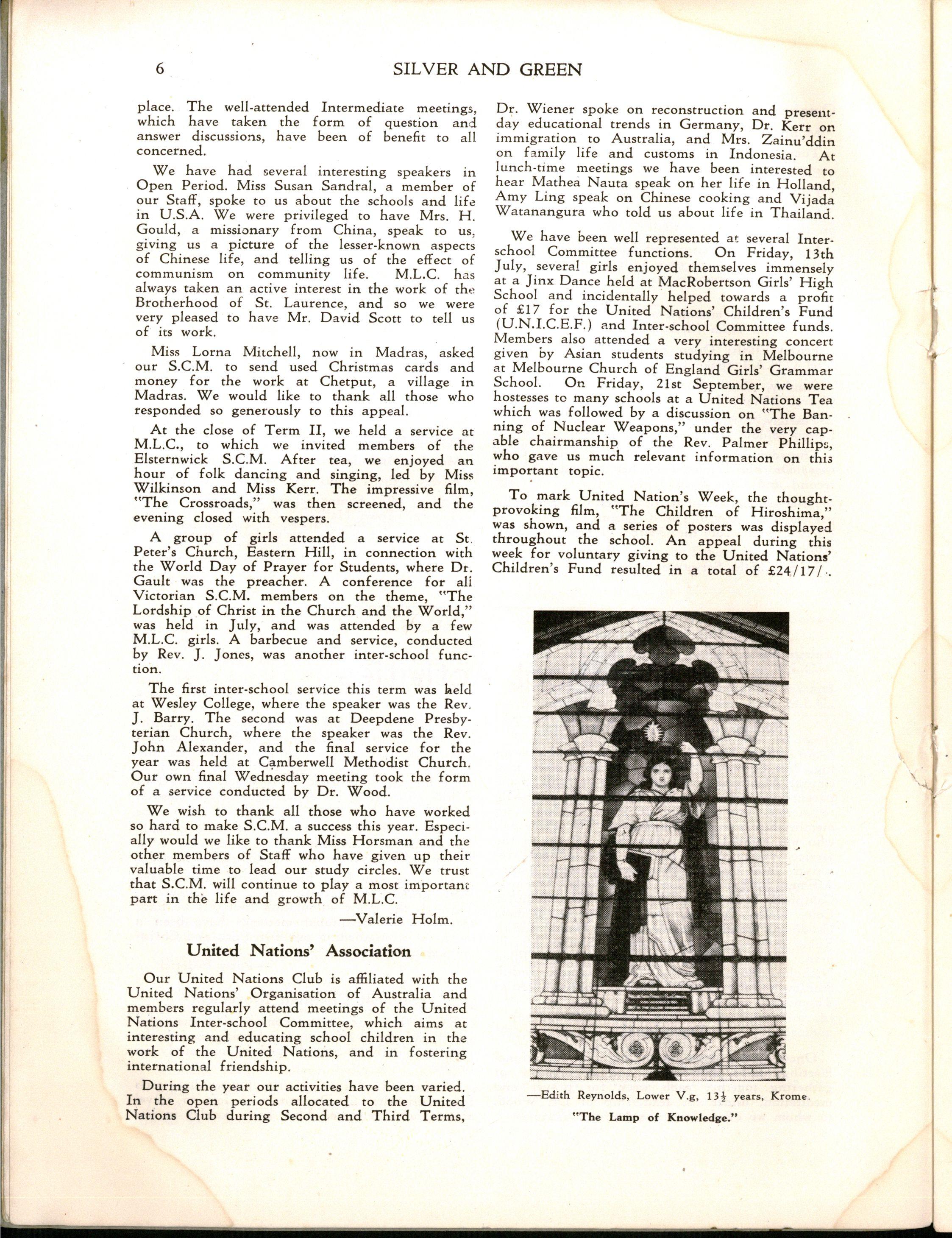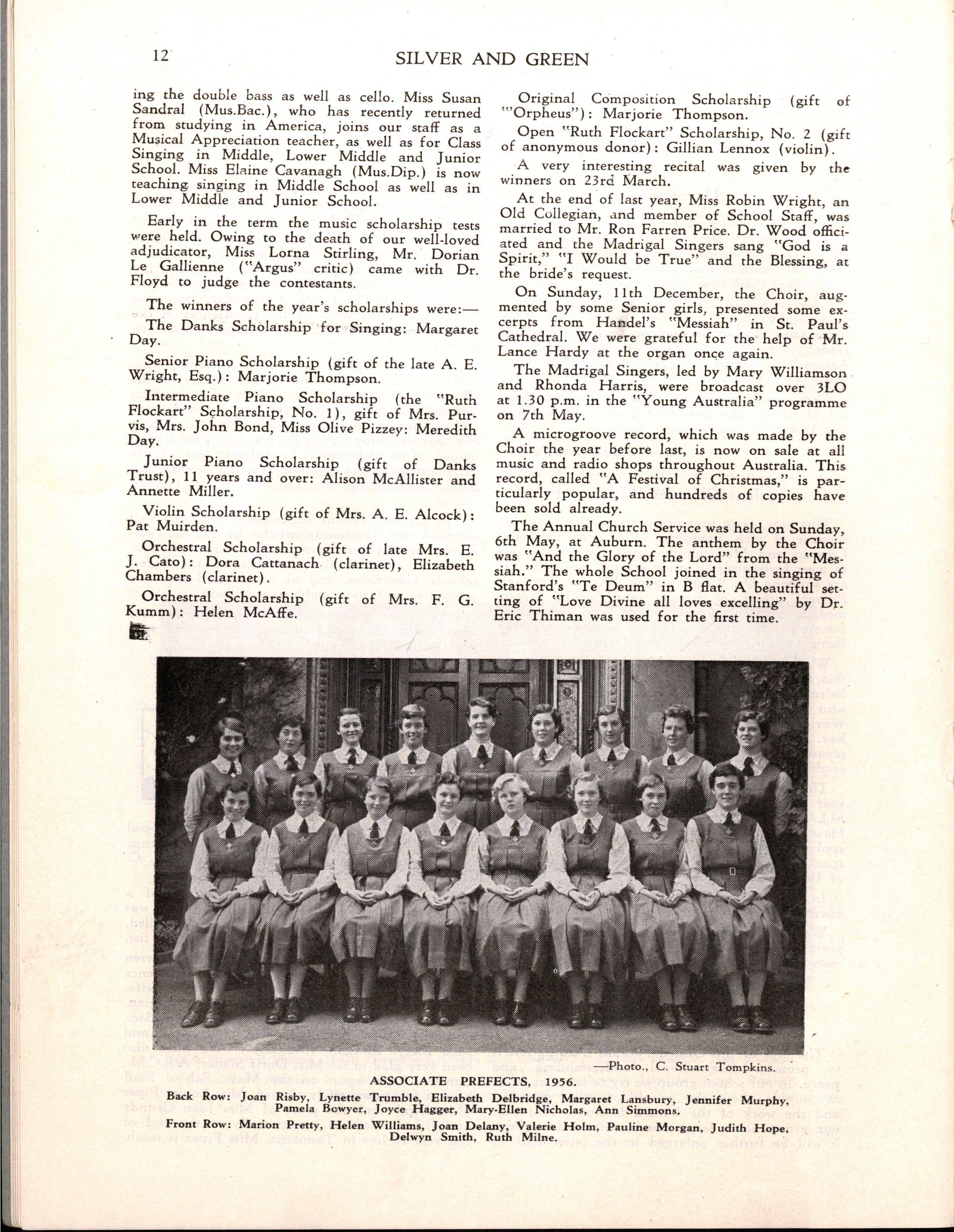 Miss L. M. Mitchell, M.A., Dip.Ed., left to become Visiting Professor of English at Madras Women's Christian College; we shall be pleased to welcome her back during 1957. Before leaving, Miss Mitchell placed us under great obligation to her by her usual careful supervision of "Silver & Green."