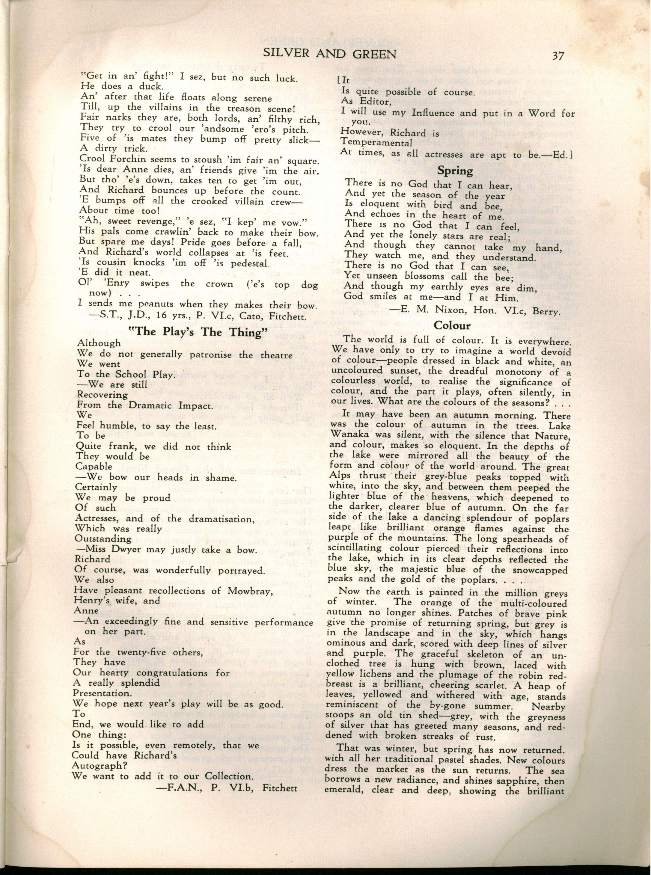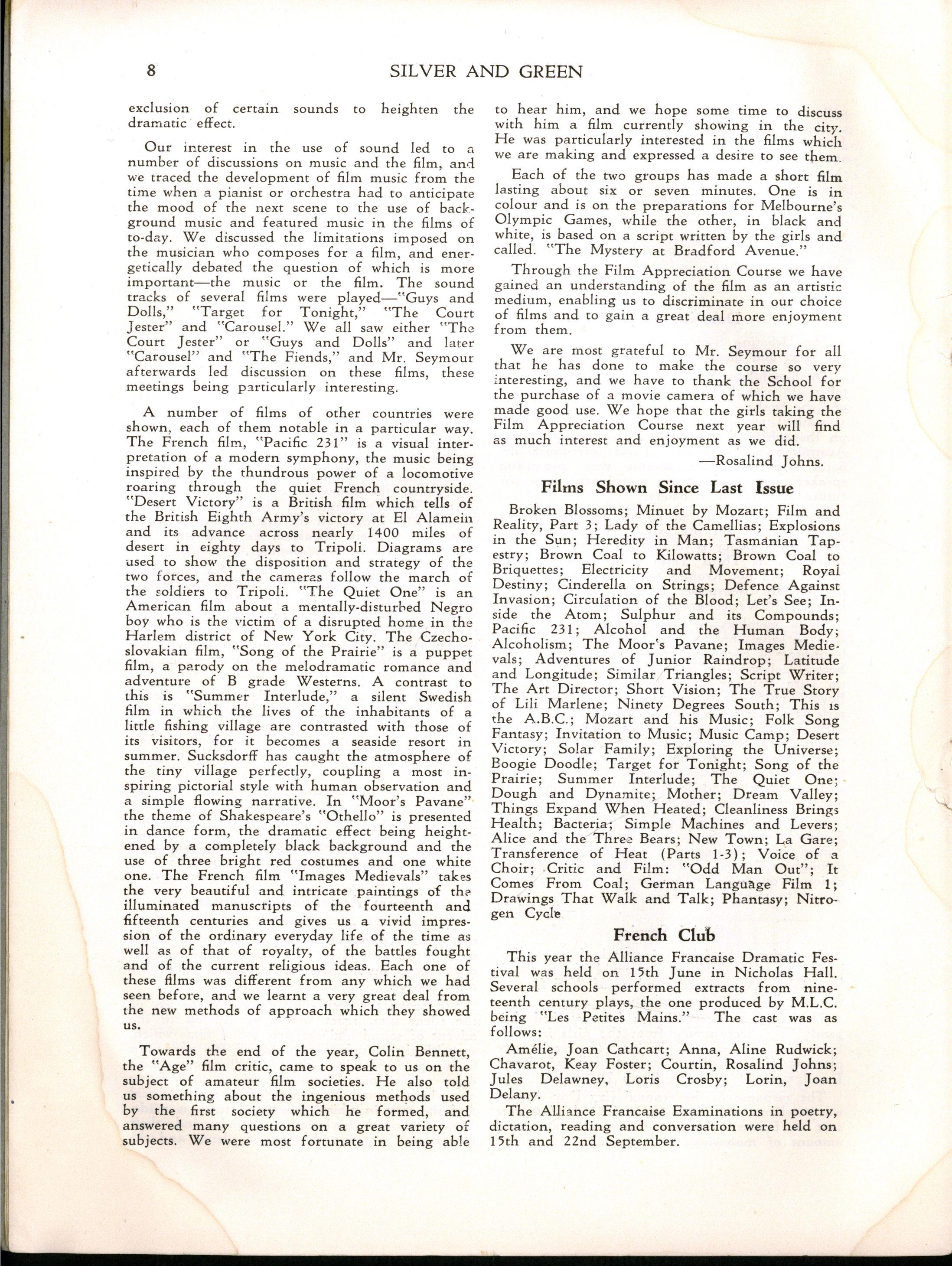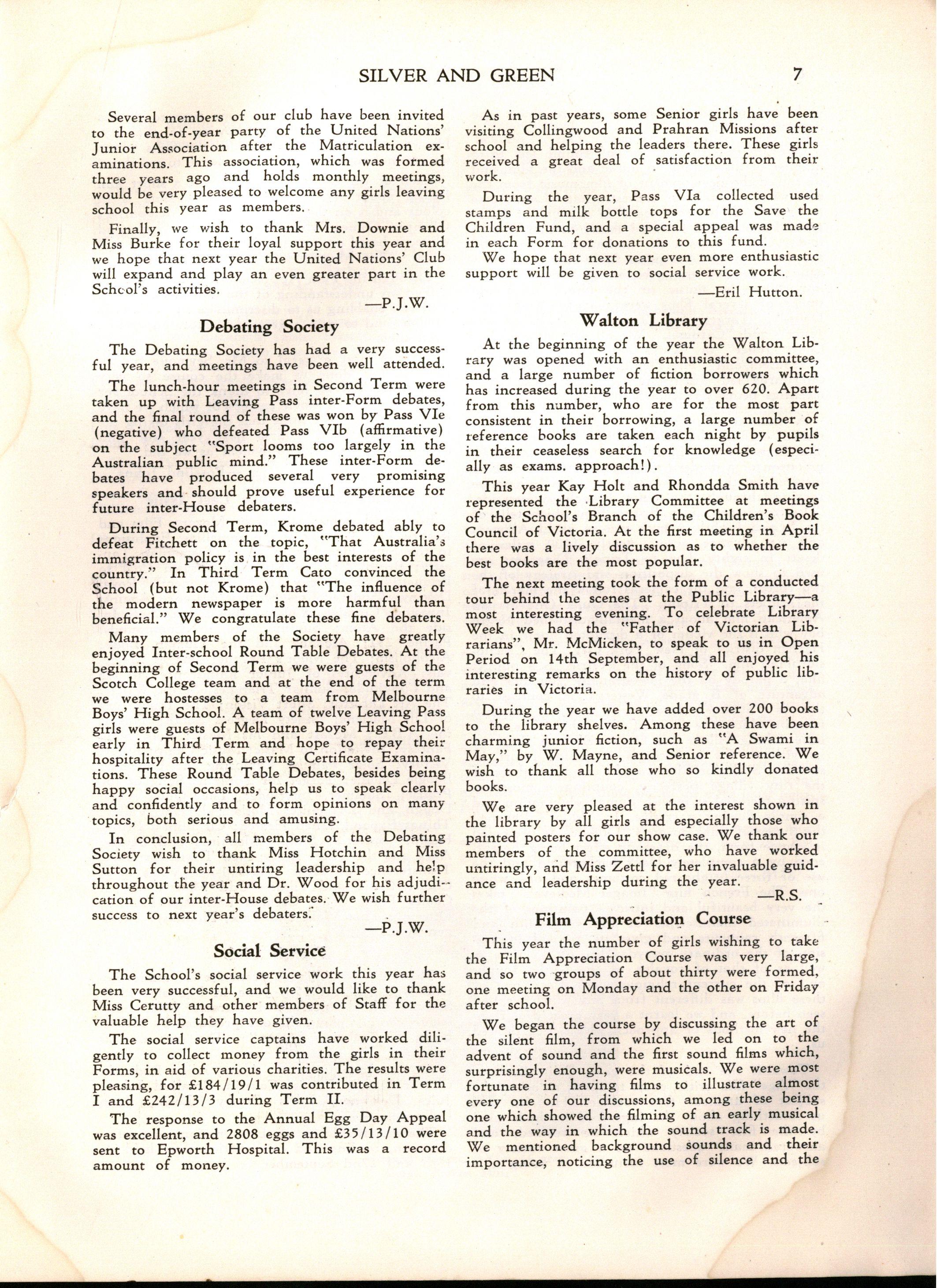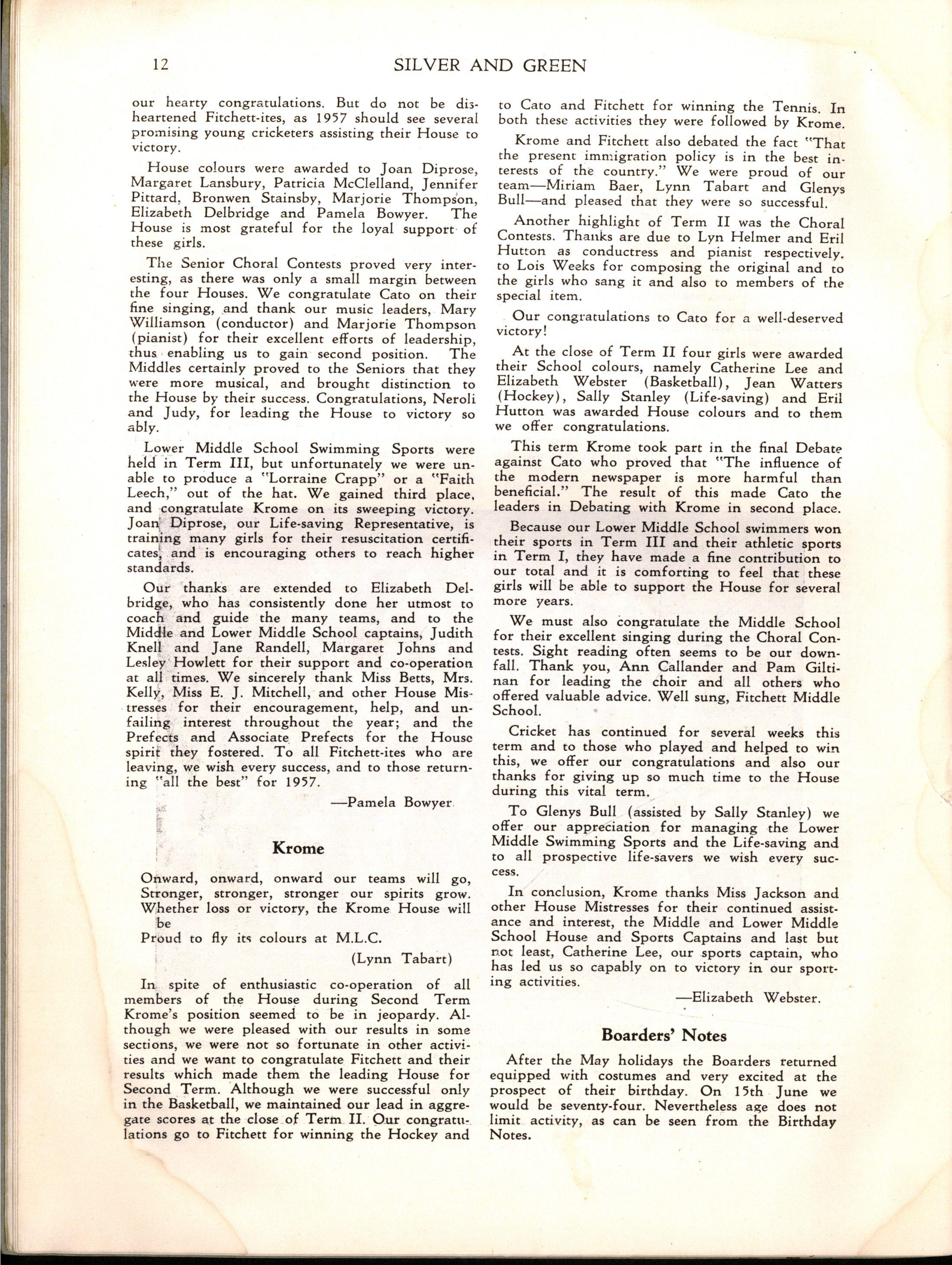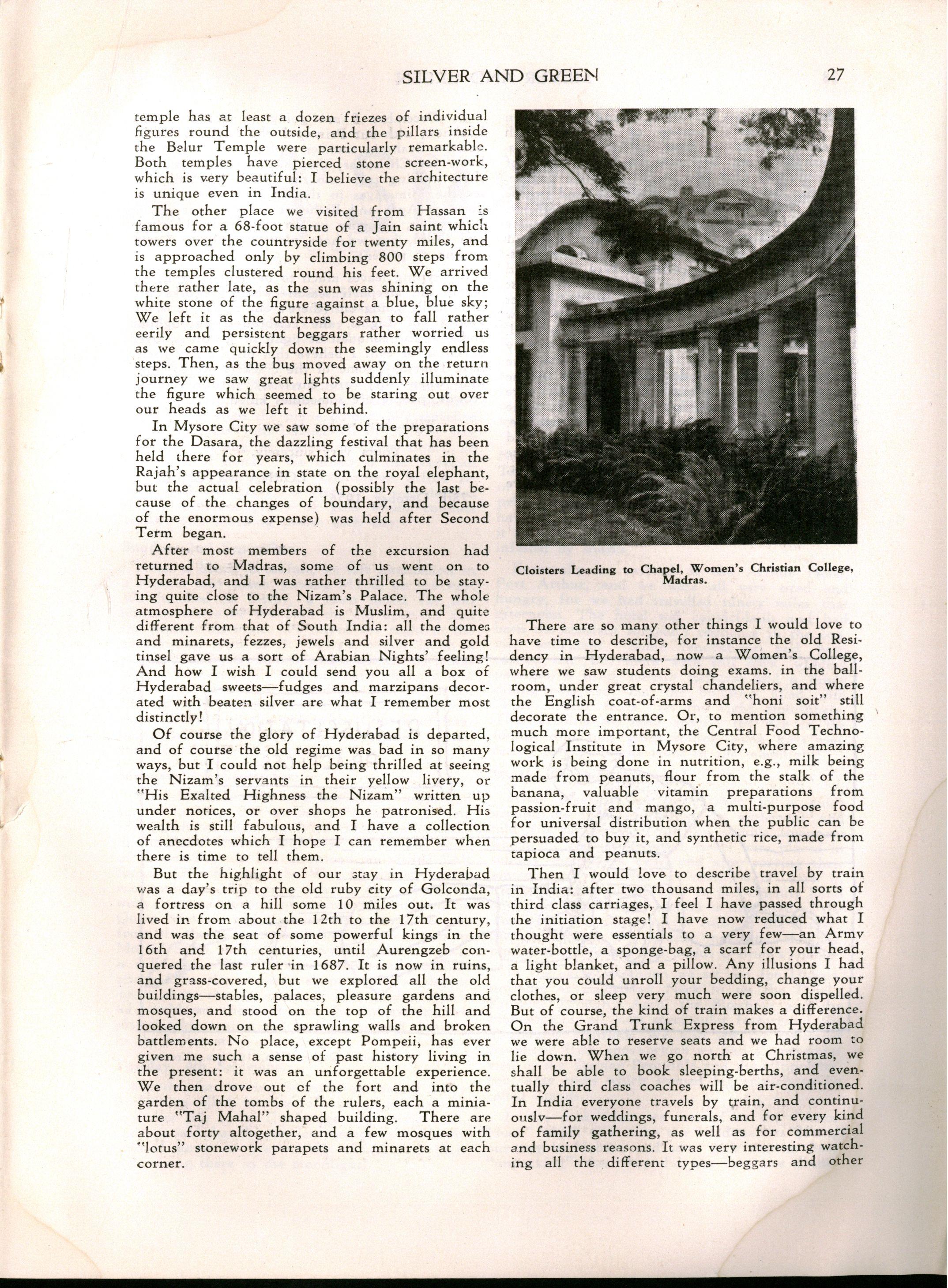 Miss L. M. Mitchell, M.A., Dip.Ed., left to become Visiting Professor of English at Madras Women's Christian College; we shall be pleased to welcome her back during 1957. Before leaving, Miss Mitchell placed us under great obligation to her by her usual careful supervision of "Silver & Green."