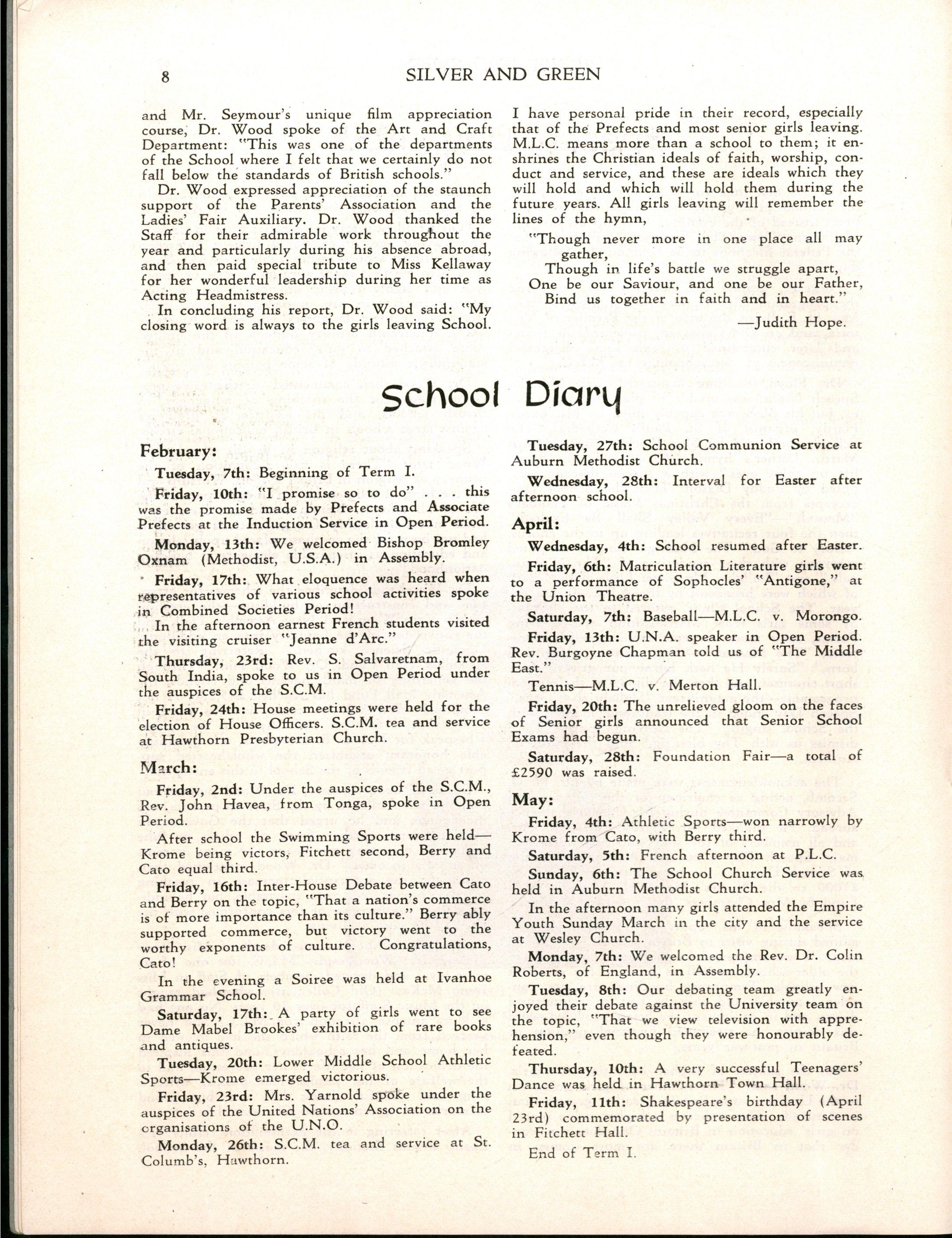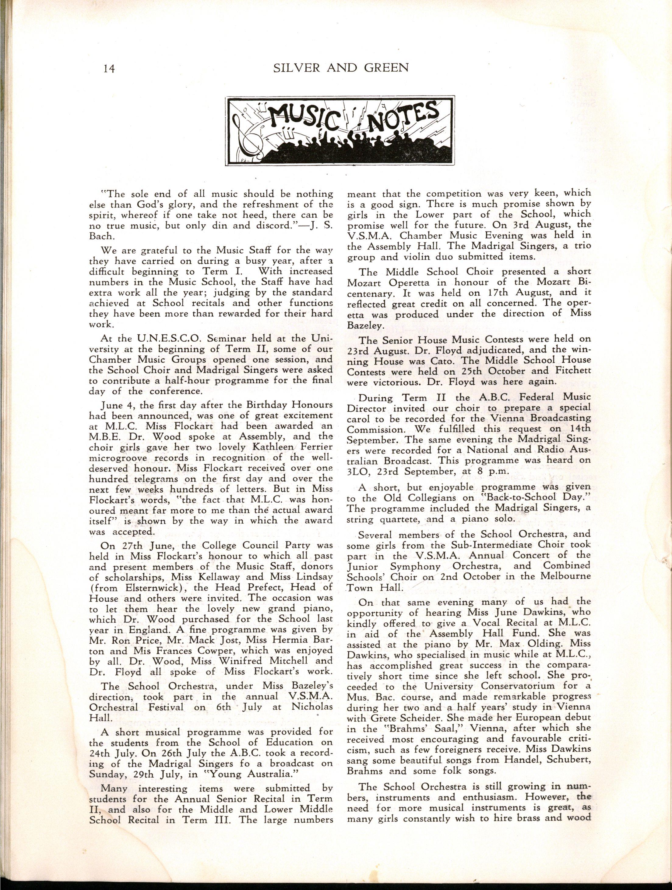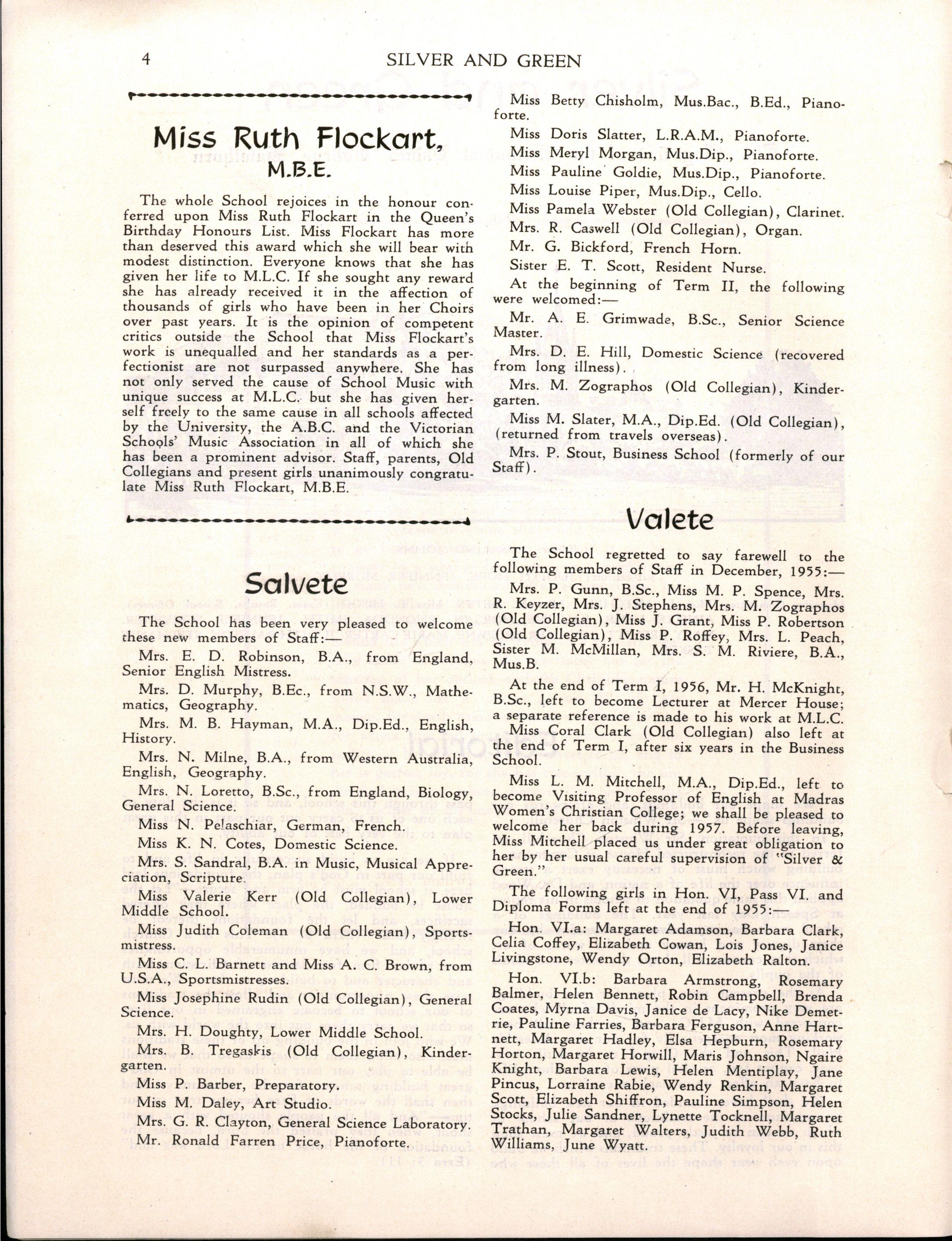 The whole School rejoices in the honour conferred upon Miss Ruth Flockart in the Queen's Birthday Honours List Miss Flockart has more than deserved this award which she will bear with modest distinction Everyone knows that she has given her life to M.L.C If she sought any reward she has already received it in the affection of thousands of girls who have been in her Choirs over past years It is the opinion of competent critics outside the School that Miss Flockart's work is unequalled and her standards as a perfectionist are not surpassed anywhere She has not only served the cause of School Music with unique success at M.L.C but she has given herself freely to the same cause in all schools affected by the University, the A.B.C and the Victorian Schopls' Music Association in all of which she has been a prominent advisor. Staff, parents, Old Collegians and present girls unanimously congratulate Miss Ruth Flockart, M.B.E.