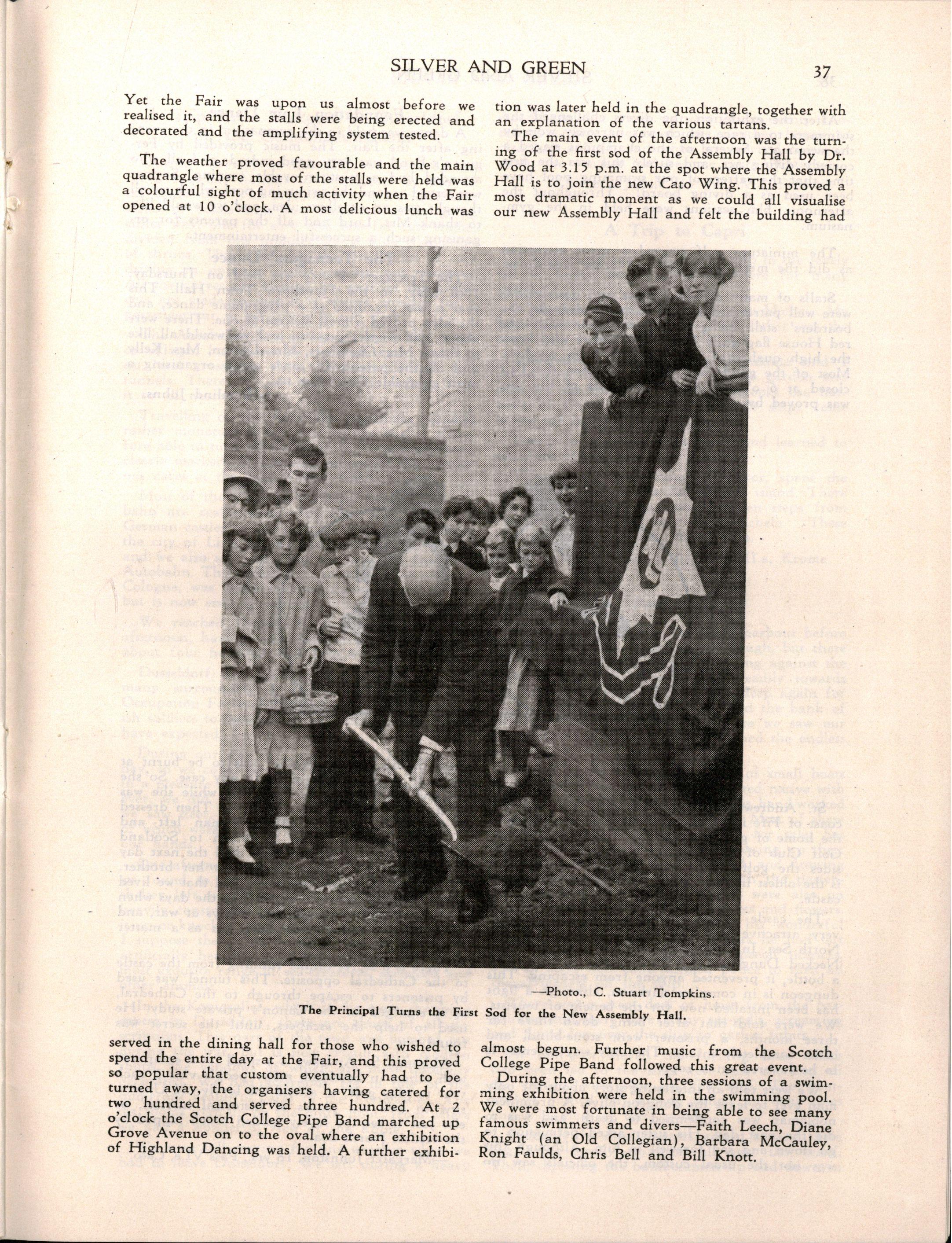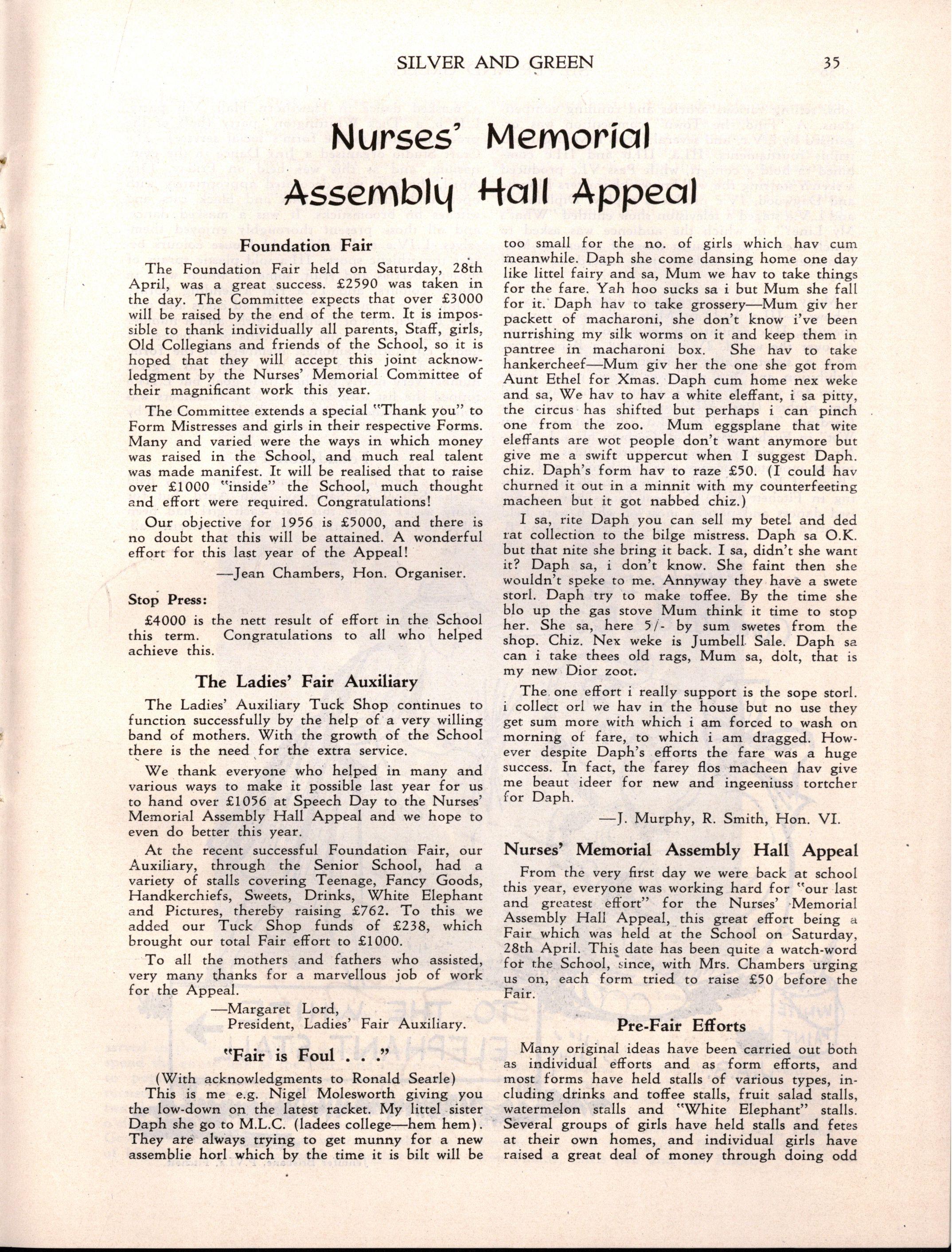Dr. Woo d then described the schemes for extension and construction of buildings—the erection of the Cato Wing and New Assembly Hall, and the conversion of the Laundry into an additional Domestic Science kitchen Referring to the Assembly Hall Fund, Dr Woo d said: "Through the generosity of many parents and friends, the Assembly Hall Fund has reached £45,280 A last combined effort will be made for this fund in 1956, with a fair on 28th April as its centre I bespeak for Mrs L S Chambers, our indefatigable honorary organiser, the wholehearted support of all friends of the School in this enterprise."