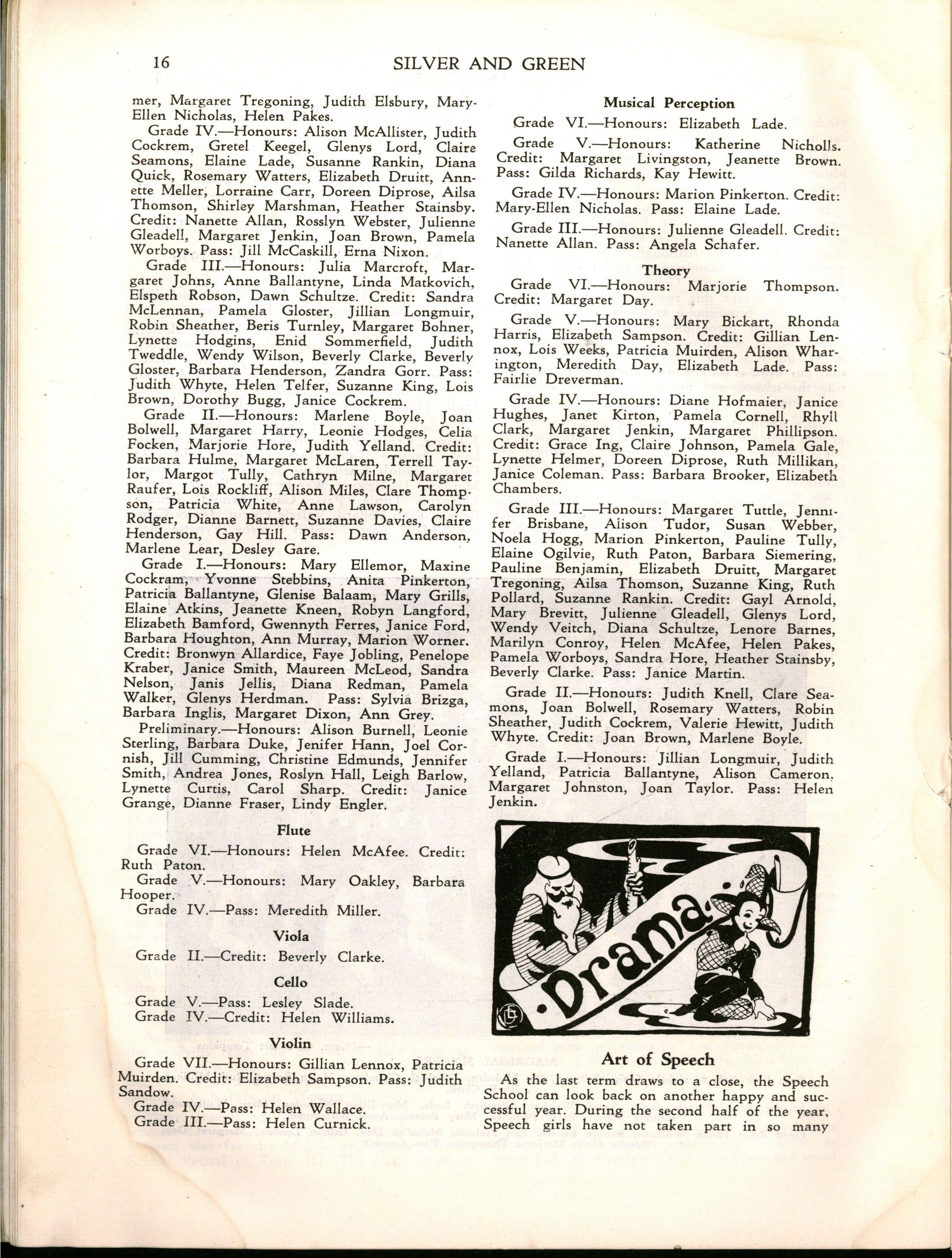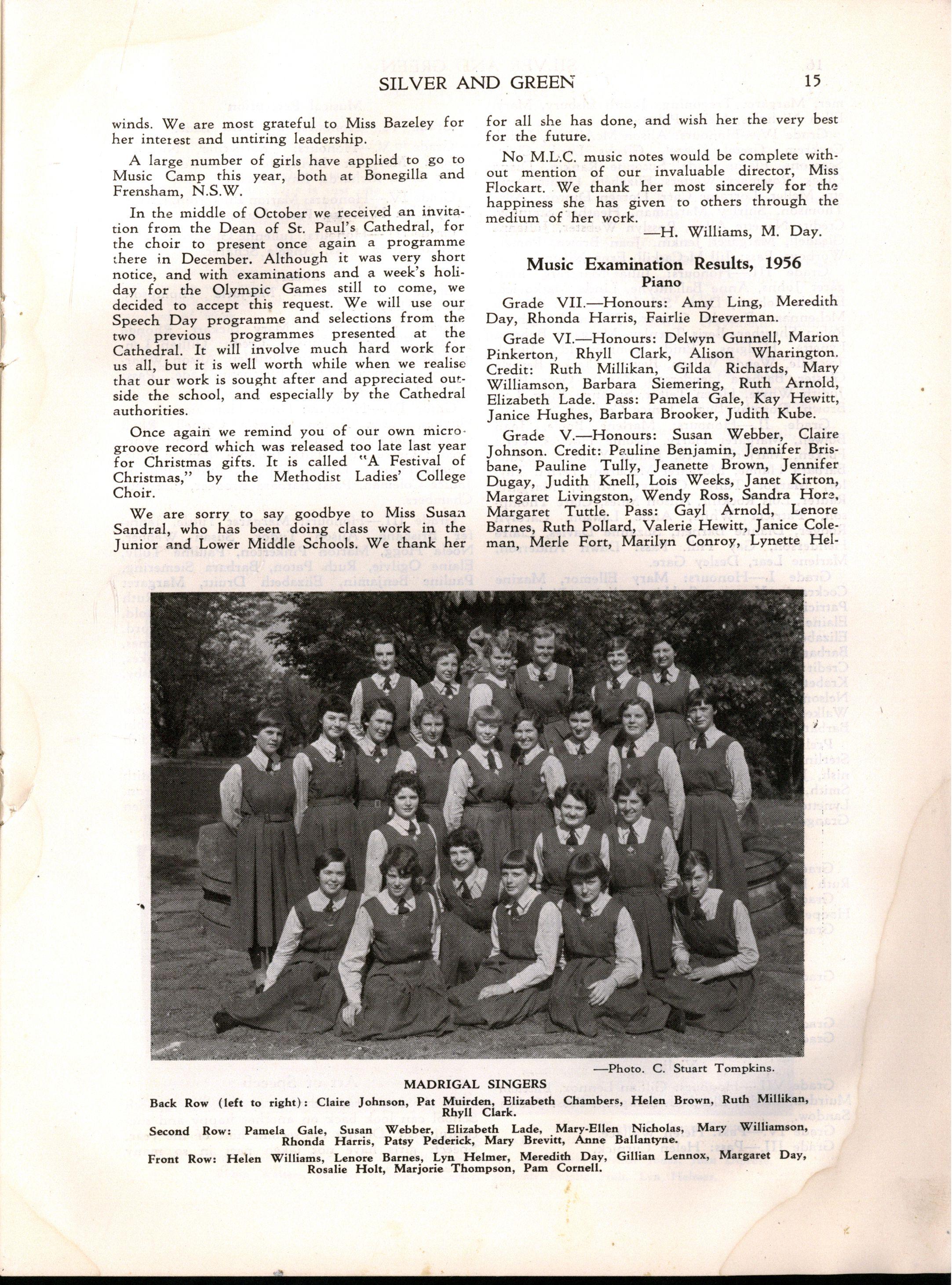 adjudicated at the School's annual music scholarship tests, some House Music Contests, and assisted the Music Department in many ways, in addition to providing a Violin Scholarship for a number of years She was the first Music Director at the Elsternwick Branch