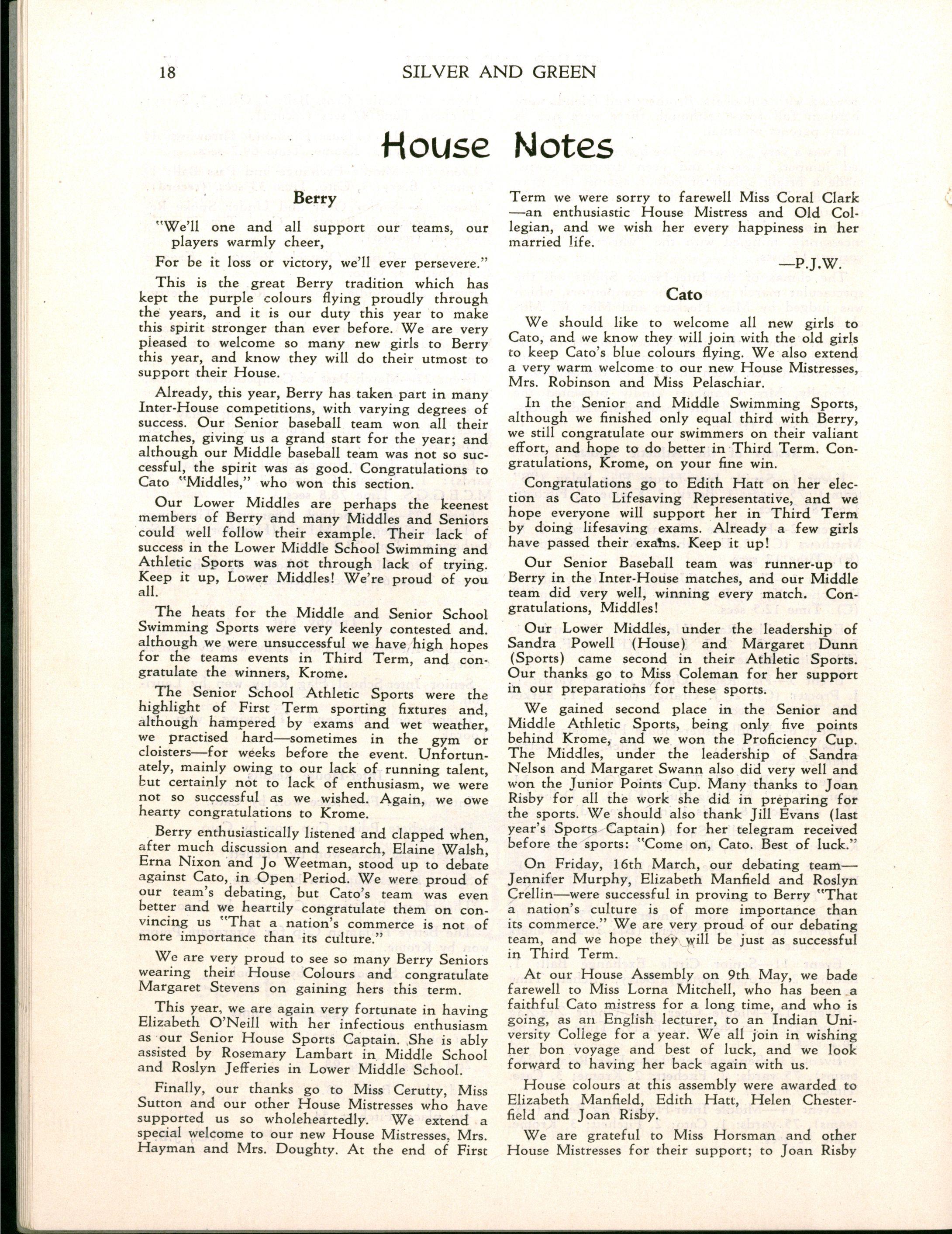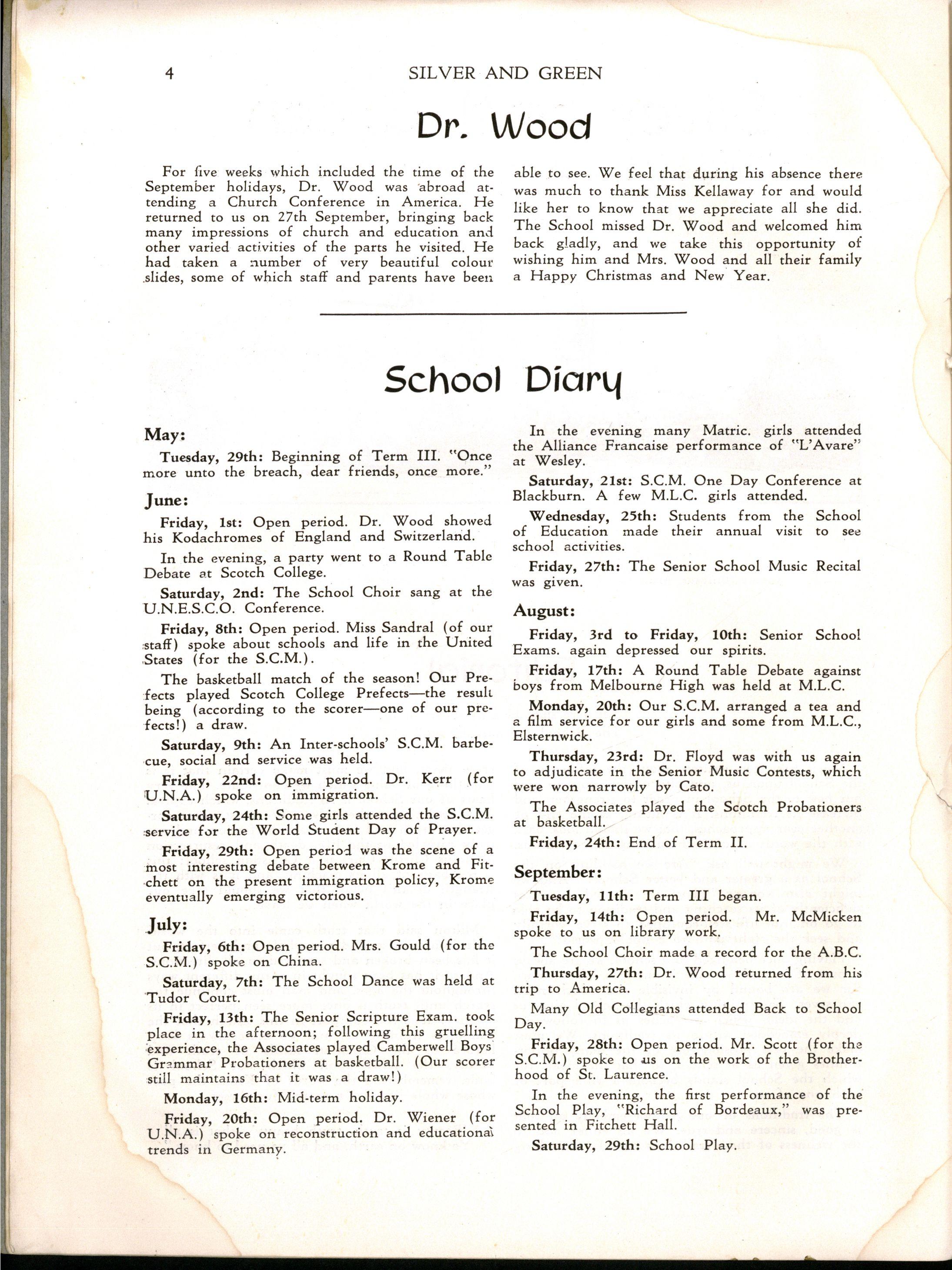 At the end of First Term, we were sorry to say "au revoir" to Miss Lorna Mitchell, M.A., Dip.Ed, Senior English Mistress, who has taught at the school for fourteen years Miss Mitchell will be overseas for a year lecturing at the Madras Women's Christian University College W e are greatly indebted to her for all she has done for the English departments of the school She has done much to make our Shakespeare Day celebrations an important part of the school year, and we are most grateful for the help and advice which she has so competently given to the Magazine Committee for a number of years The School wishes Miss Mitchell a very happy journey and an interesting time in India, and we are all looking forward to her return in 1957