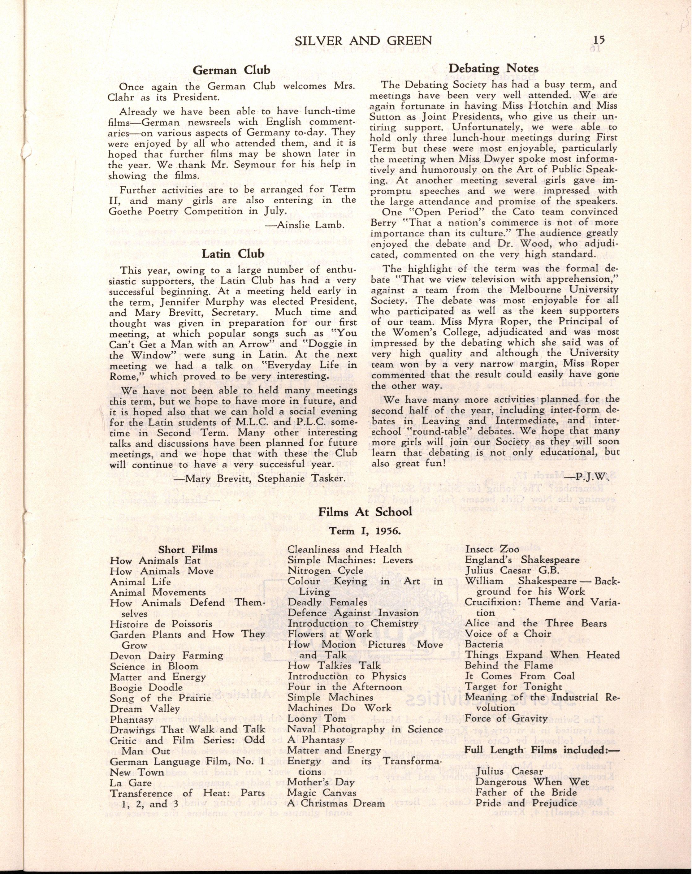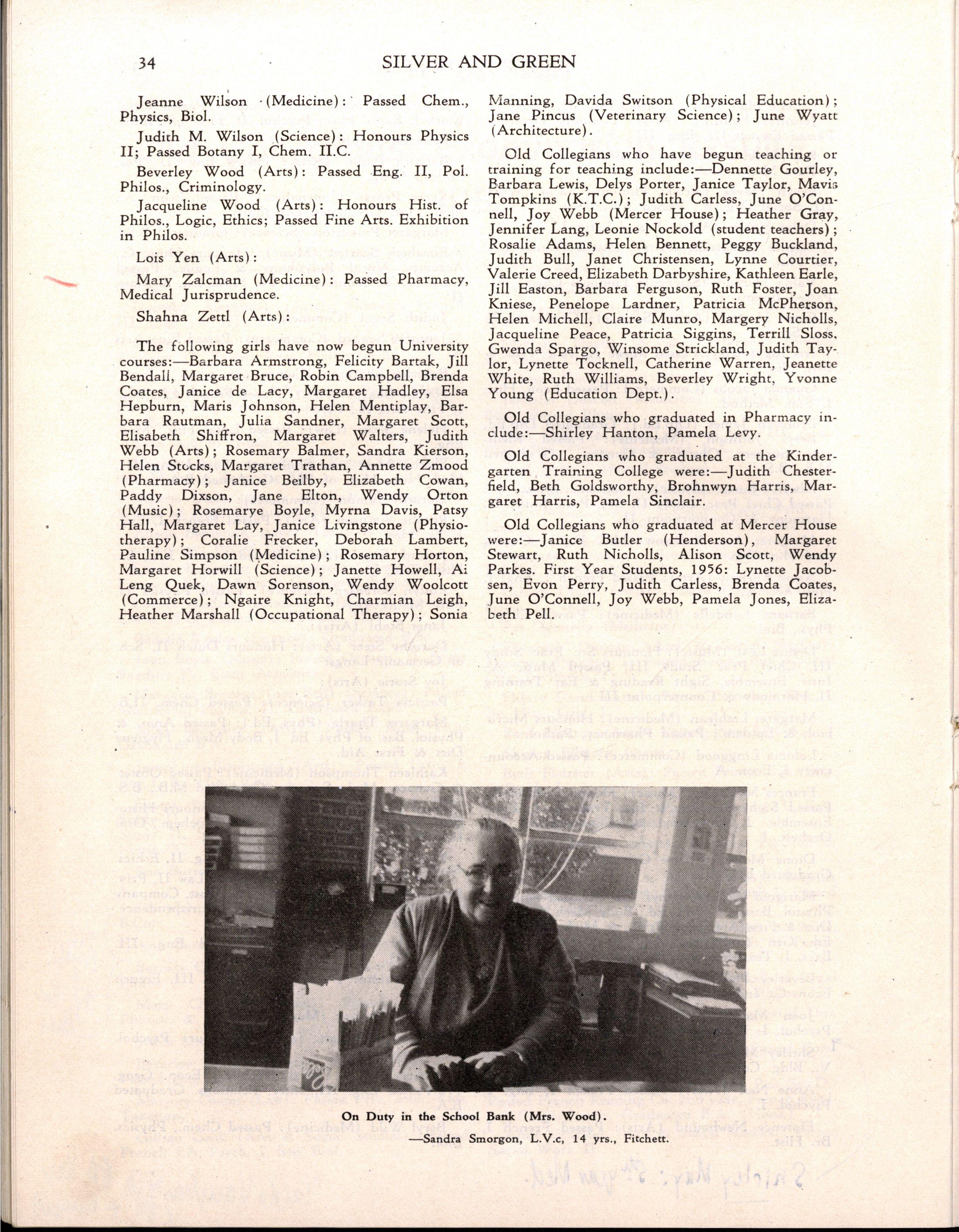 At the end of Term I, 1956, Mr H McKnight, B.Sc., left to become Lecturer at Mercer House; a separate reference is made to his work at M.L C Miss Coral Clark (Old Collegian) also left at the end of Term I, after six years in the Business School