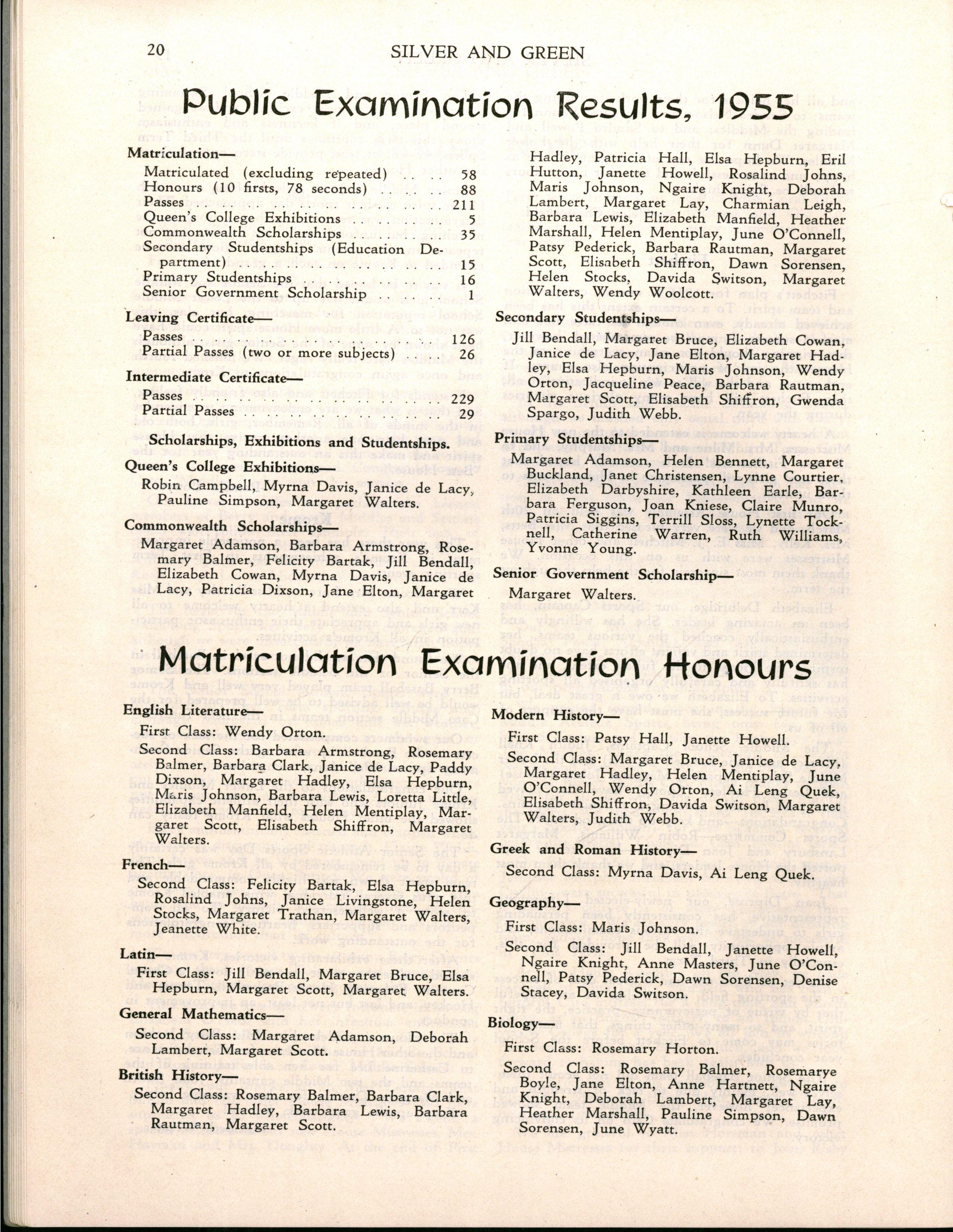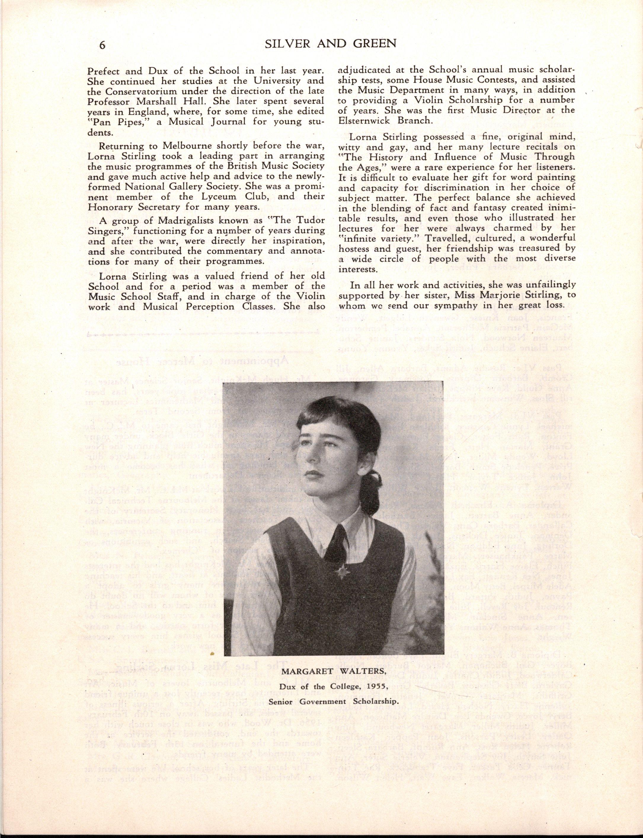 MARGARE T WALTERS , Dux of the College, 1955, Senior Government Scholarship