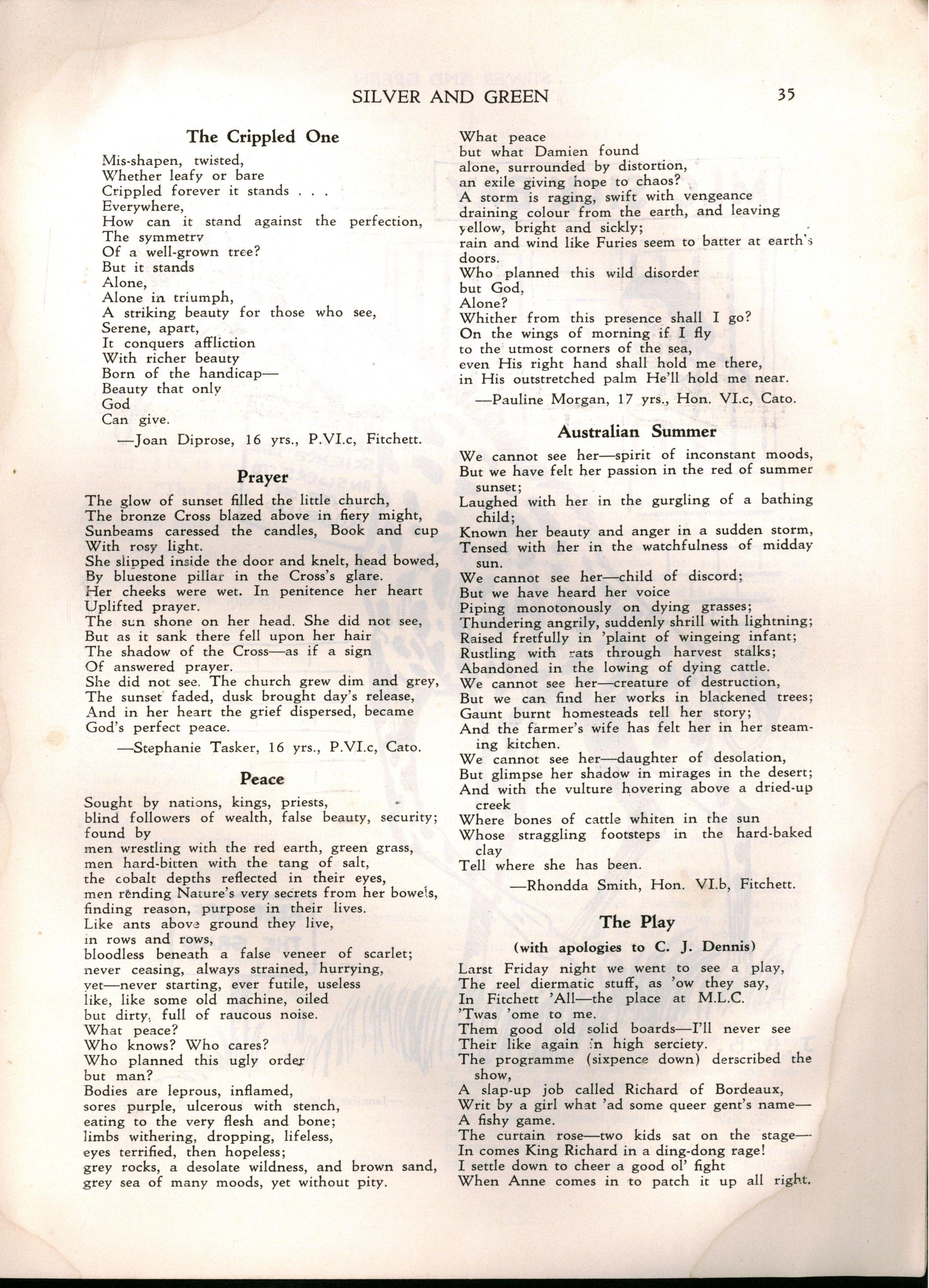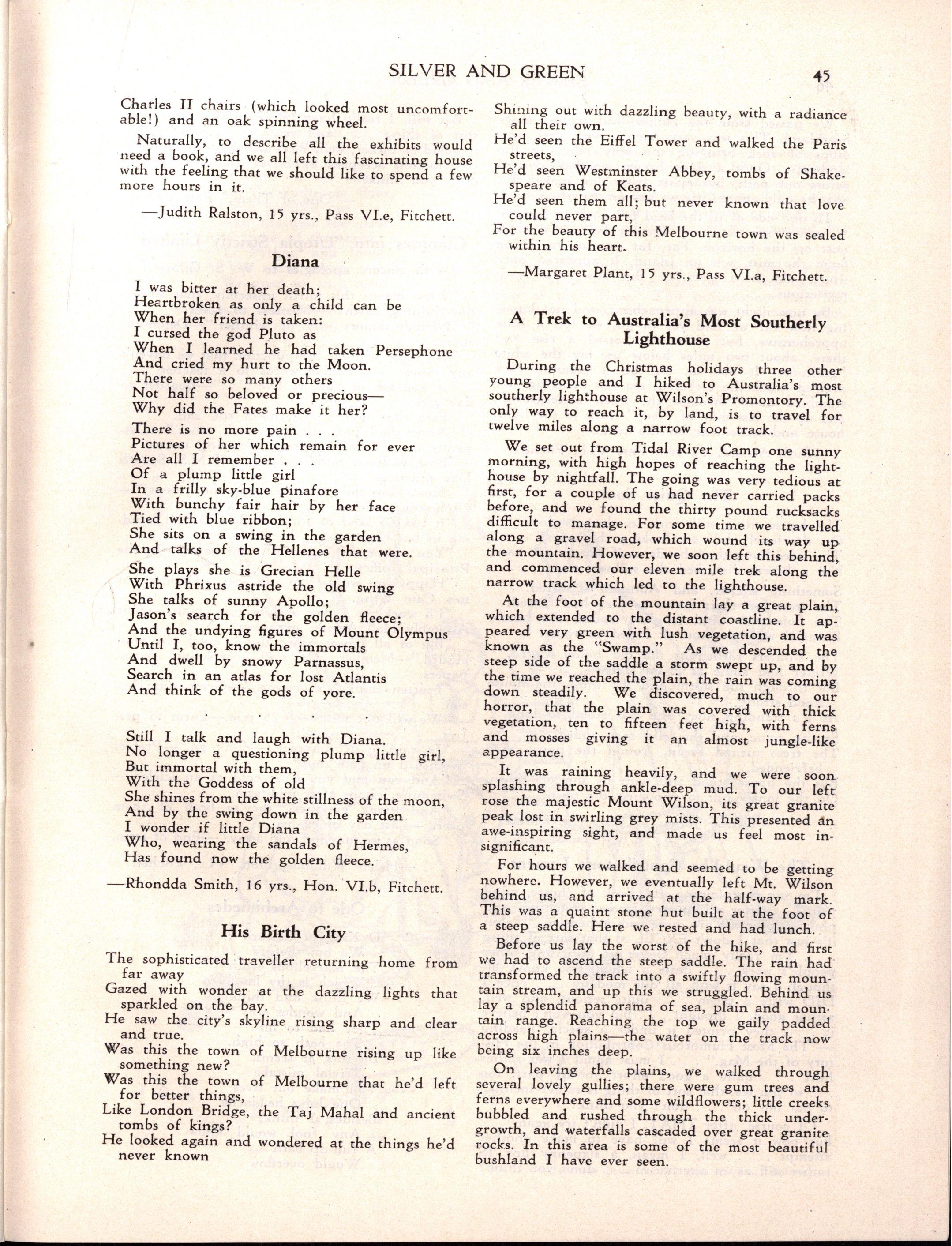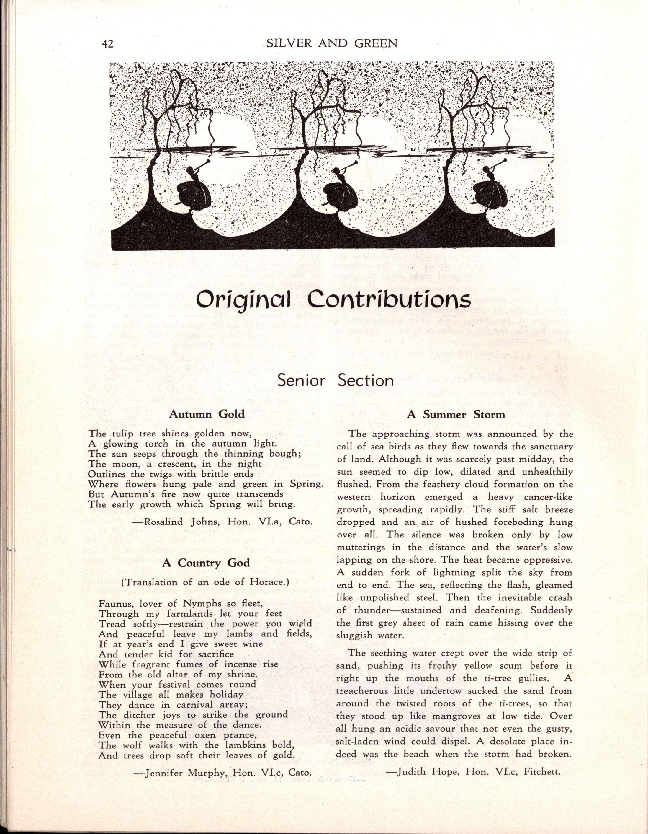 Prefect and Dux of the School in her last year She continued her studies at the University and the Conservatorium under the direction of the late Professor Marshall Hall. She later spent several years in England, where, for some time, she edited "Pan Pipes," a Musical Journal for young students.