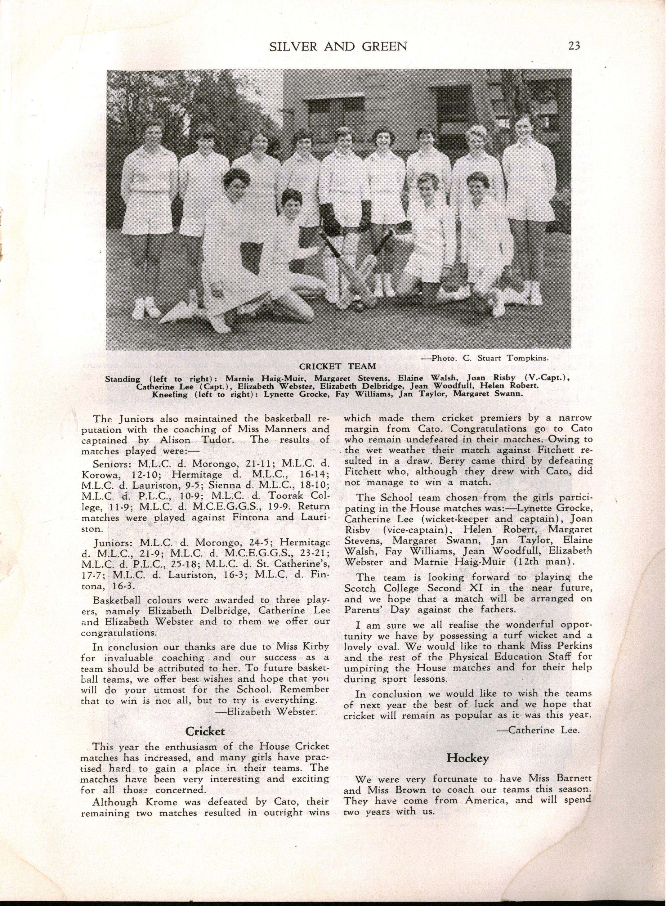 Hon. VI.c: Jill Bendall, Felicity Bartak, Janice Beilby, Rosemary Boyle, Judith Bull, Janet Christensen, Jane Elton, Glenise Dipple, Paddy Dixson, Anne Findlay, Coralie Freckie, Patsy Hall, Jeanette Howell, Sonia Manning, Sandra Kierson, Deborah Lambert, Margaret Lay, Charmian Leigh, Loretta Little, Roberta Littlejohns, Eve McLennan, Heather Marshall, Anne Masters, Jill Martin, June O'Connell, Jacqueline Peace, Delys Porter, Barbara Rautman, Felicity Robertson, Dawn Sorensen, Denise Stacey, Davida Switson, Mavis Tompkins, Jeanette White, Wendy Woolcott, Annette Zmood