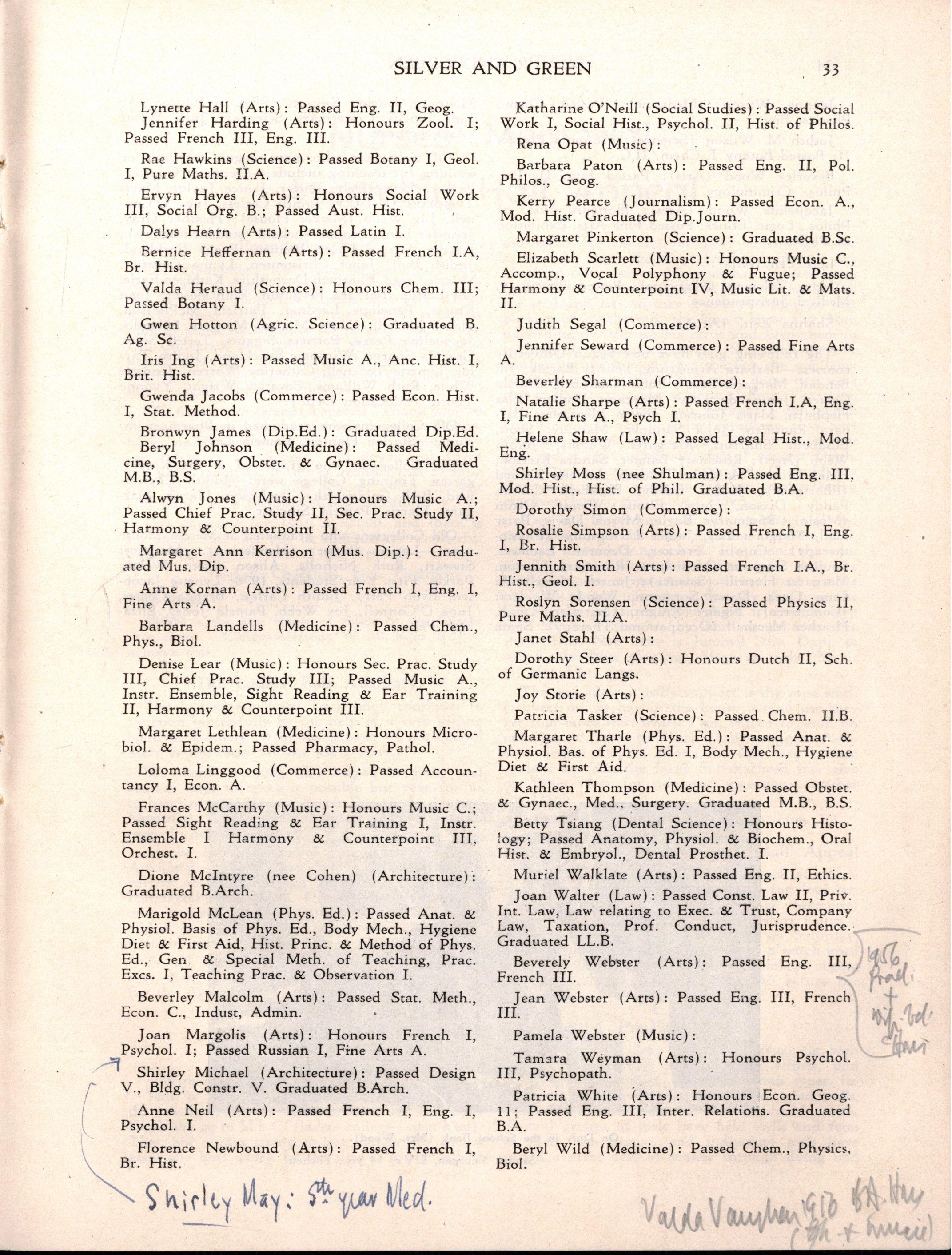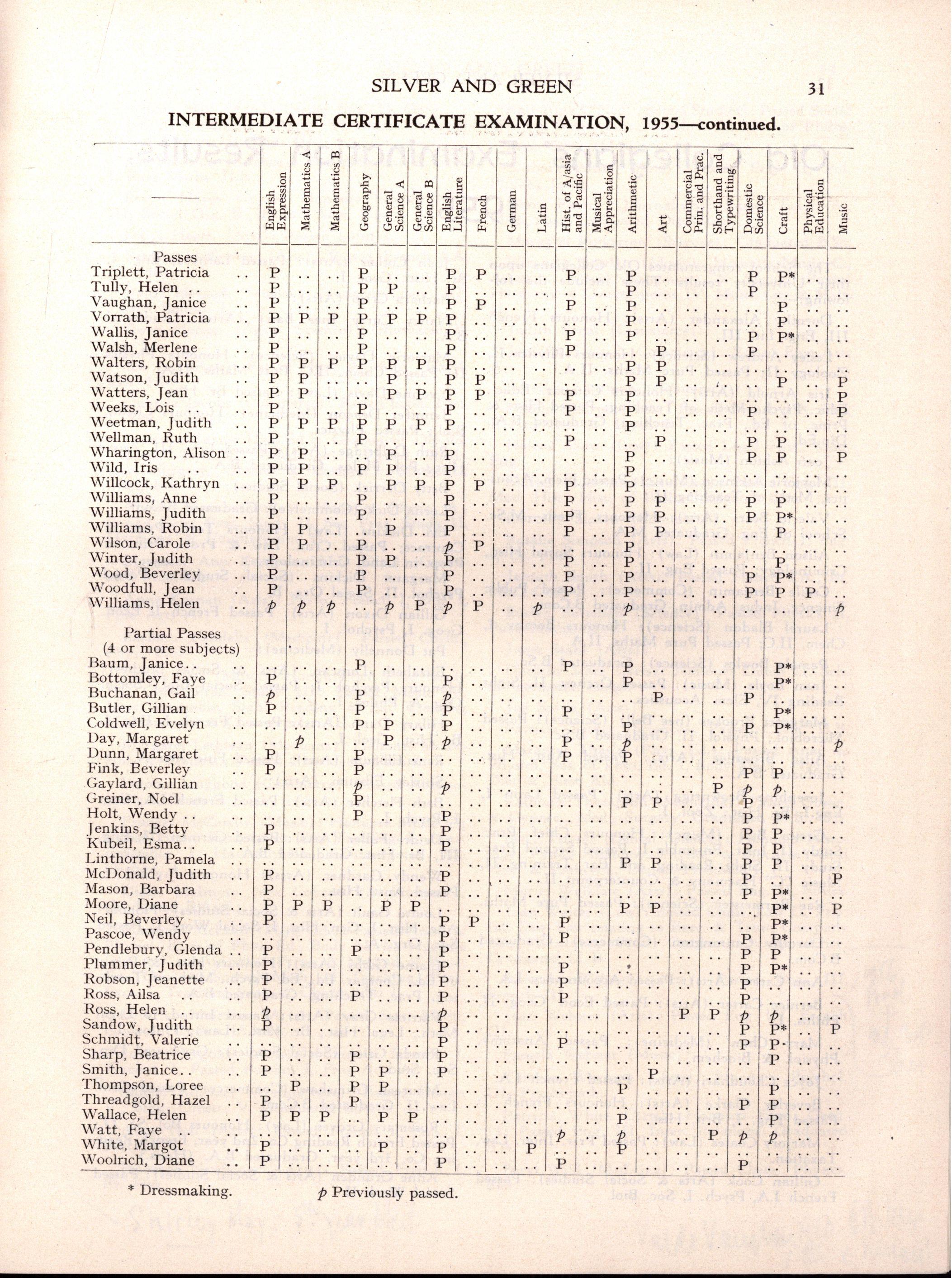 Diploma A : Elizabeth Adams, Rosalie Alexander, Anne Barrett, Janice Barthold, Berice Callander, Barbara Cant, Valerie Christian, Beryl Denman, Janice Dickens, Judith Dickie, Valma Dorling, June Eddison, Nancy Effick, Jill Evans, Maree Fankhauser, Margaret Fathers, Wendy Finch, Elaine Harris, Elizabeth Johnson, Dorothy Jones, Nea Kennett, Fay Lovell, Glenda McMillan, Adele Mispel, Betty Moon, Kathleen Oaten, Dianne Payne, Judith Pittard, Barbara Potter, Barbara Rentoul, Joy Revell, Julie Robertson, Diana Robson, Anne Sinclair, Marjorie Tharle, Janet Thomas, Anne Walton, Yvonne Wardle, Jeanette Weight